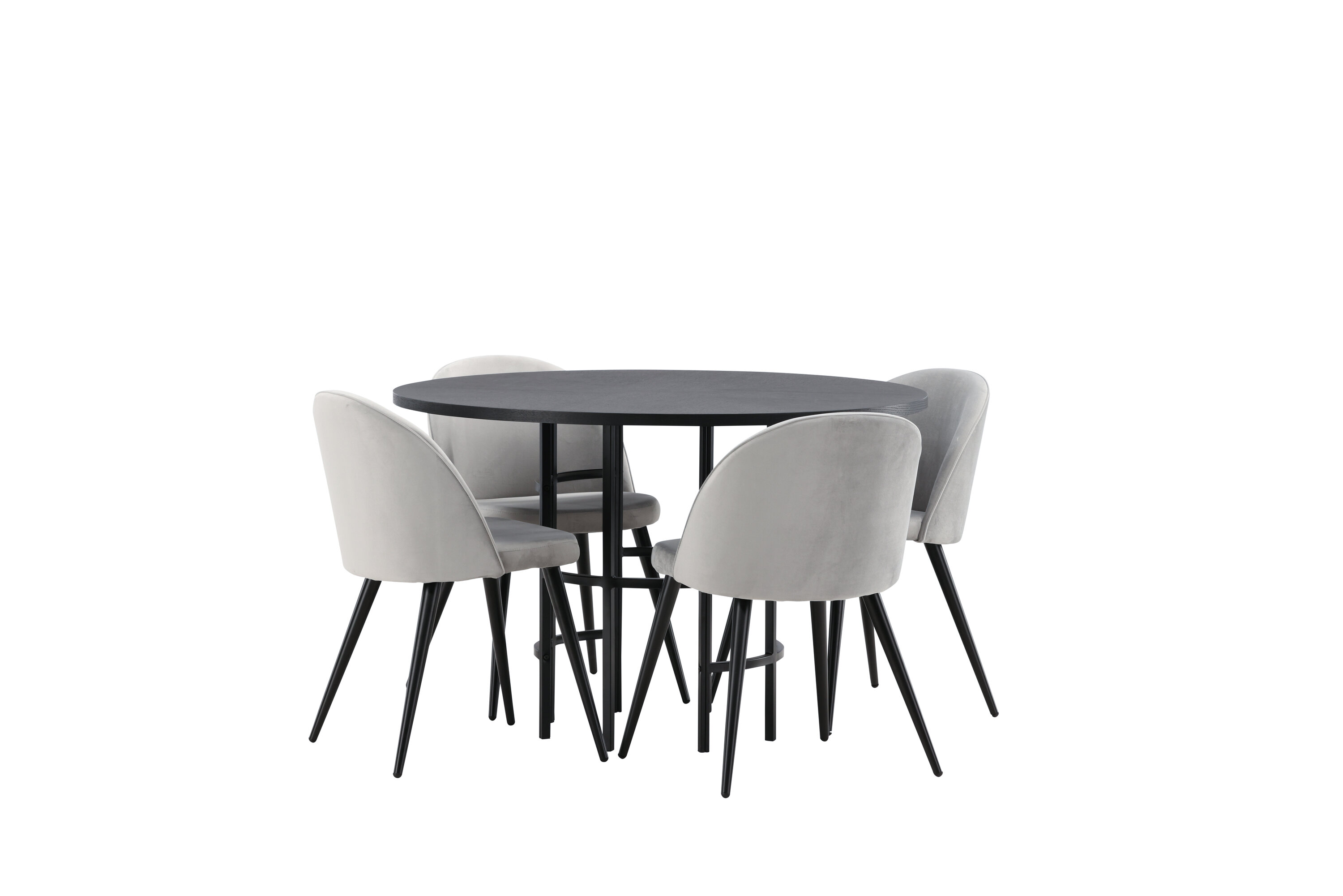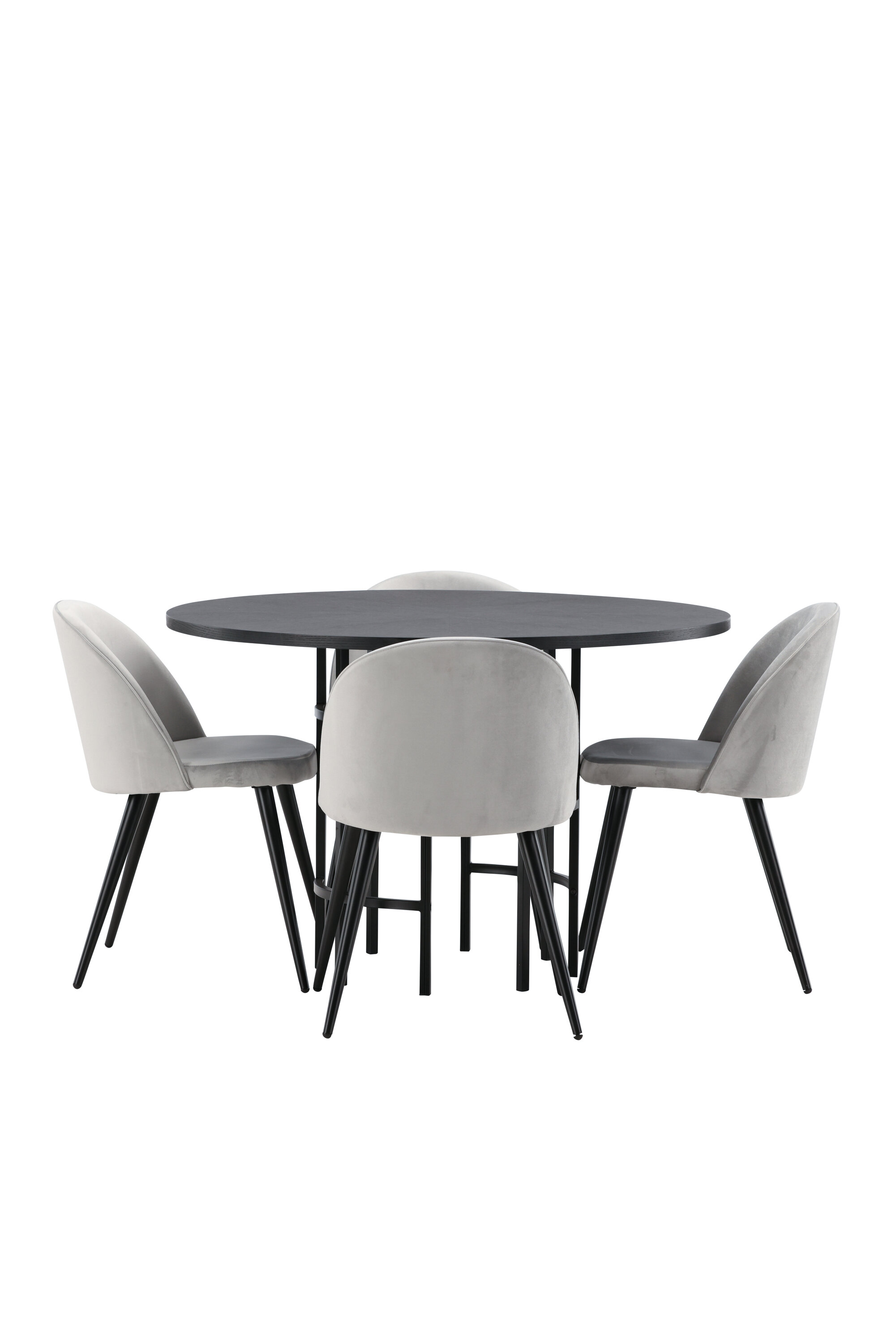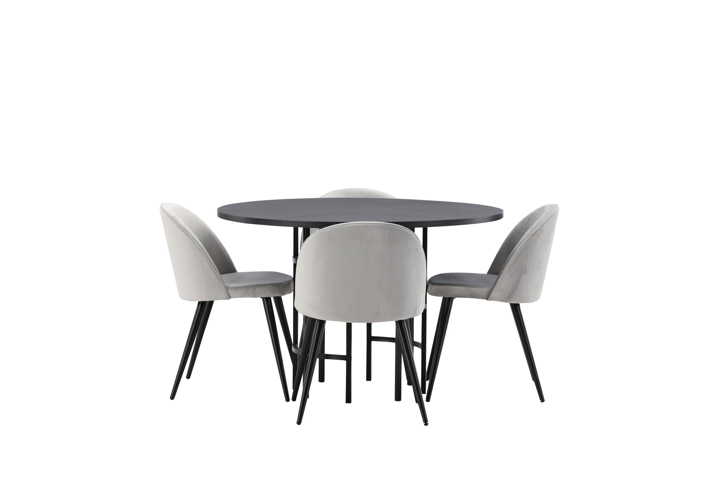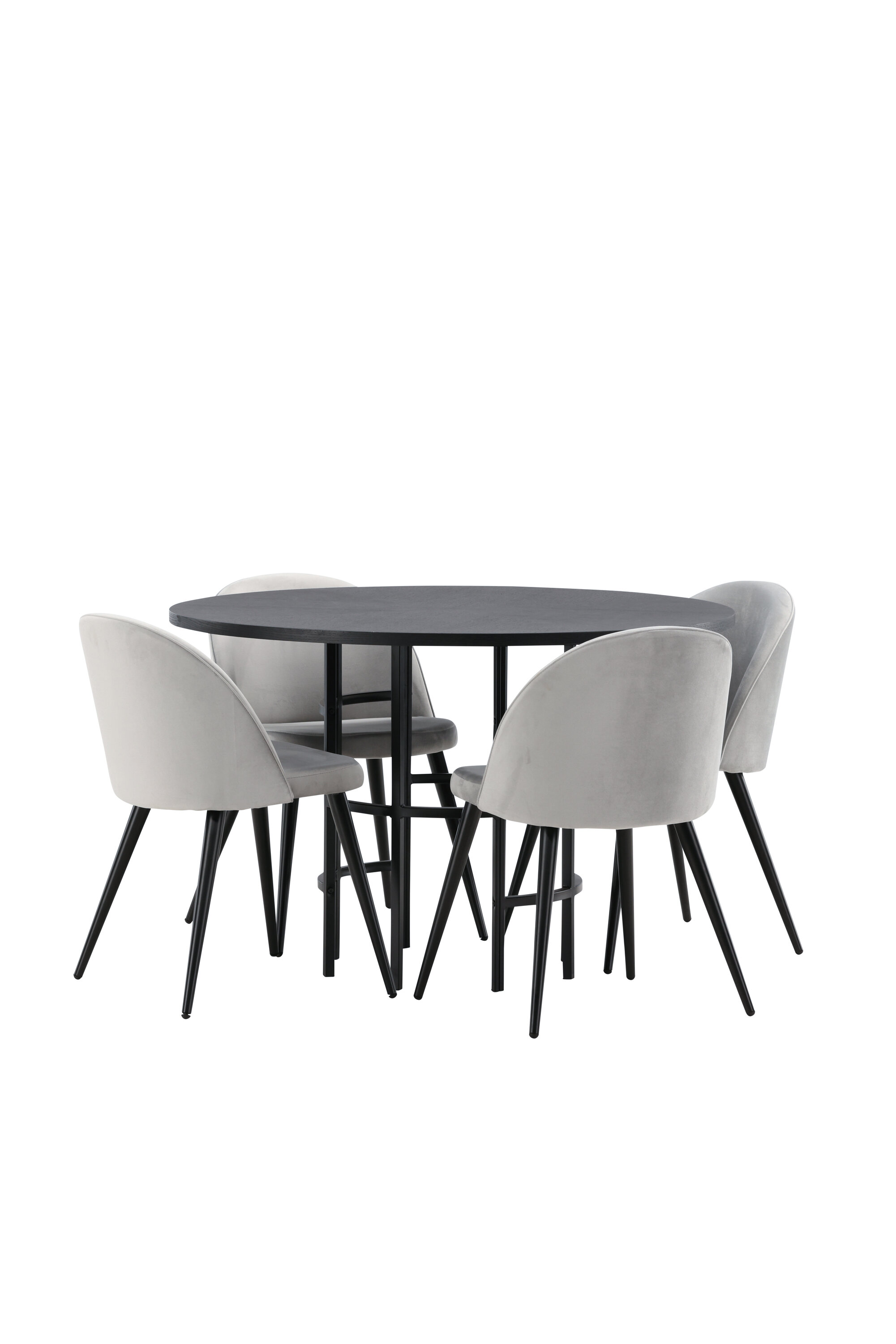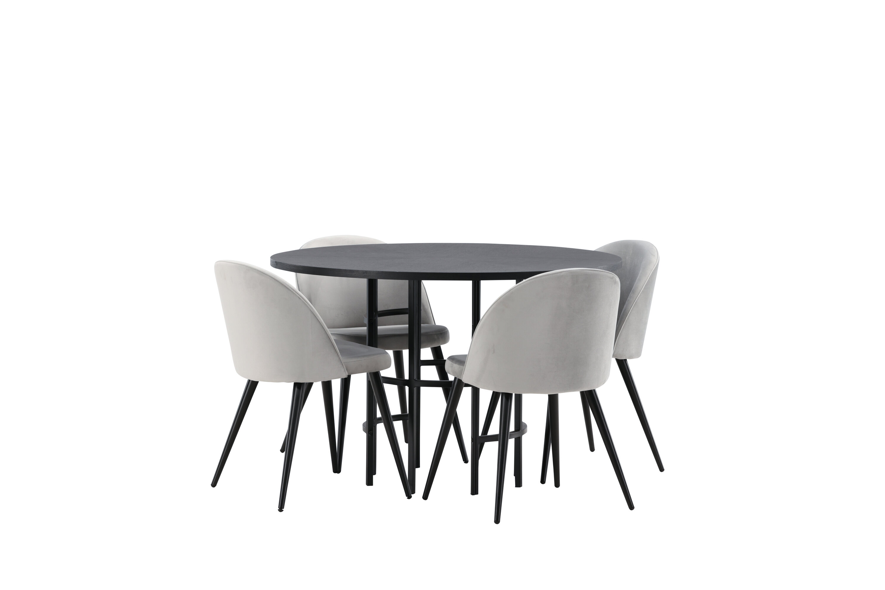 Kõigi õigete funktsioonidega söögigrupp! See trendikindel Copenhagen sarja söögilaud kuulub Furniture Fashion kollektsiooni ja sellel on tahmamust must lauaplaat spooniga MDF-plaadist ja dekoratiivne silindrikujuline mustast metallist alus. Siin koos moodsa Velvet sarja stiilse halli tooniga tooliga. Sellel söögitoolil on täielikult polsterdatud disain, pehmest sametkangast kergelt ümardatud seljatugi ja iste ning mustast pulbervärvitud metallist jalad. Loo võluv keskpunkt, et koguda perekond!