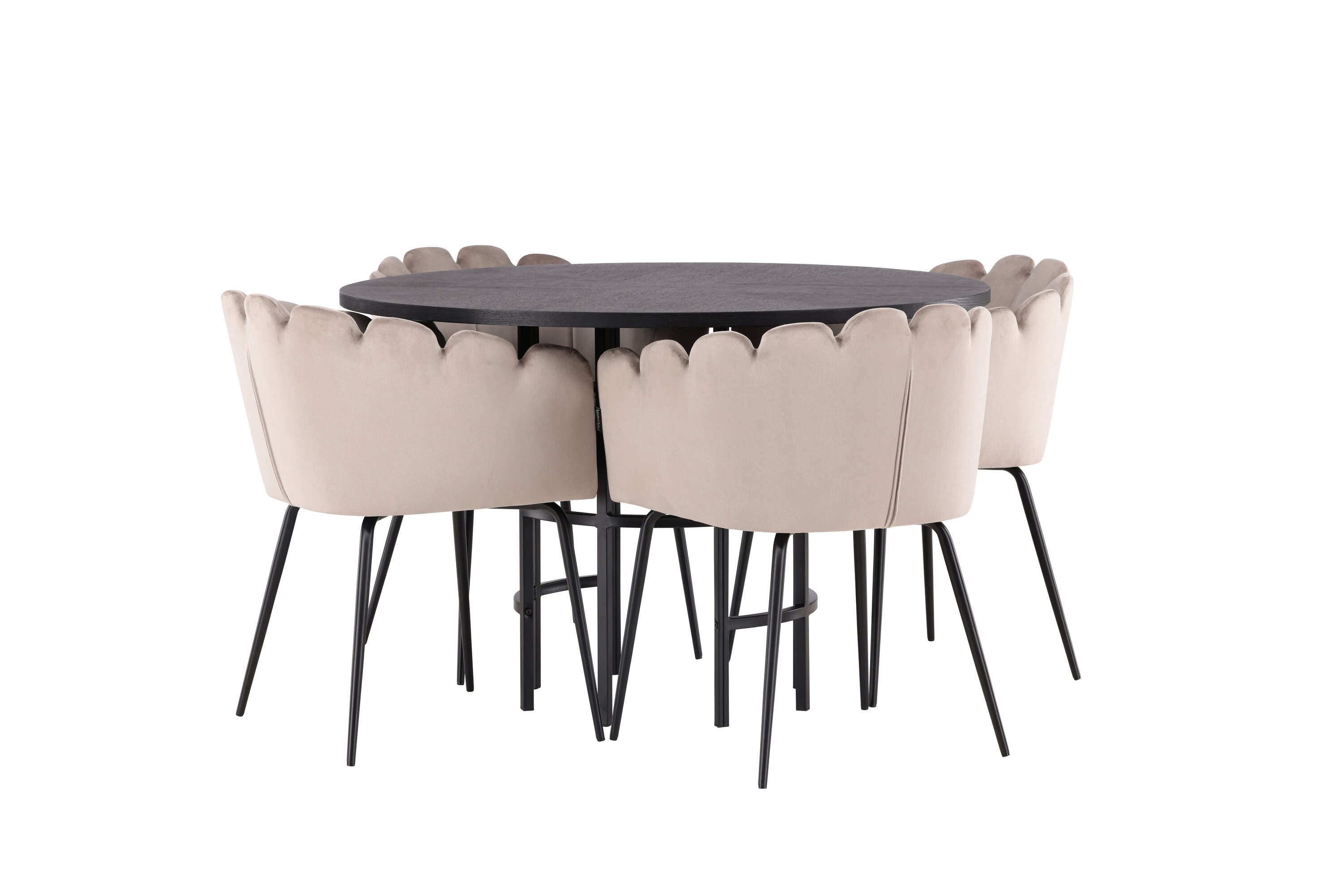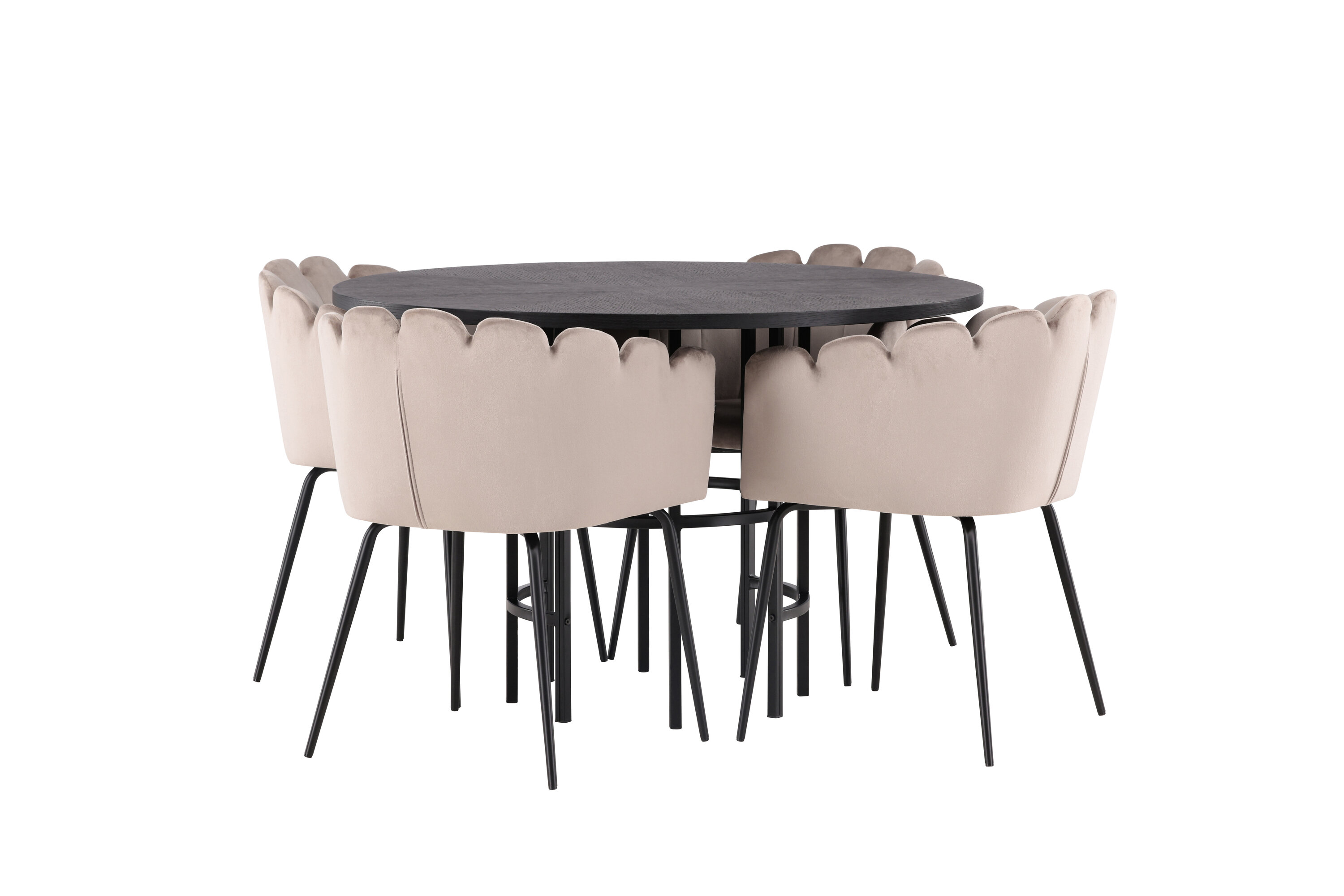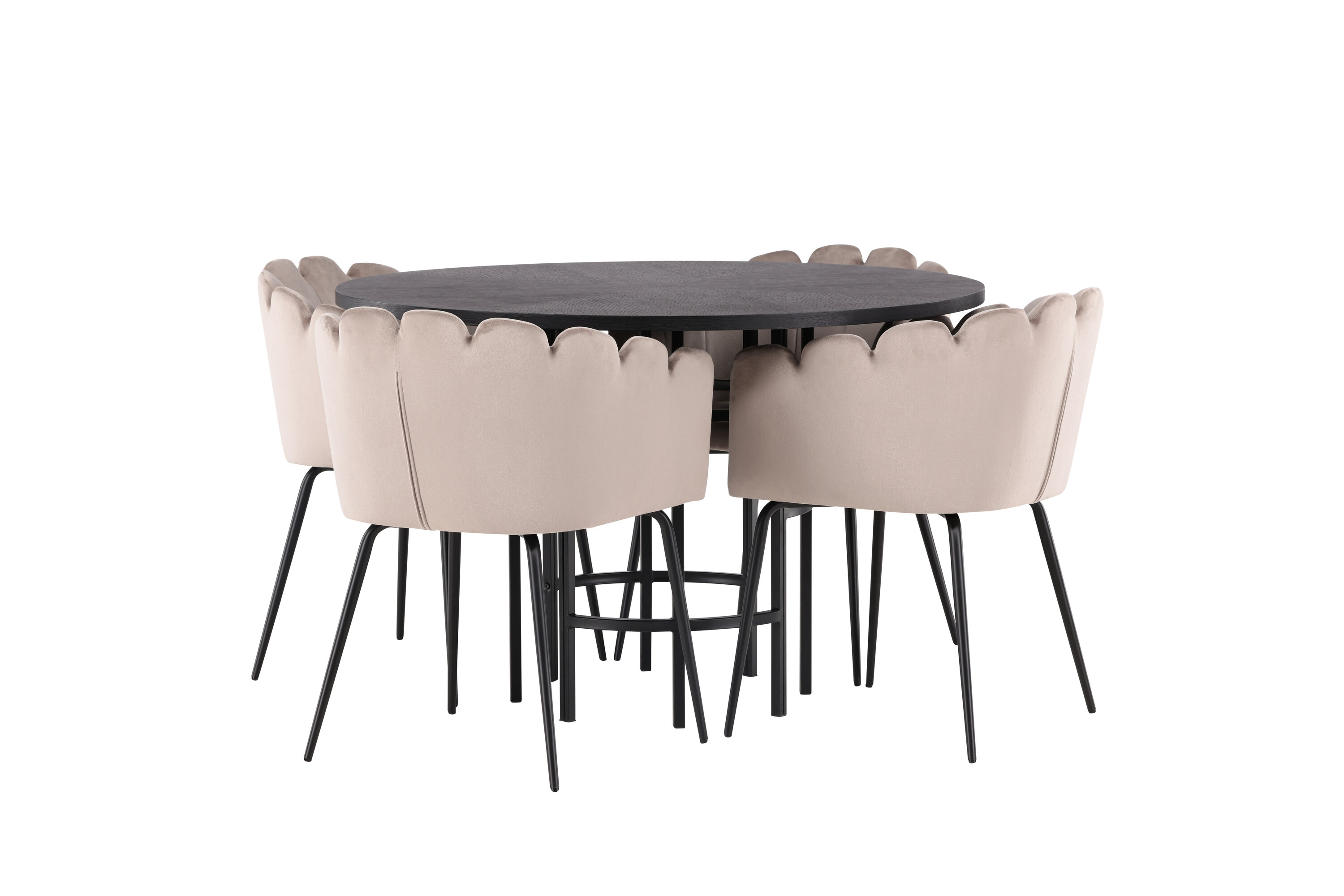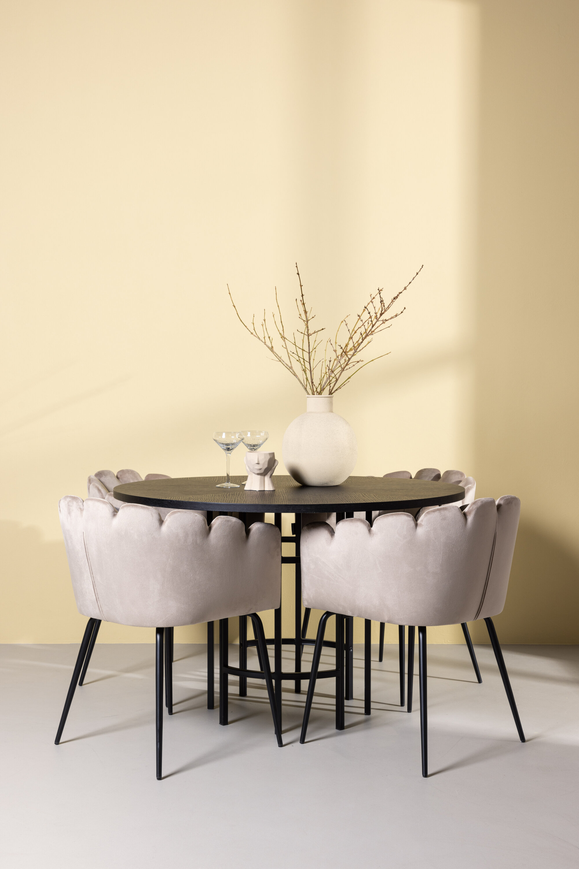 Hea tunne peaks olema koju tulla ja end sisse seada! Meie ümaral söögilaual Copenhagen on elegantne must MDF-plaadist lauaplaat ja mustast metallist dekoratiivne silindrikujuline alus. Siin koos meie populaarsete Limhamni söögitoolidega. Toolil on kutsuv disain dekoratiivse kestakujulise dekoratiivõmblustega seljatoe ja maitsekalt beežist sametkangast ümara istmega. Jalad on musta pulbervärvitud metallist. Vastupandamatu söögigrupp! Laua mõõdud: 115 cm.