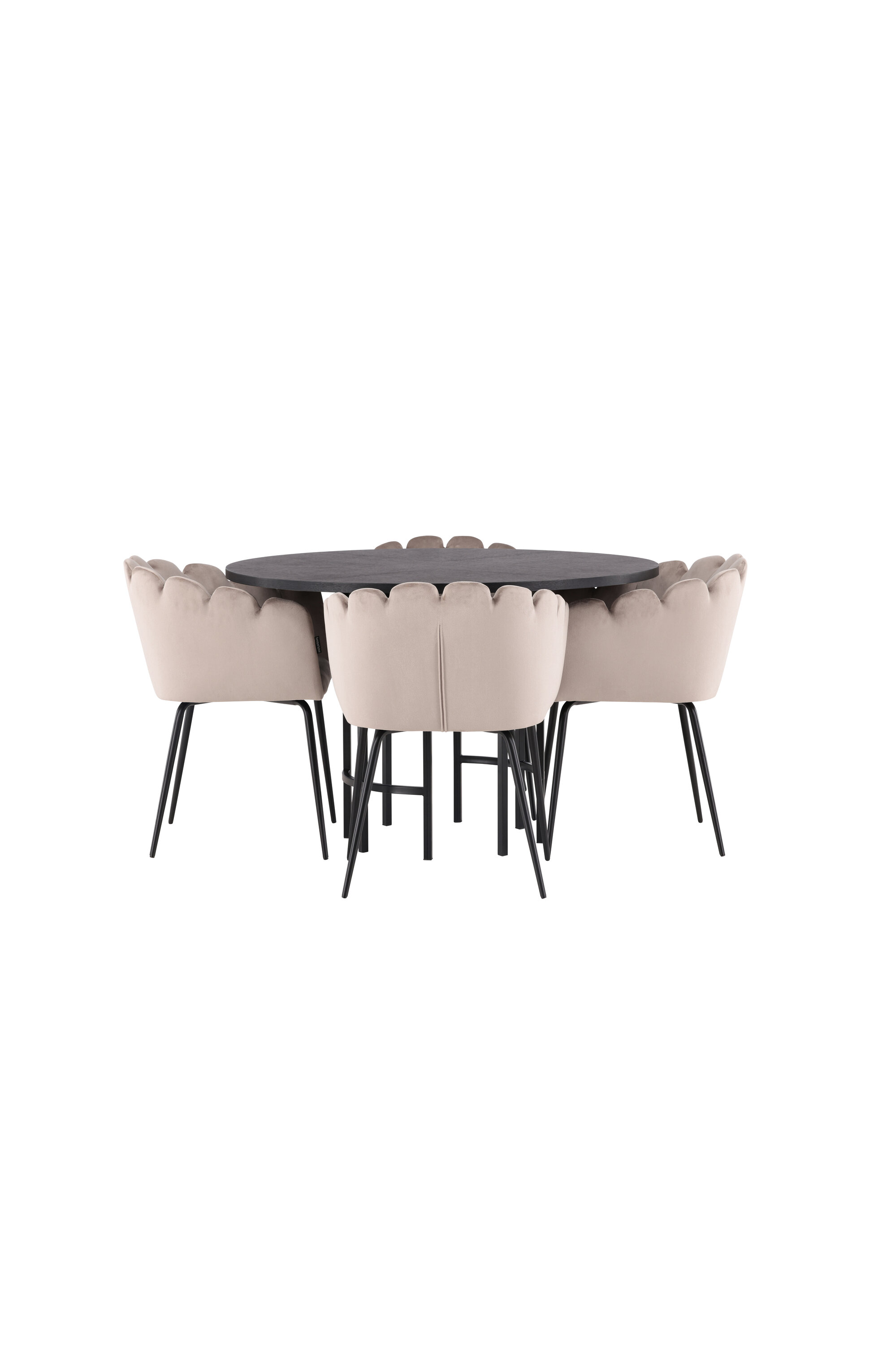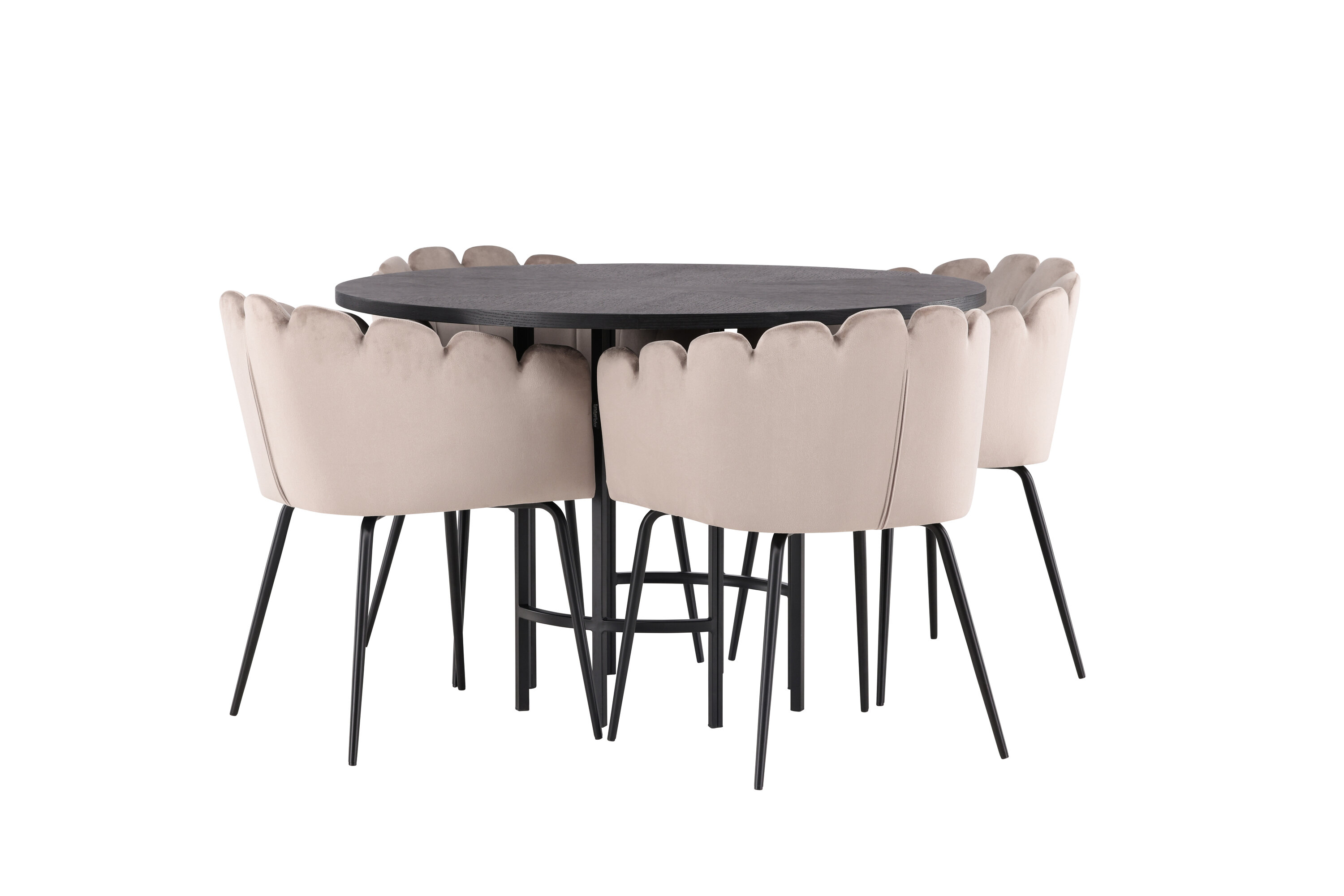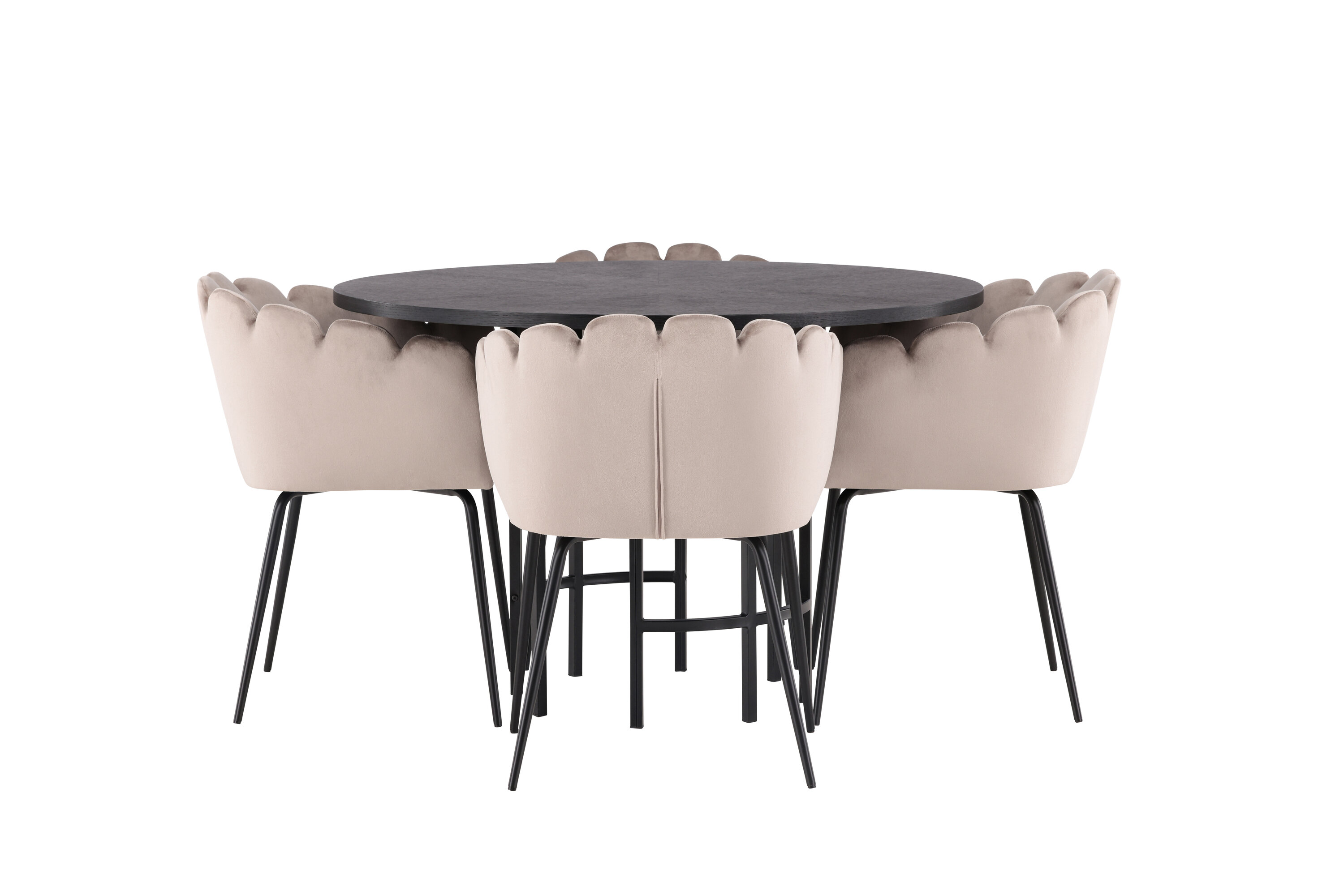 Hea tunne peaks olema koju tulla ja end sisse seada! Meie ümaral söögilaual Copenhagen on elegantne must MDF-plaadist lauaplaat ja mustast metallist dekoratiivne silindrikujuline alus. Siin koos meie populaarsete Limhamni söögitoolidega. Toolil on kutsuv disain dekoratiivse kestakujulise dekoratiivõmblustega seljatoe ja maitsekalt beežist sametkangast ümara istmega. Jalad on musta pulbervärvitud metallist. Vastupandamatu söögigrupp! Laua mõõdud: 115 cm.