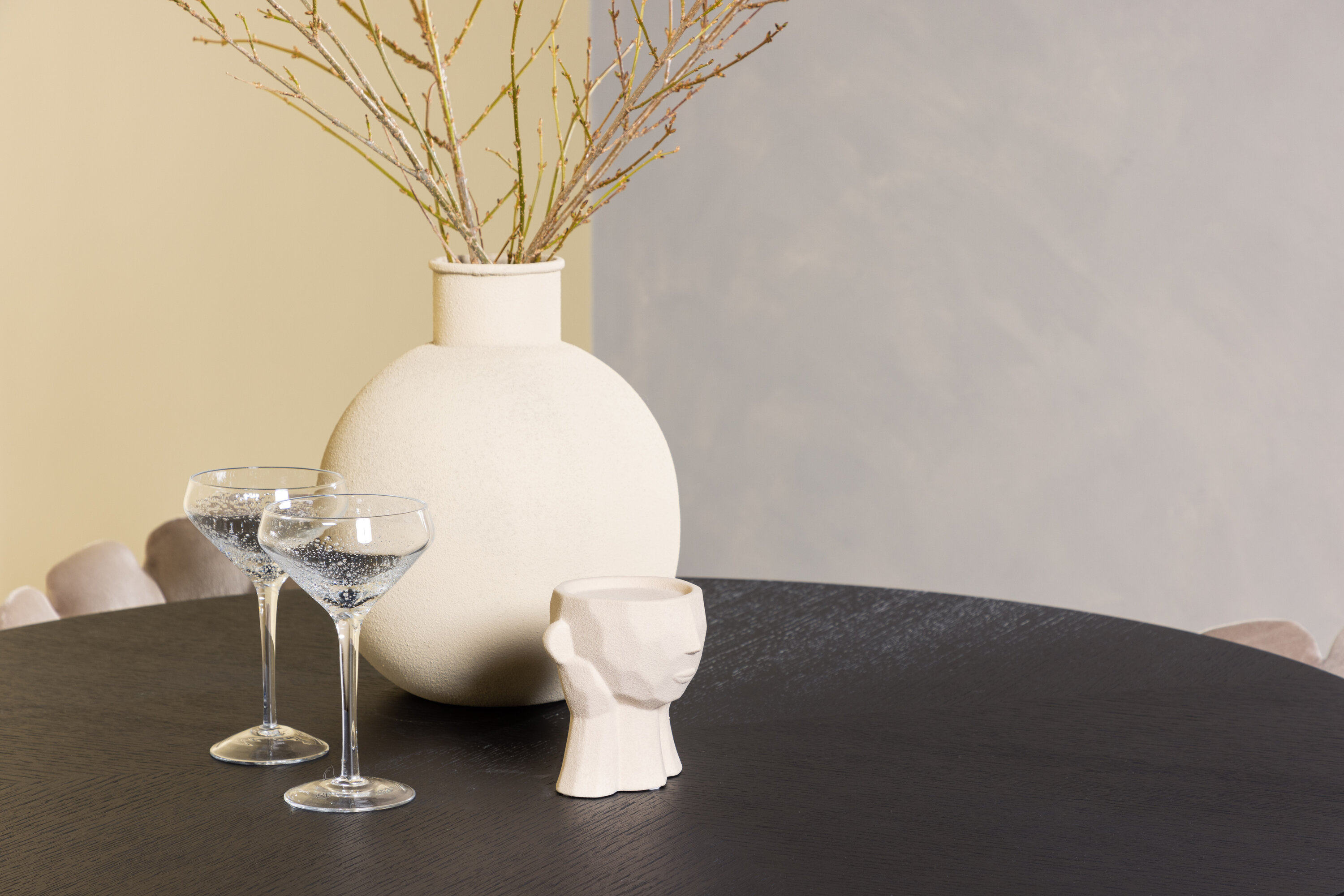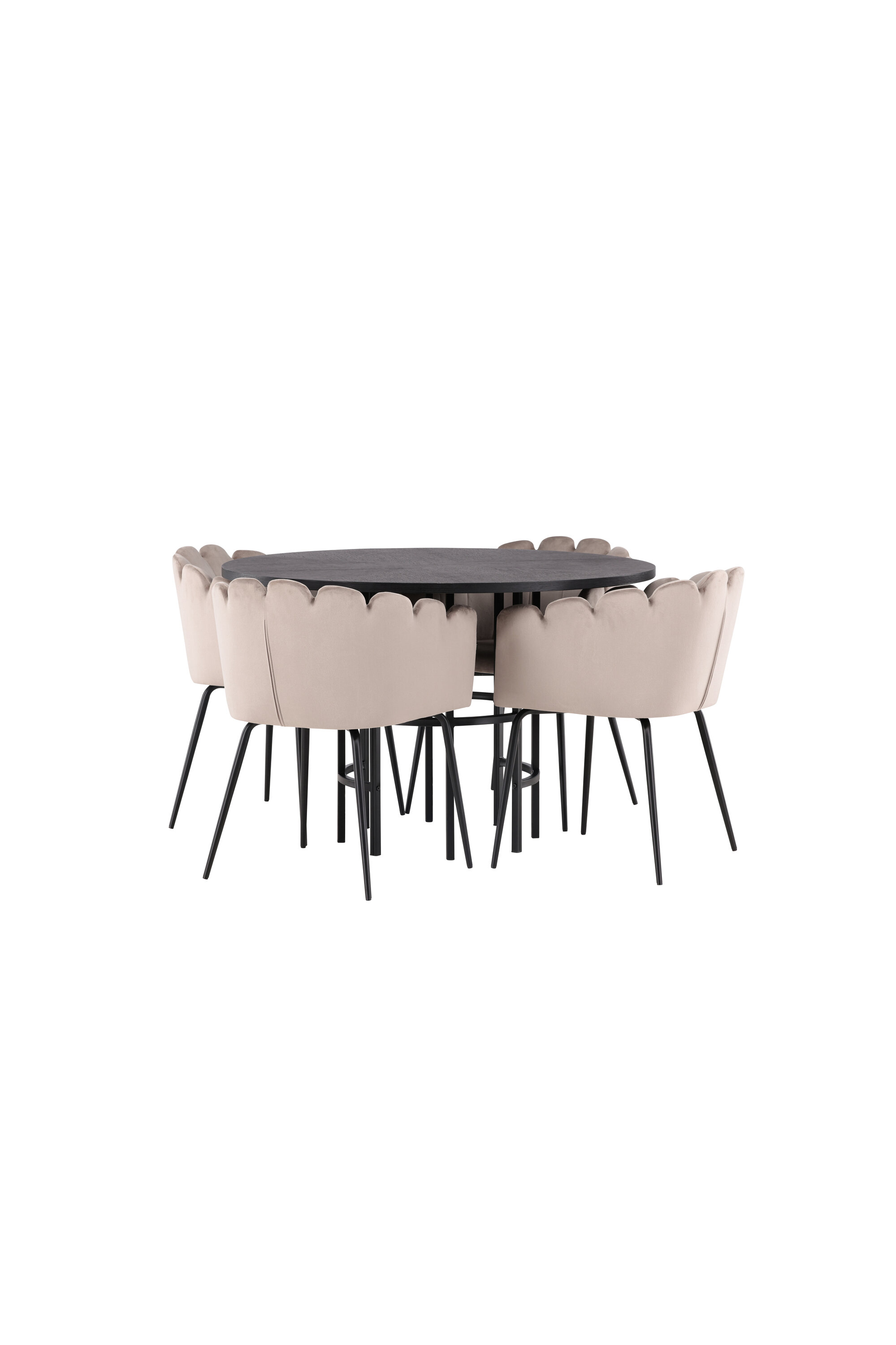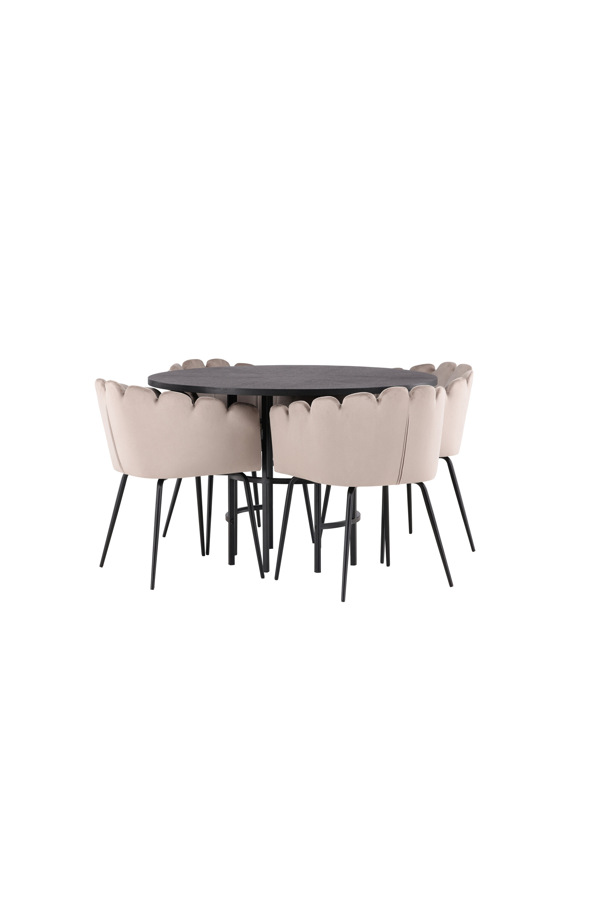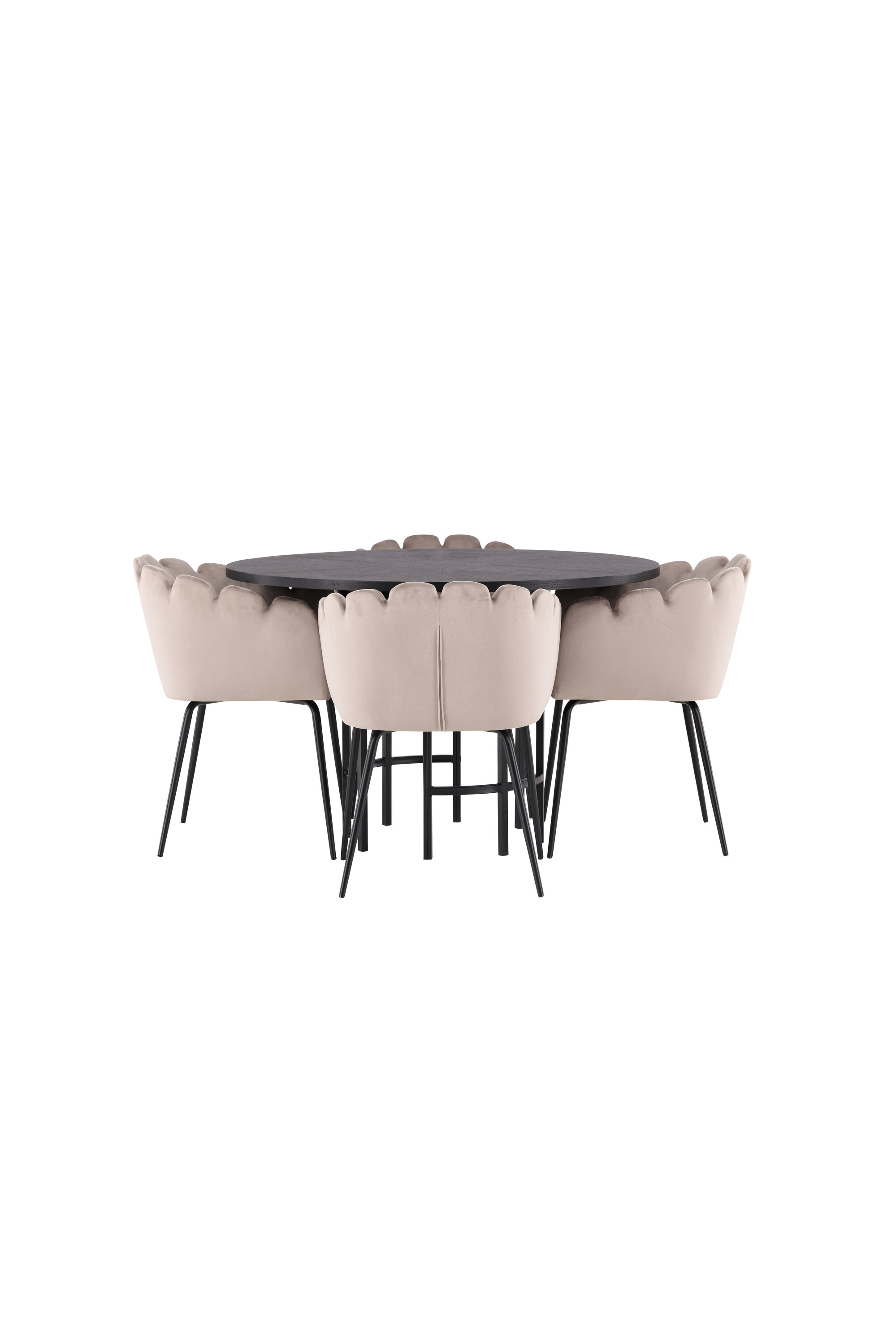 Hea tunne peaks olema koju tulla ja end sisse seada! Meie ümaral söögilaual Copenhagen on elegantne must MDF-plaadist lauaplaat ja mustast metallist dekoratiivne silindrikujuline alus. Siin koos meie populaarsete Limhamni söögitoolidega. Toolil on kutsuv disain dekoratiivse kestakujulise dekoratiivõmblustega seljatoe ja maitsekalt beežist sametkangast ümara istmega. Jalad on musta pulbervärvitud metallist. Vastupandamatu söögigrupp! Laua mõõdud: 115 cm.