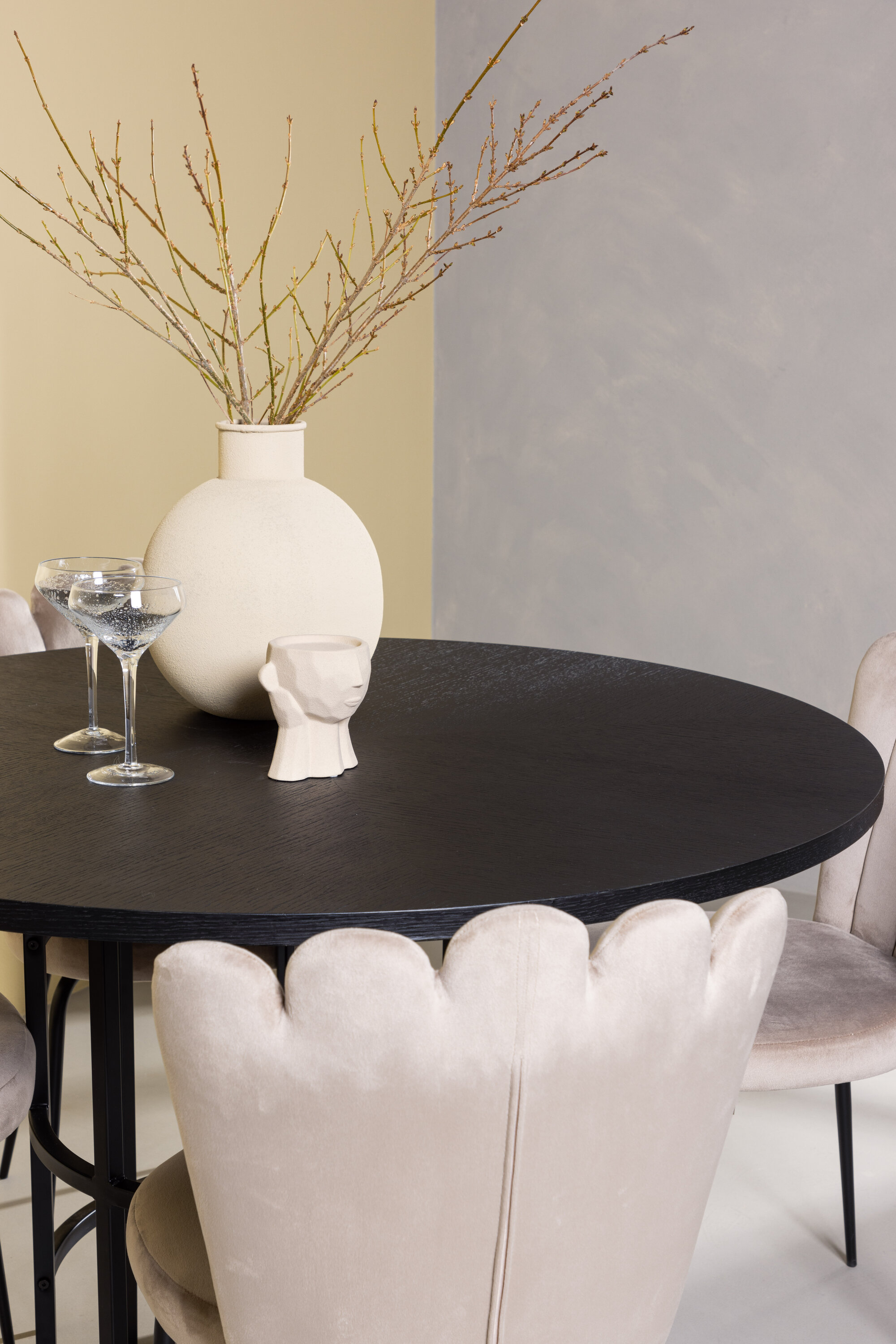 Sama võluv kui mugav! Meie ümaral söögilaual Copenhagen on elegantne must MDF-plaadist lauaplaat ja mustast metallist dekoratiivne silindrikujuline alus. Siin moodsas kombinatsioonis Limhamni sarja beežide söögitoolidega. Toolil on kutsuv disain dekoratiivse kestakujulise dekoratiivõmblustega seljatoe ja maitsekalt beežist sametkangast ümara istmega. Jalad on musta pulbervärvitud metallist. Siin soovite teie ja teie külalised jääda pikaks ajaks! Laua mõõdud: 115 cm.