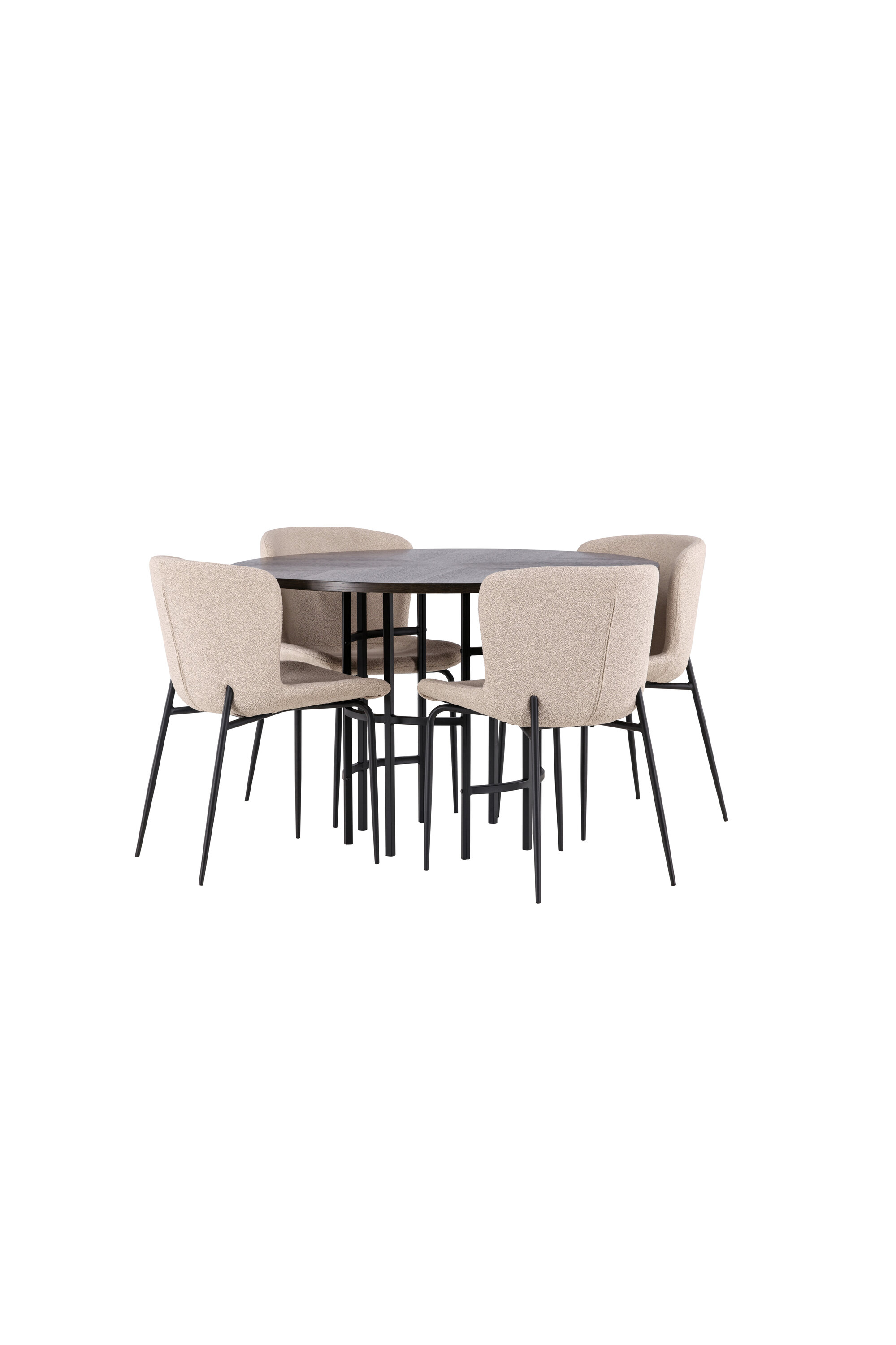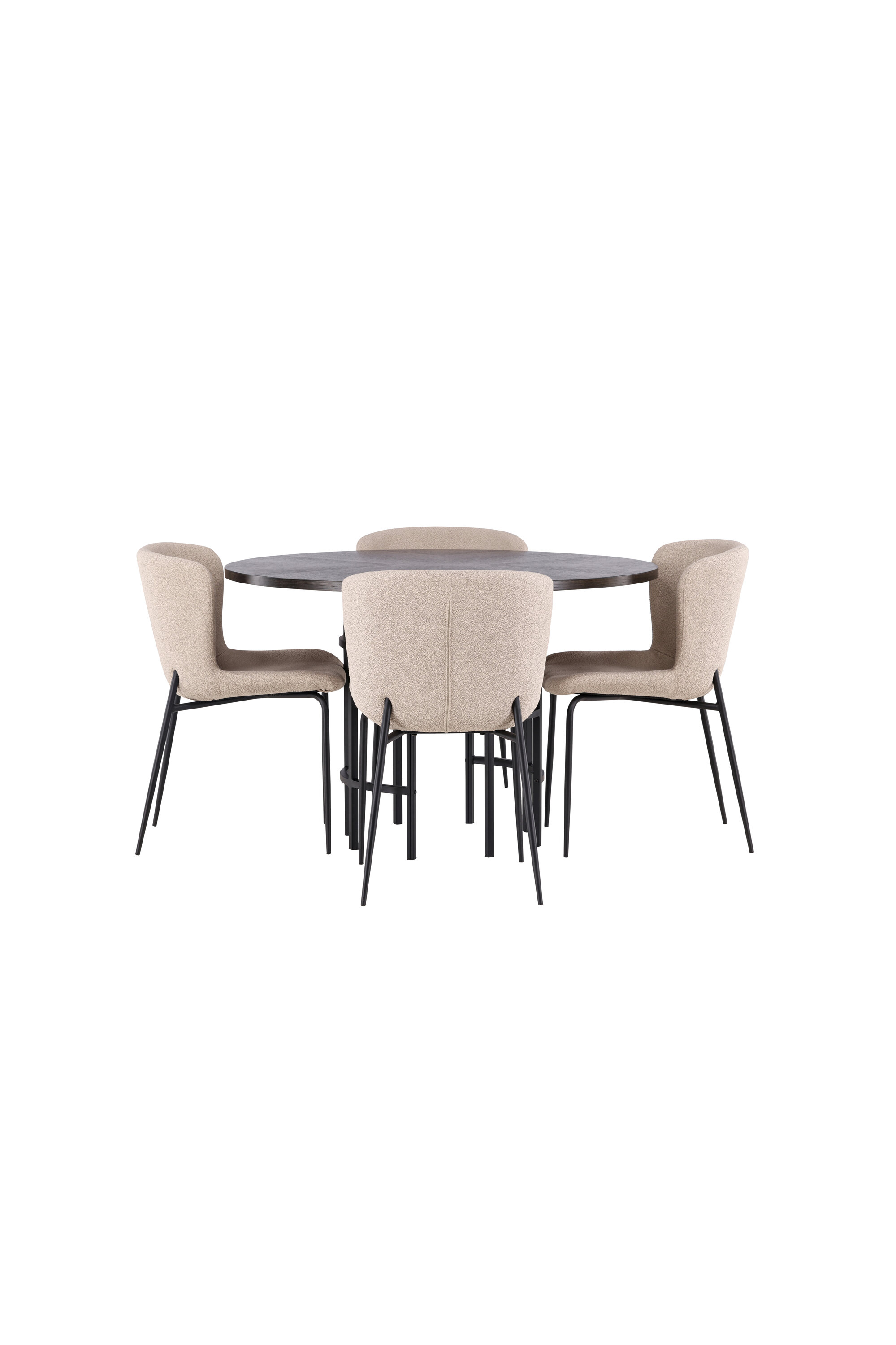 Söögigrupp, mis vastab kõigile teie soovidele! Meie ümmargusel söögilaual Copenhagen on ilus pruuni värvi spooniga MDF lauaplaat ja dekoratiivne silindrikujuline mustast metallist alus. Siin koos Modesto sarja moeteadlike söögitoolidega. Tool on täielikult polsterdatud beeži karvase kangaga ja stiilsed kitsad mustast metallist jalad. Kergelt ümar seljatugi ja polsterdatud istmepadi pakuvad lisamugavust ja pikendavad söögilaua ümber mõnusaid eineid. Sellest paremaks ei lähe! Laua mõõdud: 115 cm.