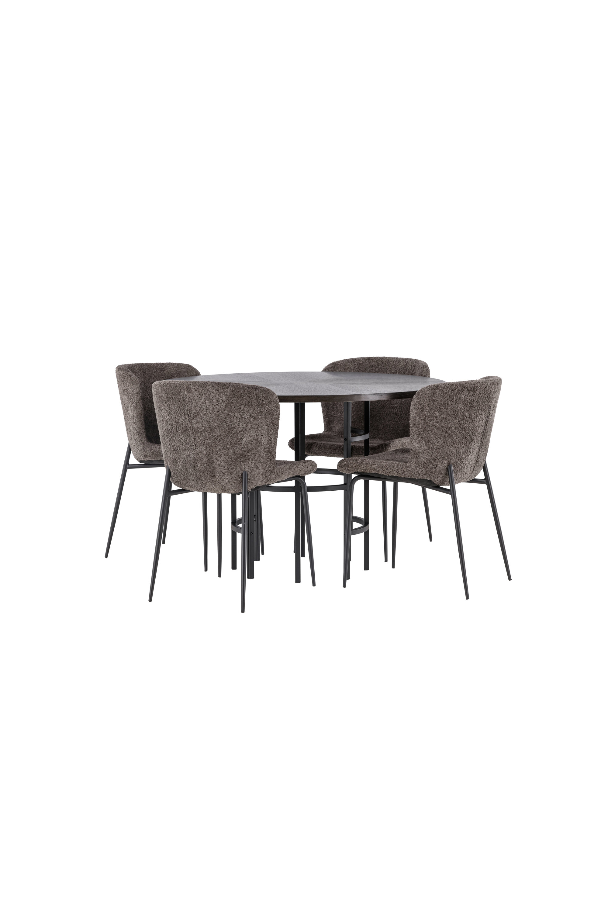 Söögigrupp, mis vastab kõigile teie soovidele! Meie ümmargusel söögilaual Copenhagen on ilus pruuni värvi spooniga MDF lauaplaat ja dekoratiivne silindrikujuline mustast metallist alus. Siin koos Modesto sarja moeteadlike söögitoolidega. Tool on täielikult polsterdatud halli karvase kangaga ja stiilsed kitsad mustast metallist jalad. Kergelt ümar seljatugi ja polsterdatud istmepadi pakuvad lisamugavust ja pikendavad söögilaua ümber mõnusaid eineid. Sellest paremaks ei lähe! Laua mõõdud: 115 cm.