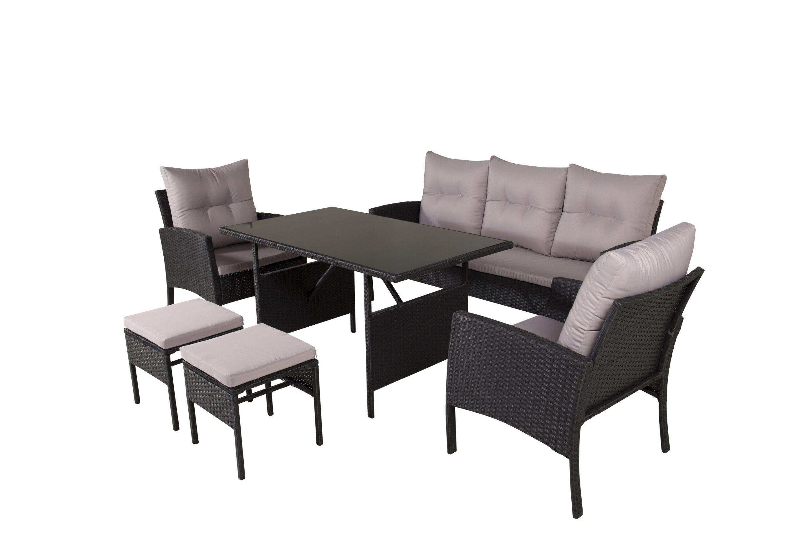 Knock loob teie terrassile kutsuva pilgupüüdja! Moodne mitmekülgne mustast kunstrotangist diivanirühm, mis sobib suurepäraselt nii rõdule kui õue. Diivanigrupp koosneb kolmekohalisest diivanist, kahest raamiga tugitoolist ja kahest alusest, sealhulgas hallid marineeritud pehmed padjad ja ristkülikukujuline musta klaasist lauaplaadiga söögilaud. Vajalik on kergem montaaž. Näpunäide: Kaubaaluseid saab kasutada lisaistmena või tugitoolide või diivani jalatallana.
