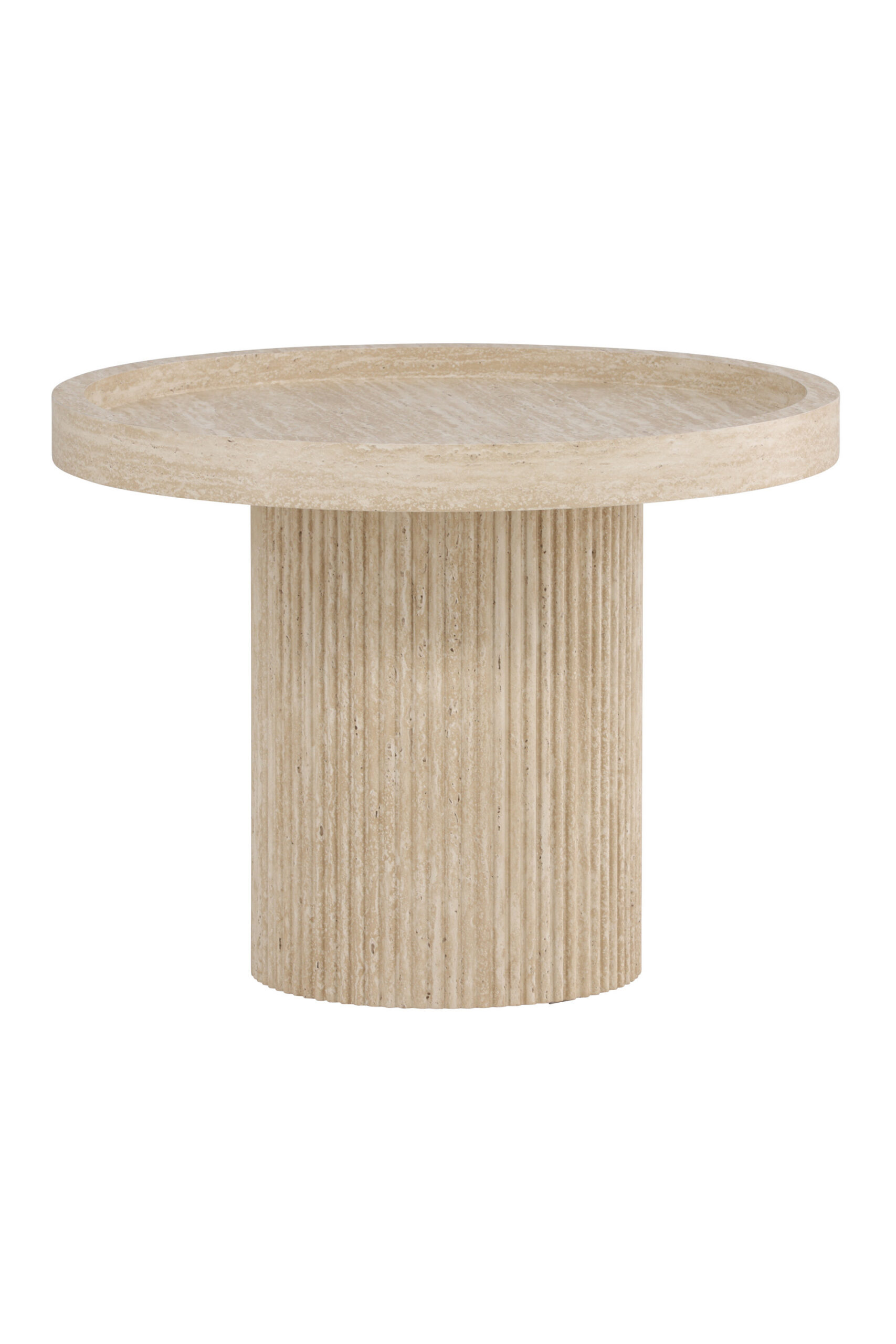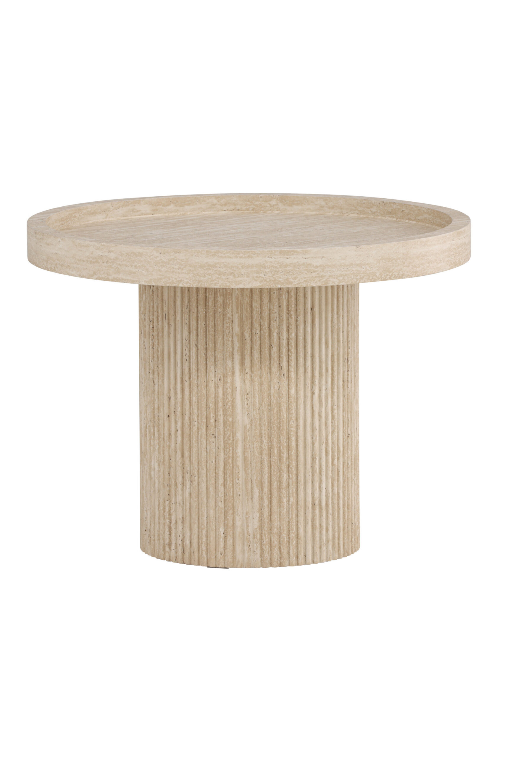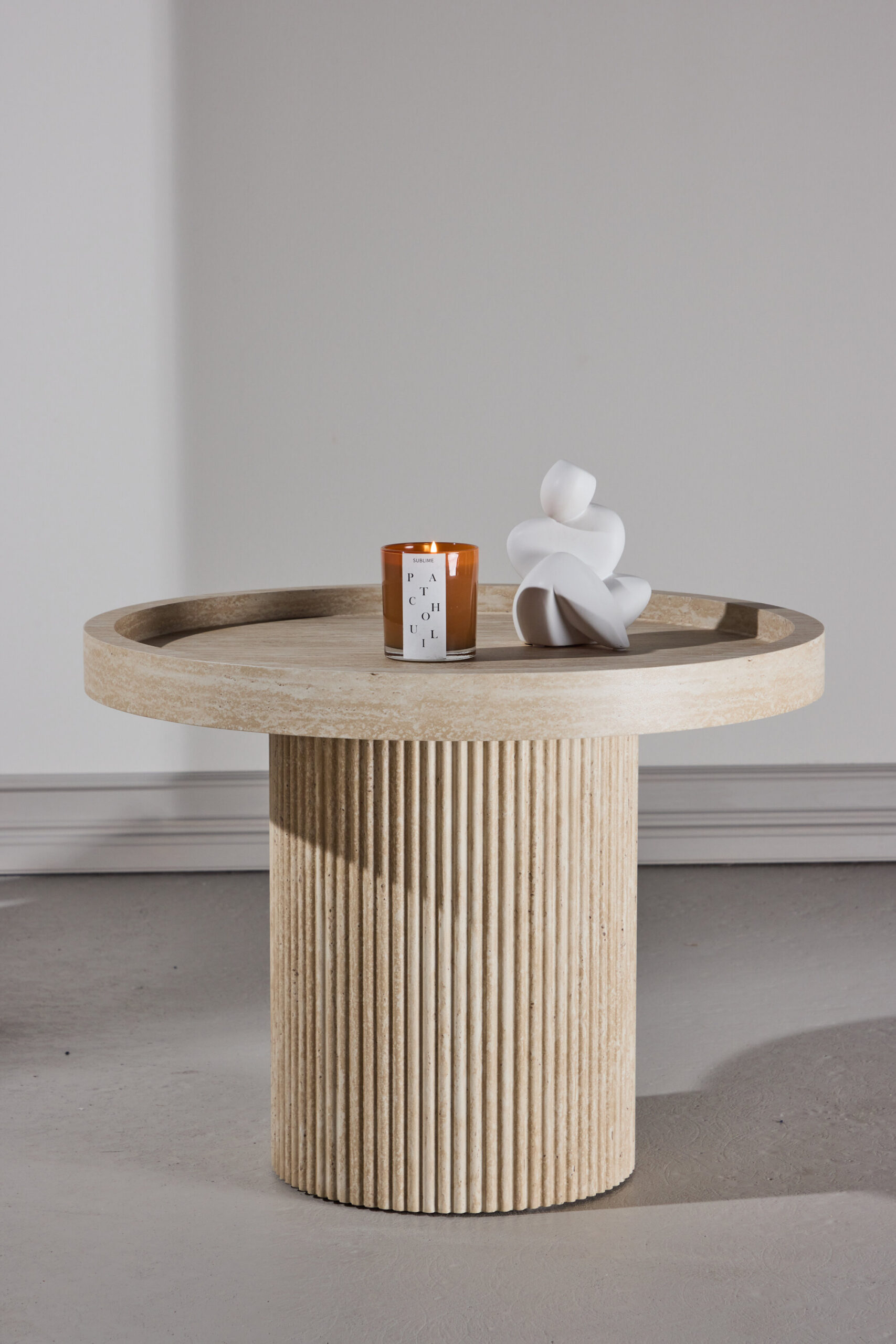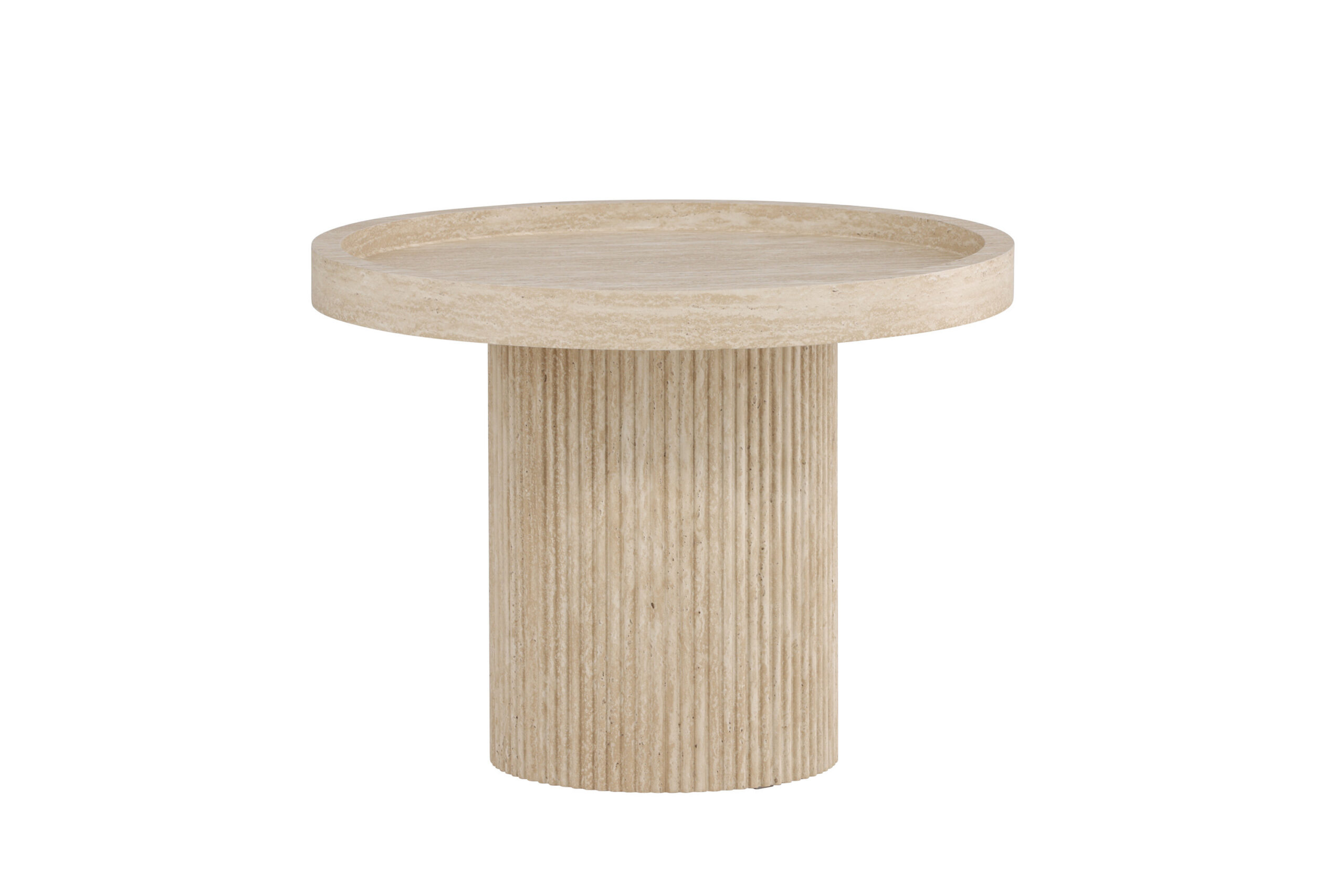 Laud on valmistatud travertiini välimusega viimistlusega, pakkudes sooja, loomulikult beeži tooni, mis sobib paljude interjööristiilidega. Sellel on ribilise disainiga silindriline jalg, mis lisab nii stabiilsust kui ka stiilset detaili.