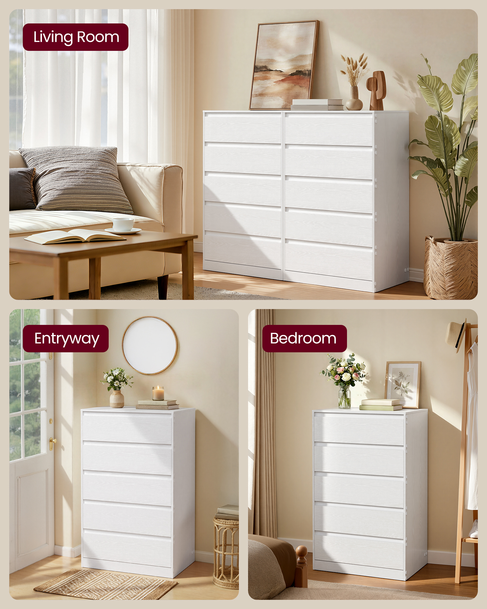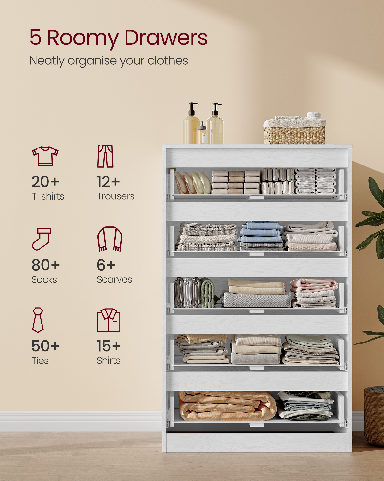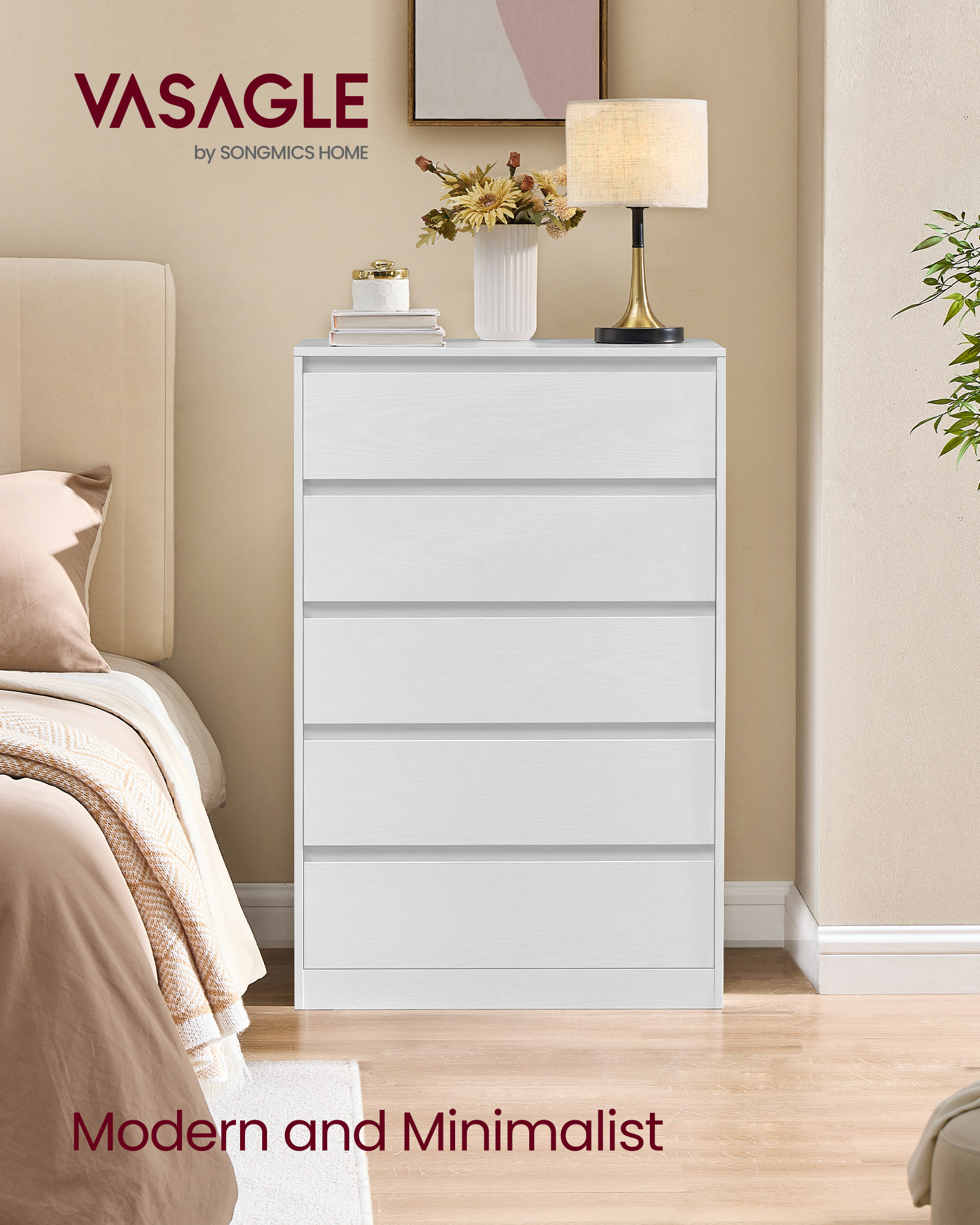Spetsifikatsioonid: – Värvus: Lumivalgeke – Materjal: Puitlaastplaat, MDF (keskmise tihedusega puitkiudplaat) – Toote mõõdud: 40 x 60 x 97,4 cm – Toote kaal: 26,2 kg – Lauaplaadi maksimaalne staatiline kandevõime: 75 kg – Iga sahtli maksimaalne staatiline kandevõime: 10 kg Pakisisu: – 1 x magamistoa kummut – 2 x ümberkukkumisvastast komplekti – 1 x lisatarvikute komplekt – 1 x juhend VASAGLE Märkused: – Ärge pange sahtlitesse ülekaalulisi esemeid. – Ohutuse tagamiseks kinnitage kummut seinale kaasasoleva ümberkukkumisvastase komplektiga.