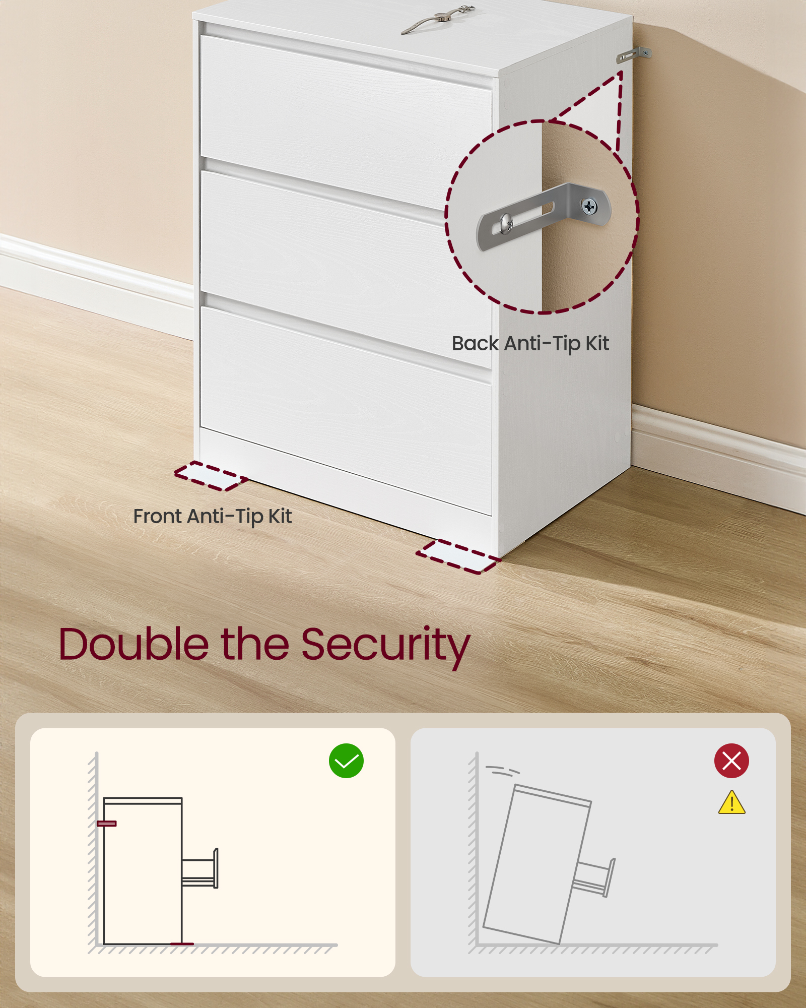 Spetsifikatsioonid: – Värvus: Lumivalgeke – Materjal: Puitlaastplaat, MDF (keskmise tihedusega puitkiudplaat) – Toote mõõdud: 40 x 60 x 75 cm – Toote kaal: 20,1 kg – Lauaplaadi maksimaalne staatiline kandevõime: 75 kg – Iga sahtli maksimaalne staatiline kandevõime: 10 kg Pakisisu: – 1 x magamistoa kummut – 2 x ümberkukkumisvastast komplekti – 1 x lisatarvikute komplekt – 1 x juhend VASAGLE Märkused: – Ärge pange sahtlitesse ülekaalulisi esemeid. – Ohutuse tagamiseks kinnitage kummut seinale kaasasoleva ümberkukkumisvastase komplektiga.