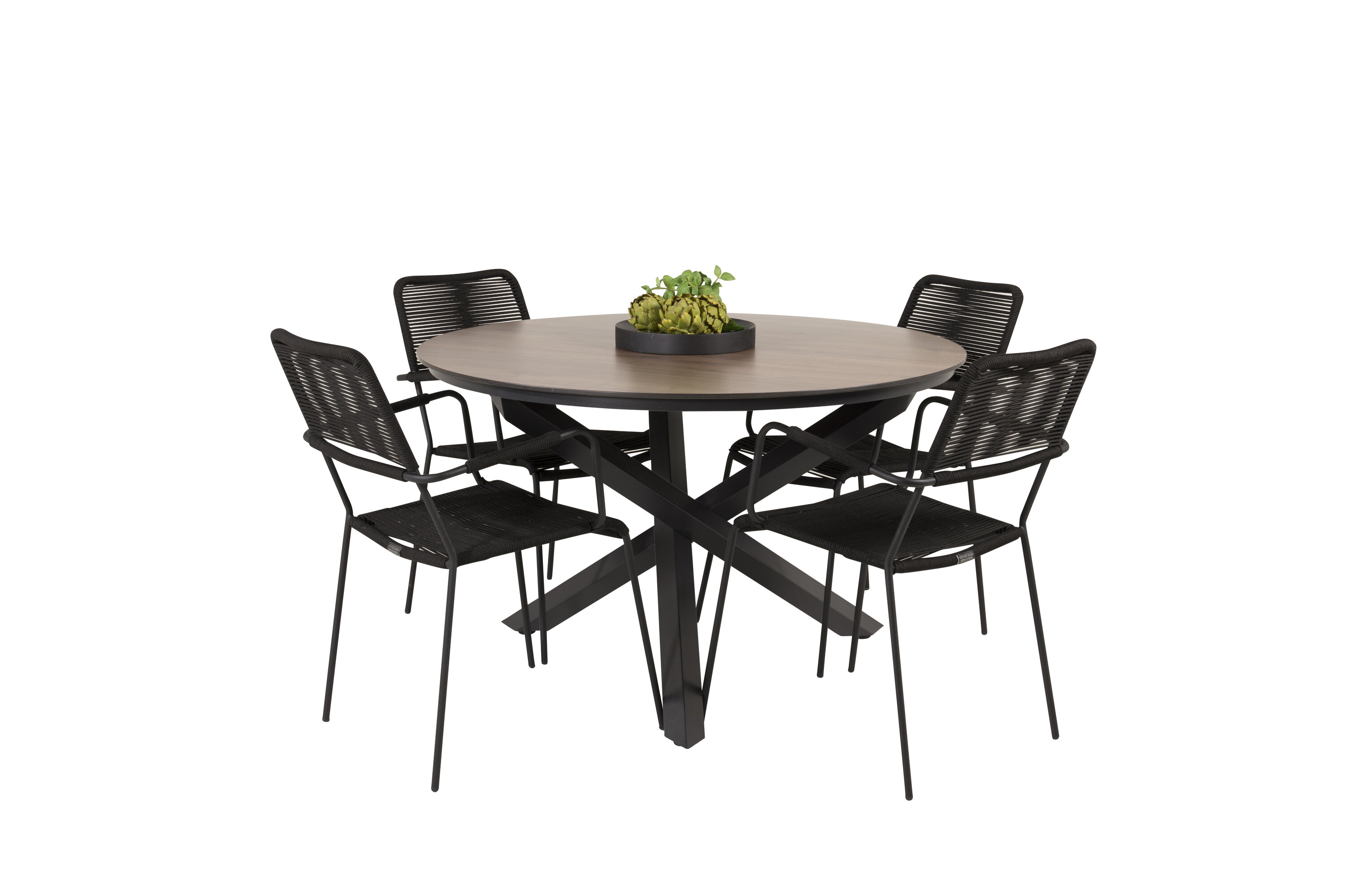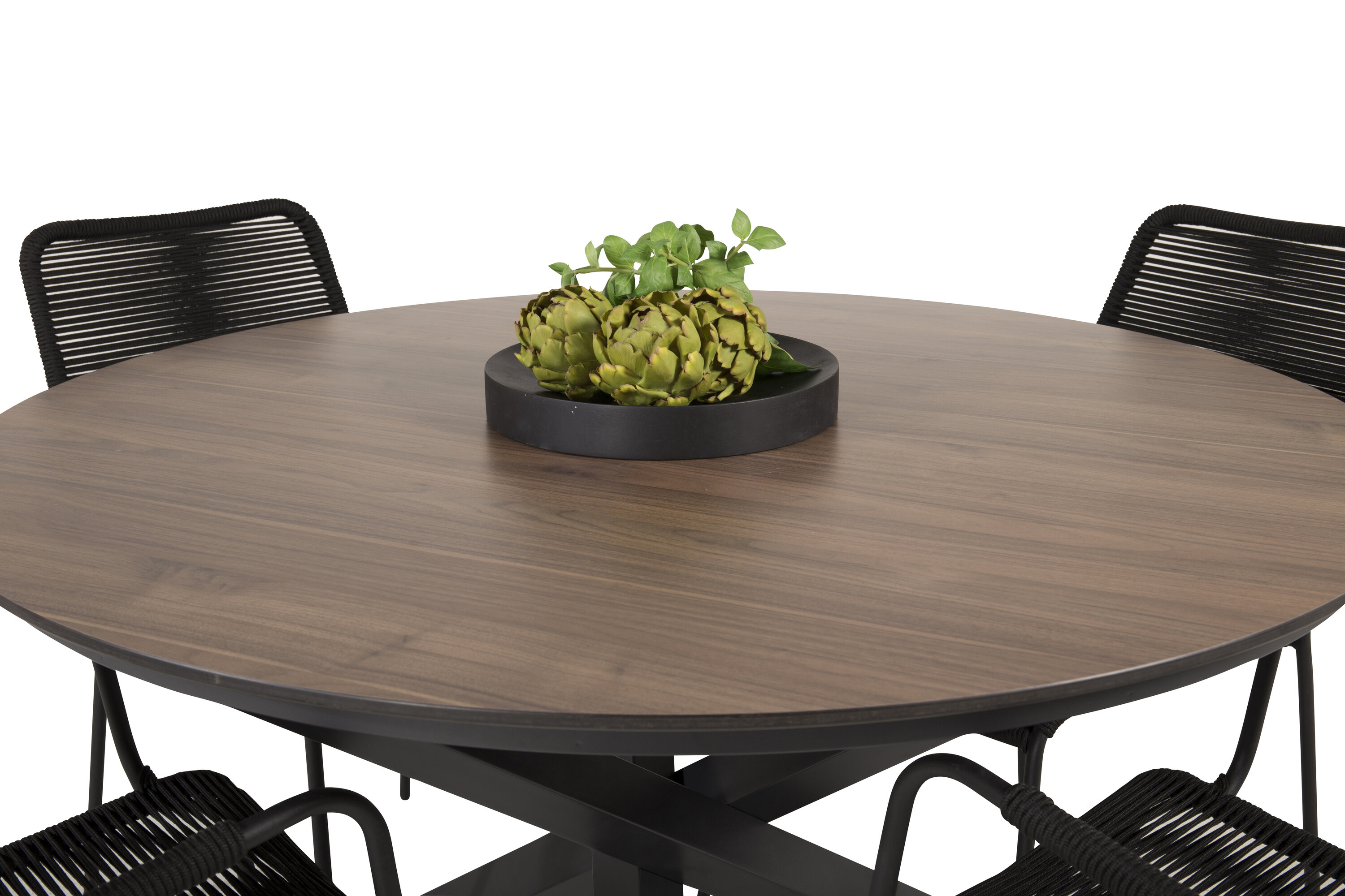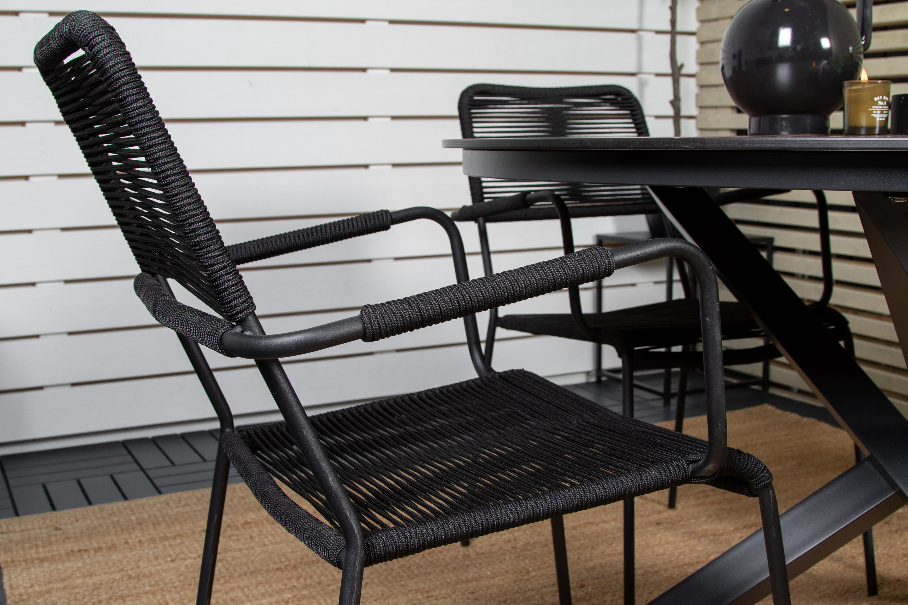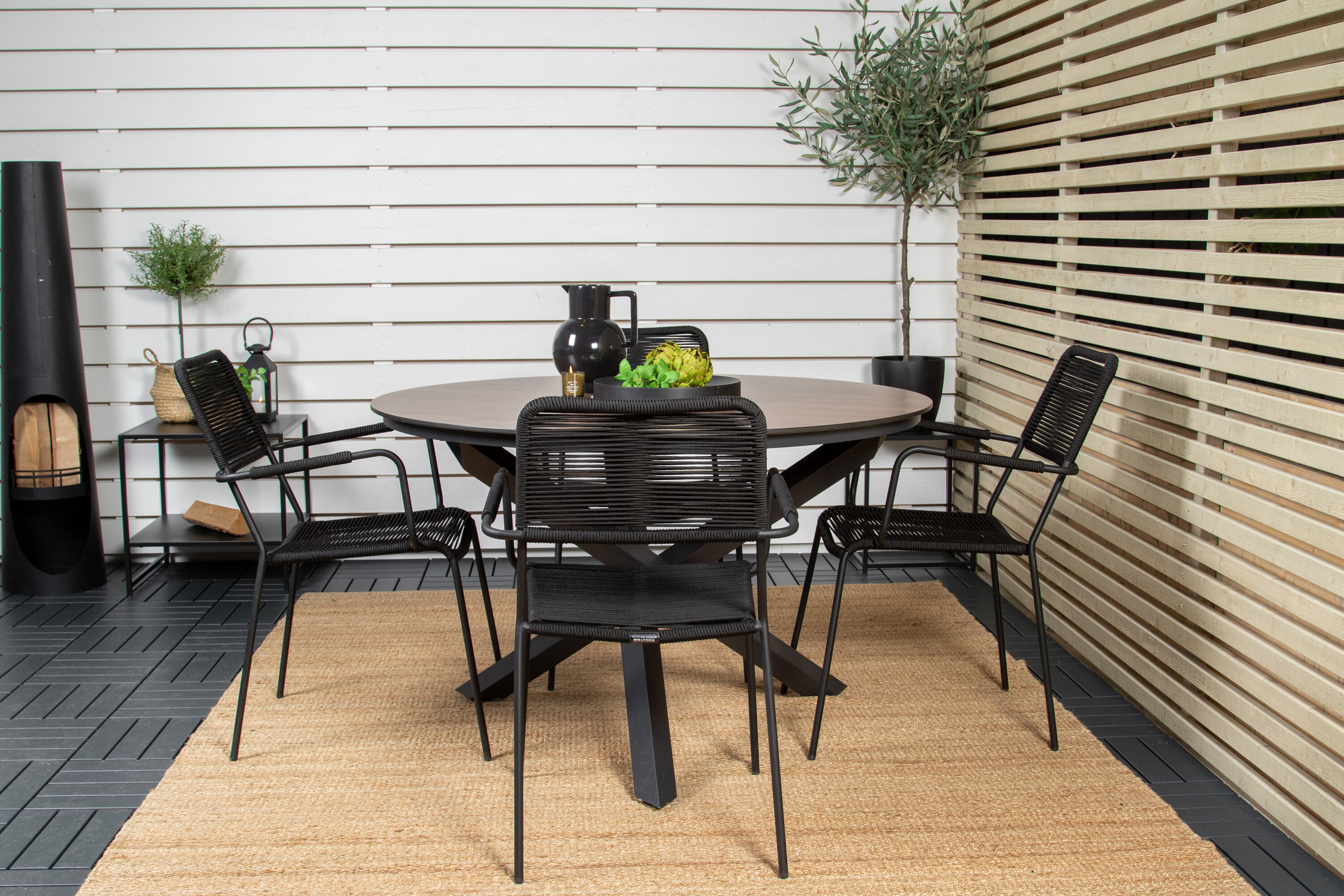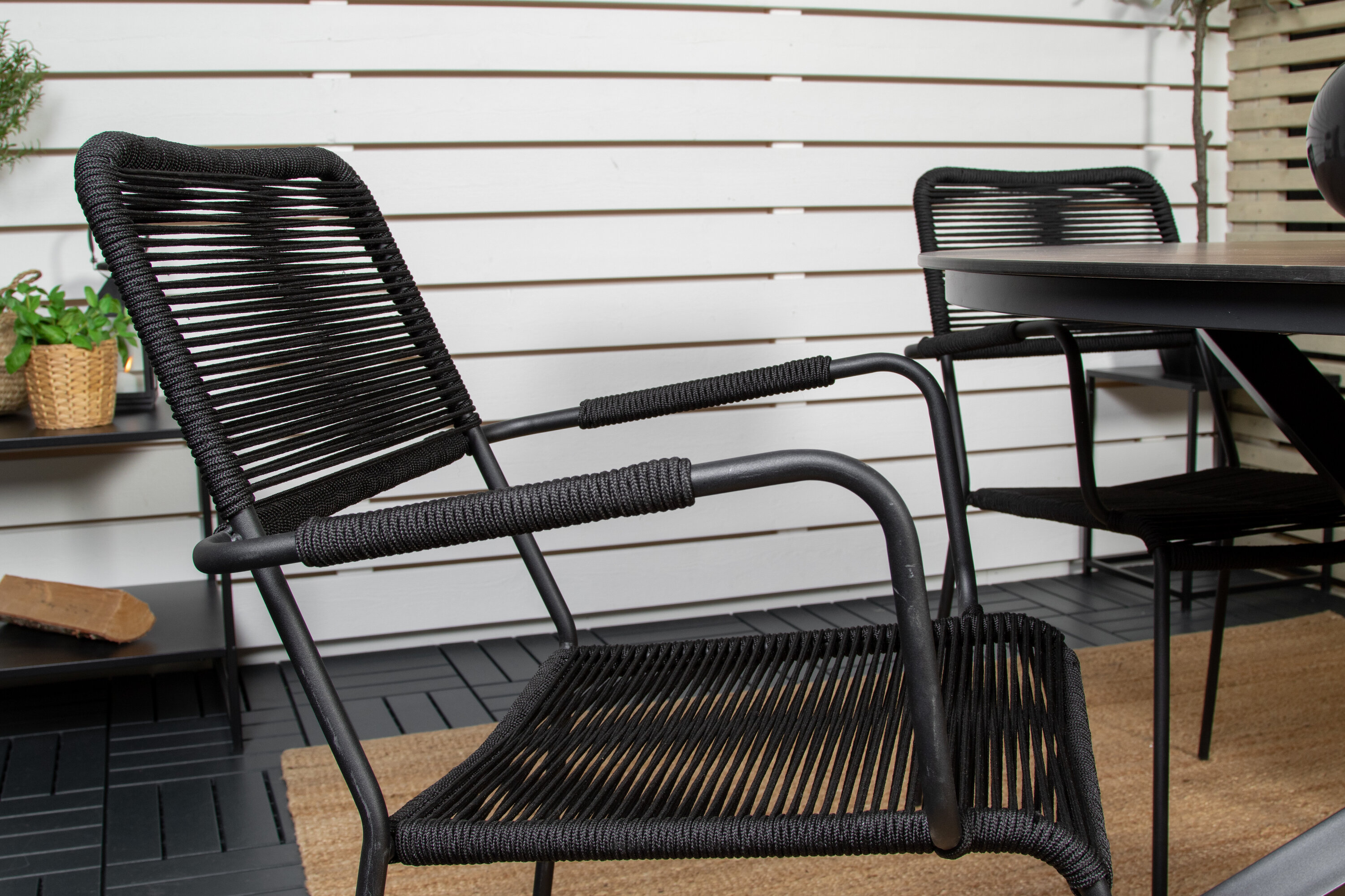 Klassikaline toidugrupp, mis sobib enamikesse majapidamistesse! Söögilaud-laama koos söögitoolidega sarjast Lindos istmega mustast kootud köiest. Nagu loodud neile, kes soovivad luua õues või rõdul hubast ja kaasaegset tunnet.