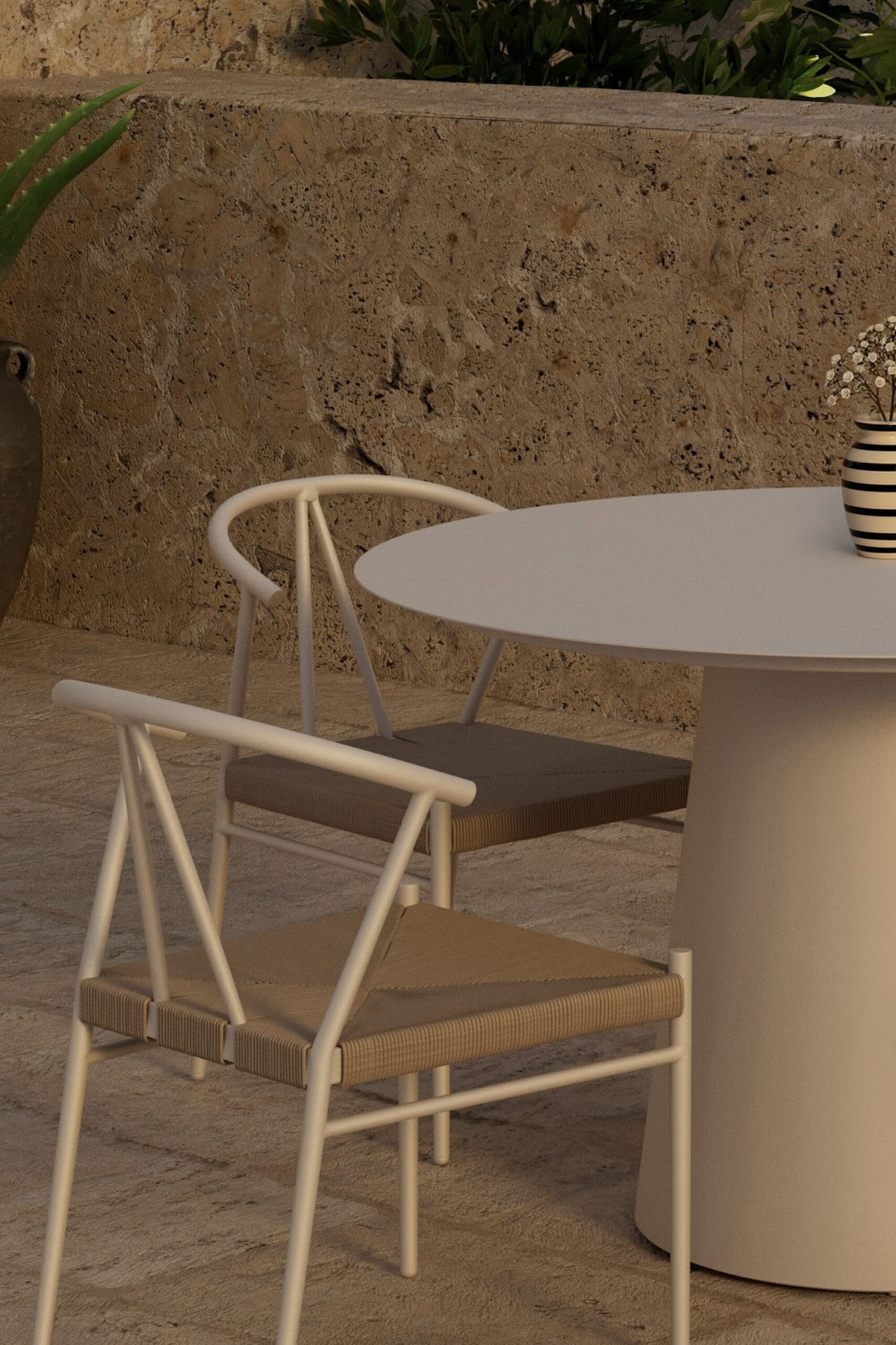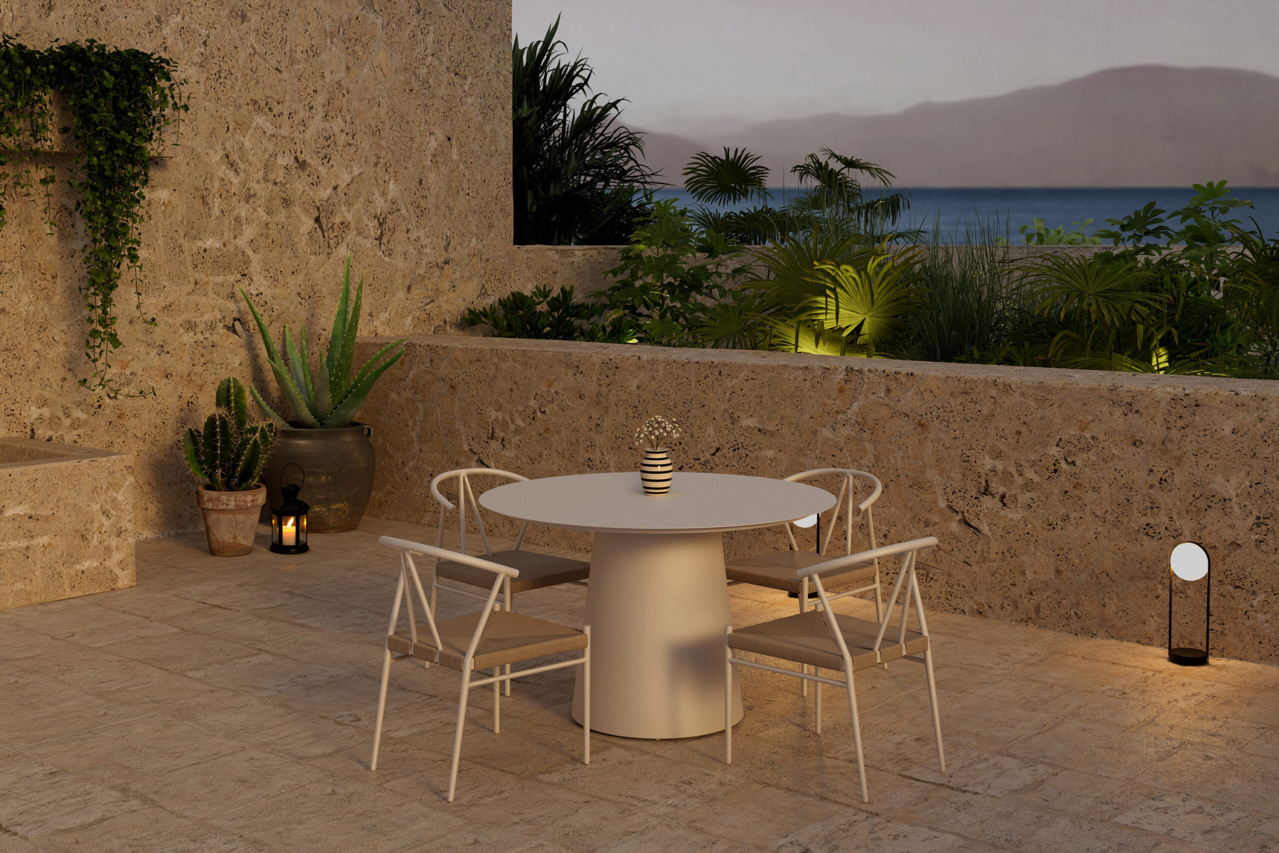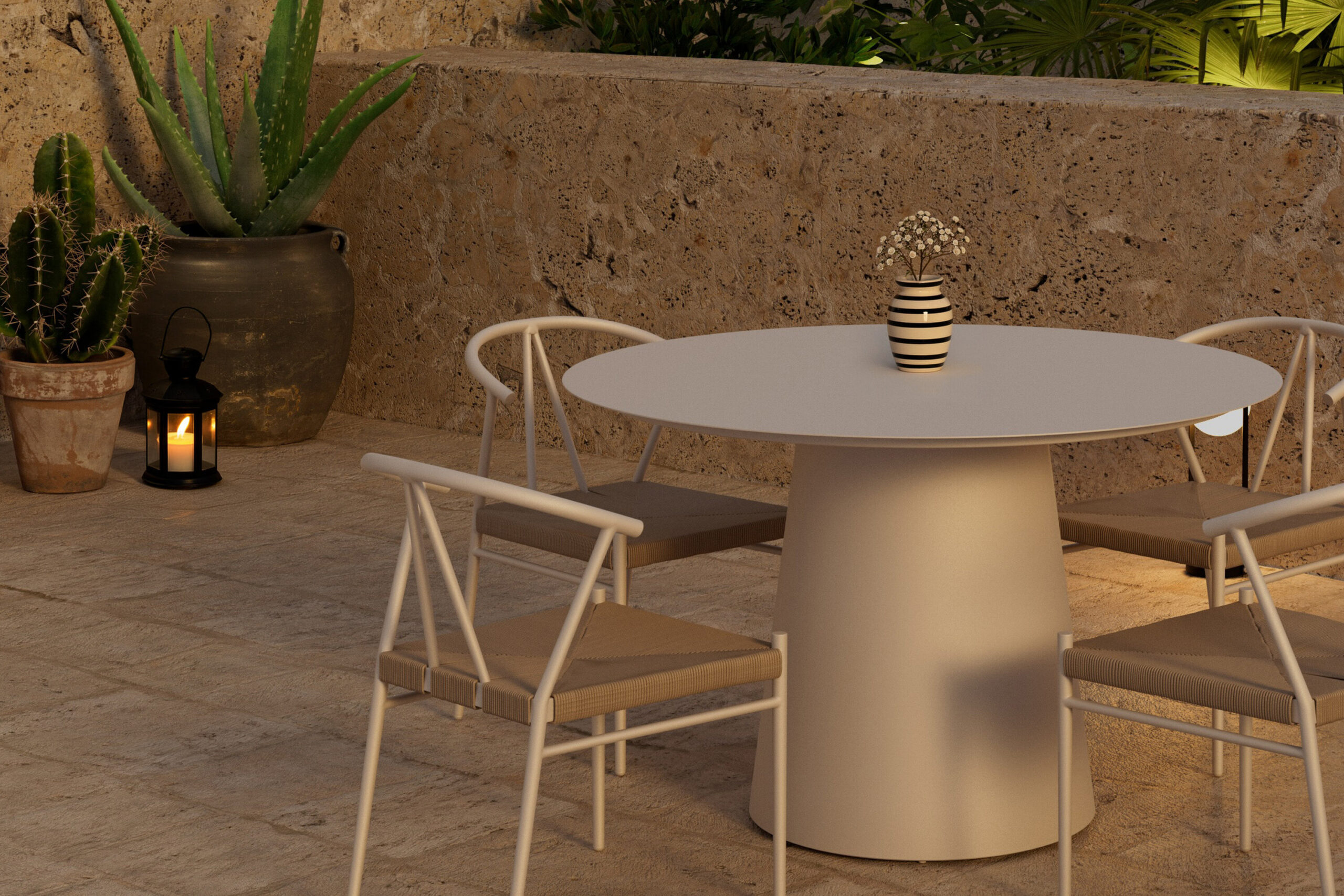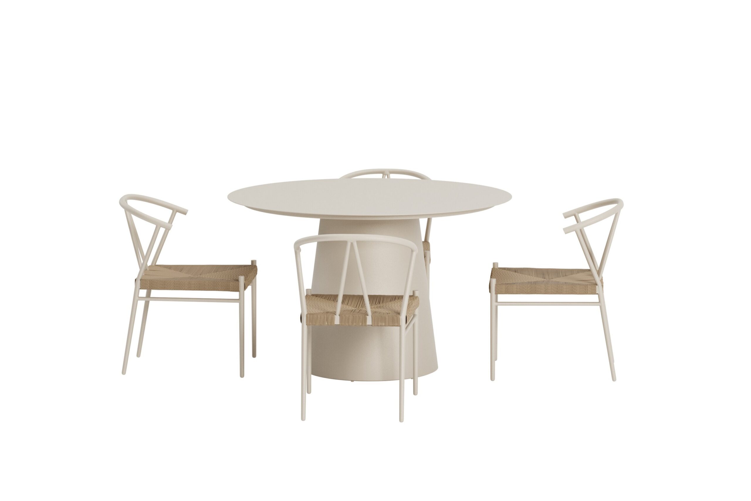 Alfons & Lanzo söögikomplektiga looge stiilne ja kutsuv söögituba. Alfonsi söögitoolil on ajatu disain, mis ühendab elegantselt skandinaavialiku lihtsuse ja loomuliku võlu. Kerge raam annab värske ja õhulise ilme, samas kui kootud iste lisab soojust ja iseloomu. Kumer seljatugi pakub mugavat tuge ja muudab tooli meeldivaks ka pikemate õhtusöökide ajal, muutes selle nii praktiliseks kui ka esteetiliseks. Lanzo söögilaud täiendab toole suurepäraselt oma ümara kuju ja minimalistliku beeži alumiiniumi siluetiga. Puhas disain loob harmoonilise fookuspunkti, mis töötab nii terrassil kui ka aias. Avar lauaplaat võimaldab hõlpsalt koguda perekonda ja sõpru igapäevasteks söögikordadeks ja pidulikeks hetkedeks. Alfonsi toolid ja Lanzo söögilaud moodustavad koos moodsa ja elegantse söögikomplekti, mis tõstab esile iga väliskeskkonna ja pakub palju nauditavaid eineid.