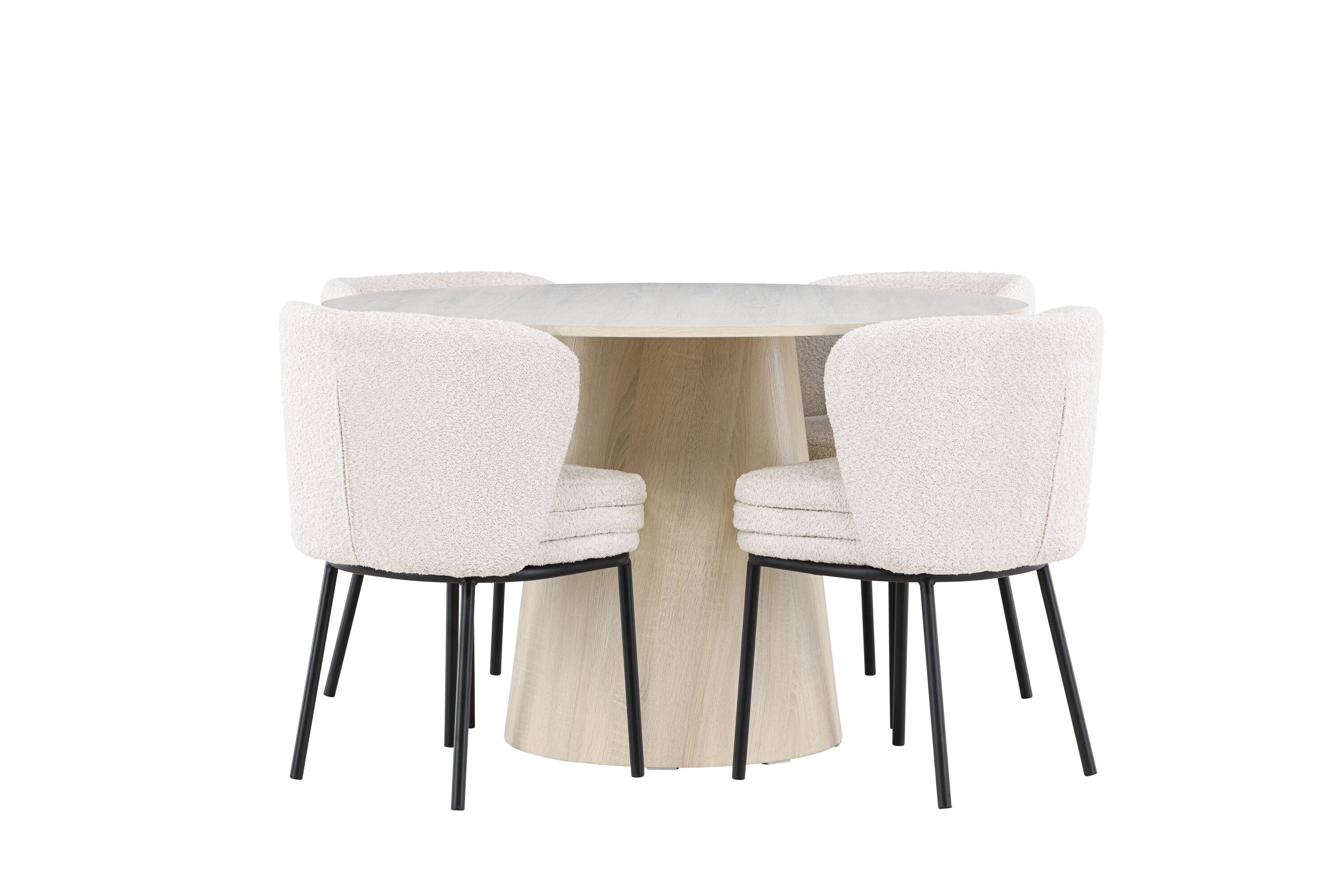 Looge stiilne ja kutsuv söögituba meie elegantse söögikomplektiga, mis ühendab kauni Lanzo laua luksuslike Agnese toolidega. See söögikomplekt, mis sobib ideaalselt nii igapäevaseks õhtusöögiks kui ka pidulikuks sündmuseks, annab teie söögitoale kaasaegse ja peene tunde. Valgeks lubjatud MDF-plaadist valmistatud Lanzo laual on kerge ja värske värv, mis lisab teie söögituppa puhta ja kutsuva atmosfääri. Rikkaliku 120 cm läbimõõduga laud pakub rohkelt ruumi söögiks ja vestlusteks, samas kui selle ümar kuju loob tasakaalustatud ja sotsiaalse keskkonna. Laua vastupidav konstruktsioon tagab pikaajalise kasutuse ja stabiilsuse. Neli Agnese tooli täiendavad oma elegantsete valgete boucle istmetega suurepäraselt lauda. Need toolid pakuvad nii mugavust kui ka stiili, muutes need ideaalseks pikaks ja nauditavaks õhtusöögiks pere ja sõpradega. Nende kaasaegne disain koos kõrgete seljatoe ja pehmete istmetega annab teie söögitoale rafineeritud ja kaasaegse ilme. See söögikomplekt on täiuslik kombinatsioon esteetikast ja funktsionaalsusest, mistõttu on see suurepärane valik neile, kes otsivad elegantset ja mugavat söögituba. Täiustage oma söögituba Lanzo laua ja Agnese toolide kombinatsiooniga ning looge koht, kus jagatakse mälestusi ja rõõmu.