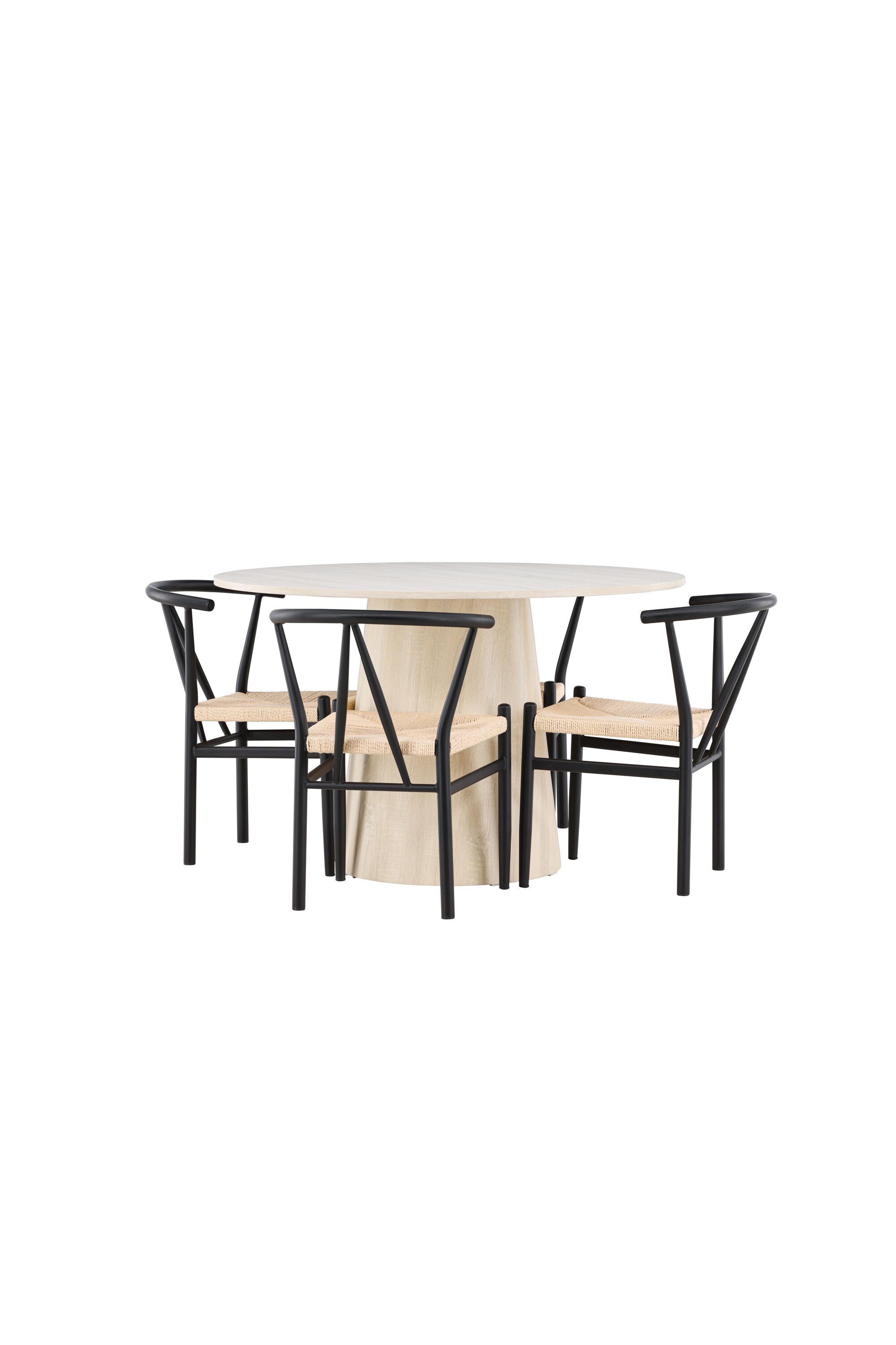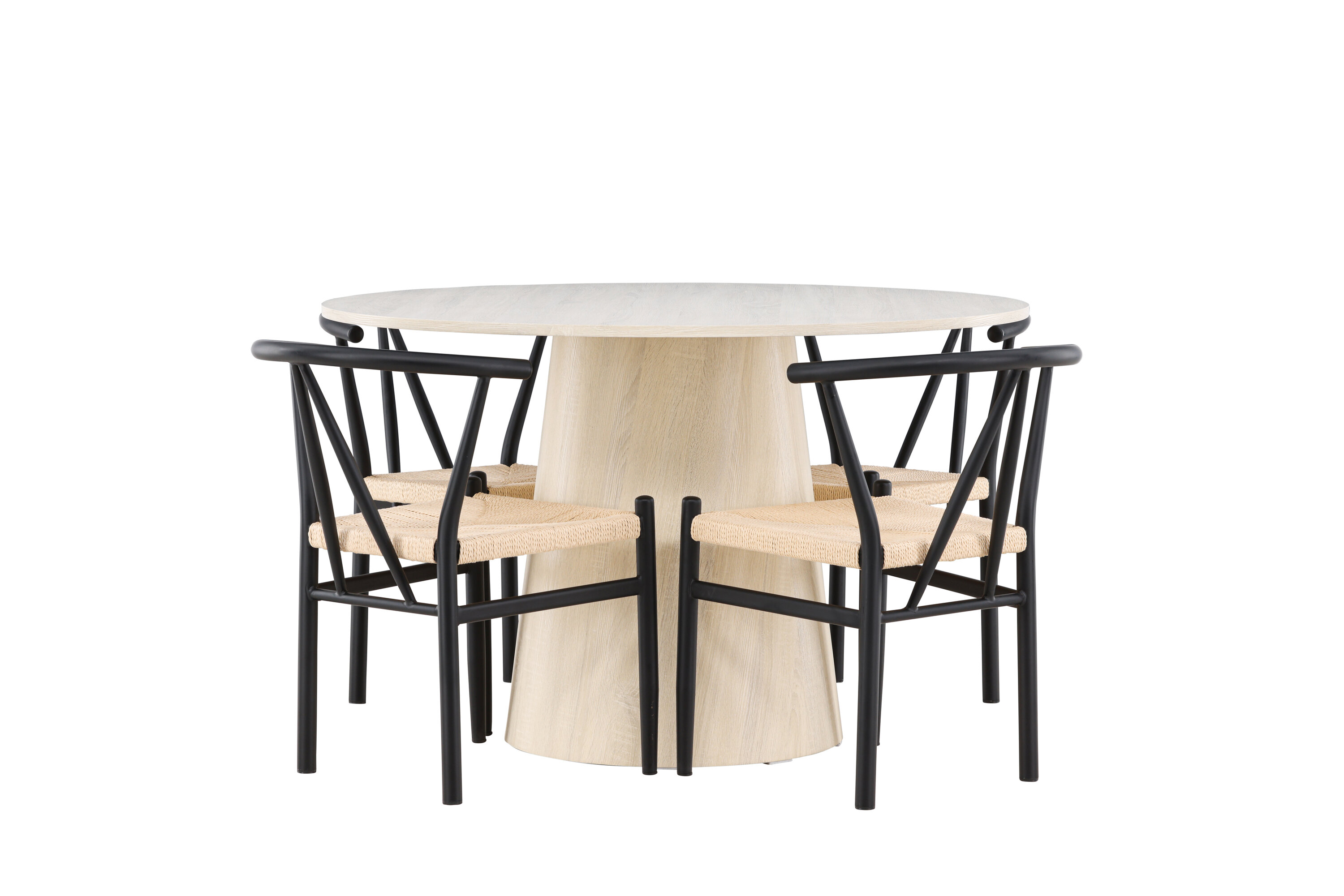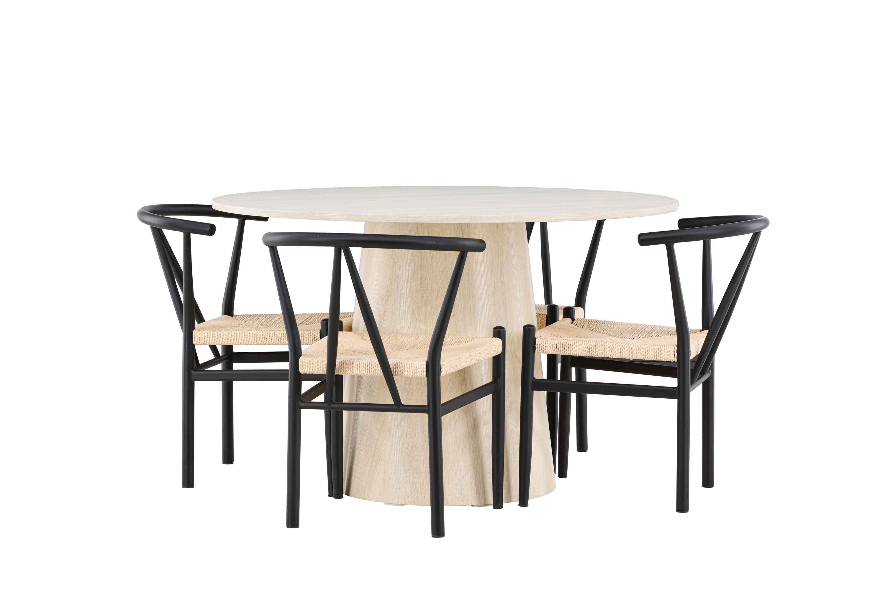 Looge meie elegantse söögikomplektiga kutsuv ja stiilne söögituba, mis ühendab kauni Lanzo laua võluvate Alfonsi toolidega. See söögikomplekt, mis sobib ideaalselt nii igapäevaseks õhtusöögiks kui ka pidulikuks sündmuseks, annab teie söögitoale kaasaegse ja harmoonilise tunde. Valgeks lubjatud MDF-plaadist valmistatud Lanzo laual on kerge ja värske värv, mis lisab teie söögituppa puhta ja kutsuva atmosfääri. Rikkaliku 120 cm läbimõõduga laud pakub rohkelt ruumi söögiks ja vestlusteks, samas kui selle ümar kuju loob tasakaalustatud ja sotsiaalse keskkonna. Laua vastupidav konstruktsioon tagab pikaajalise kasutuse ja stabiilsuse. Neli Alfonsi tooli täiendavad lauda suurepäraselt oma elegantsete beežide rotangist istmete ja klanitud mustade jalgadega. Need toolid pakuvad nii mugavust kui ka stiili, muutes need ideaalseks pikaks ja nauditavaks õhtusöögiks pere ja sõpradega. Nende kaasaegne disain koos looduslike materjalide ja musta kontrastiga annavad teie söögitoale rafineeritud ja kaasaegse ilme. See söögikomplekt on täiuslik kombinatsioon esteetikast ja funktsionaalsusest, mistõttu on see suurepärane valik neile, kes otsivad elegantset ja mugavat söögituba. Täiustage oma söögituba Lanzo laua ja Alfonsi toolide kombinatsiooniga ning looge koht, kus jagatakse mälestusi ja rõõmu.