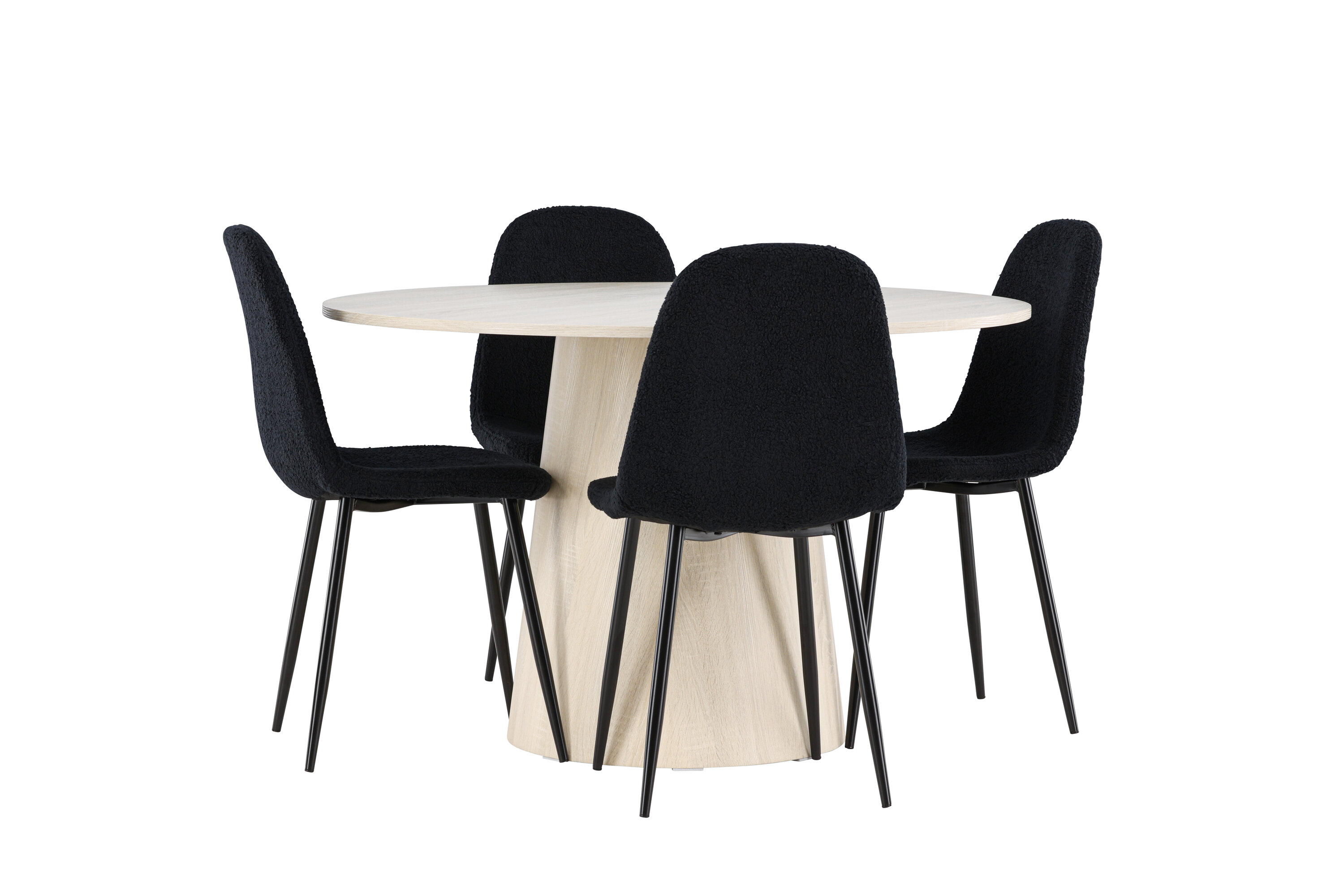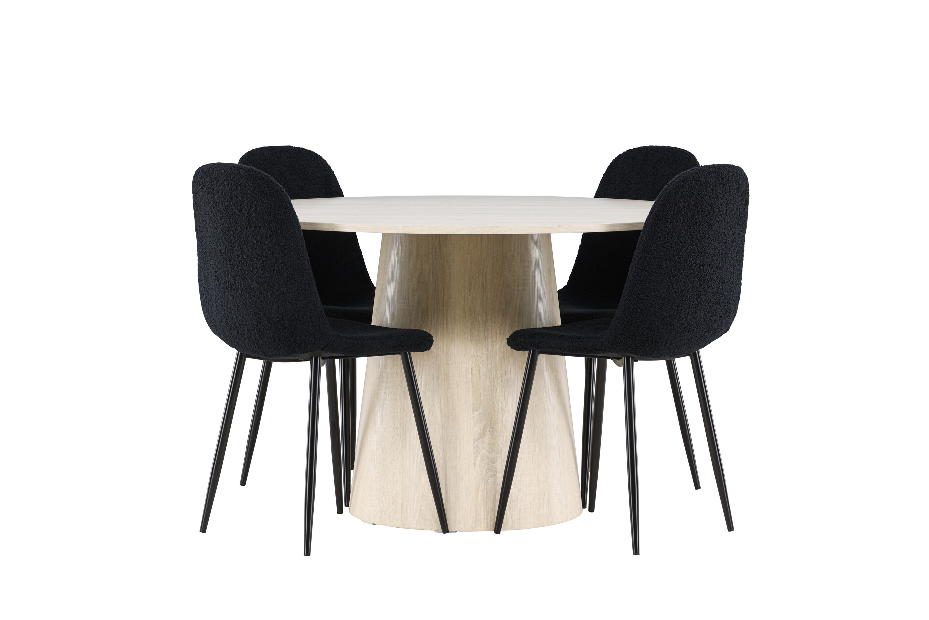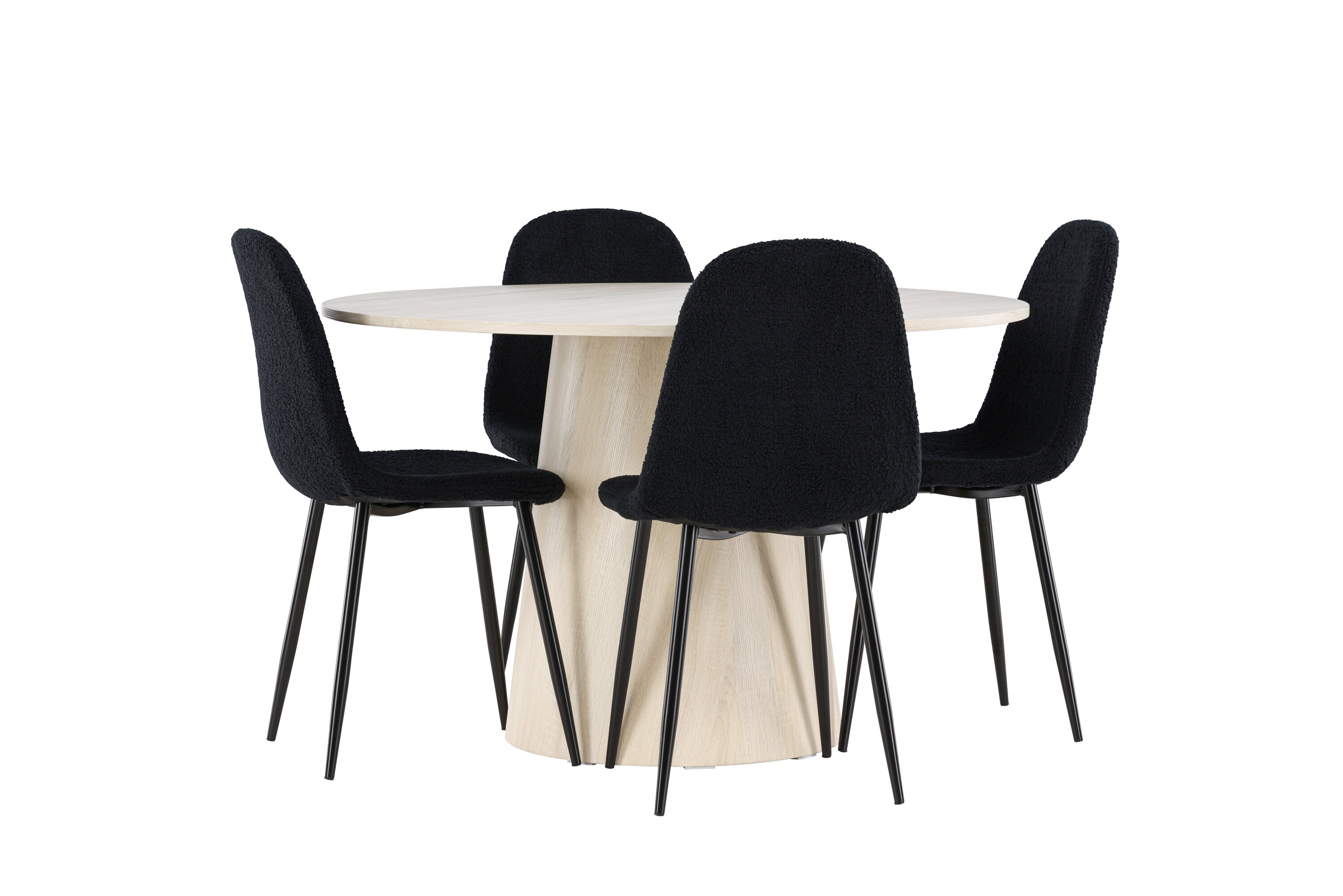 Looge stiilne ja kutsuv söögituba meie elegantse söögikomplektiga, mis ühendab kauni Lanzo laua mugavate Polari toolidega. See söögikomplekt, mis sobib ideaalselt nii igapäevaseks õhtusöögiks kui ka pidulikuks sündmuseks, annab teie söögitoale kaasaegse ja peene tunde. Valgeks lubjatud MDF-plaadist valmistatud Lanzo laual on kerge ja värske värv, mis lisab teie söögituppa puhta ja harmoonilise atmosfääri. Rikkaliku 120 cm läbimõõduga laud pakub rohkelt ruumi söögiks ja vestlusteks, samas kui selle ümar kuju loob tasakaalustatud ja kutsuva keskkonna. Laua vastupidav konstruktsioon tagab pikaajalise kasutuse ja stabiilsuse. Neli Polari tooli täiendavad suurepäraselt lauda oma elegantsete musta polüestrist mänguistmetega. Need toolid pakuvad nii mugavust kui ka stiili, muutes need ideaalseks pikaks ja nauditavaks õhtusöögiks pere ja sõpradega. Nende kaasaegne disain koos kõrgete seljatoe ja pehmete istmetega annab teie söögitoale rafineeritud ja kaasaegse ilme. See söögikomplekt on täiuslik kombinatsioon esteetikast ja funktsionaalsusest, mistõttu on see suurepärane valik neile, kes otsivad elegantset ja mugavat söögituba. Täiustage oma söögituba Lanzo laua ja Polari toolide kombinatsiooniga ning looge koht, kus jagatakse mälestusi ja rõõmu.