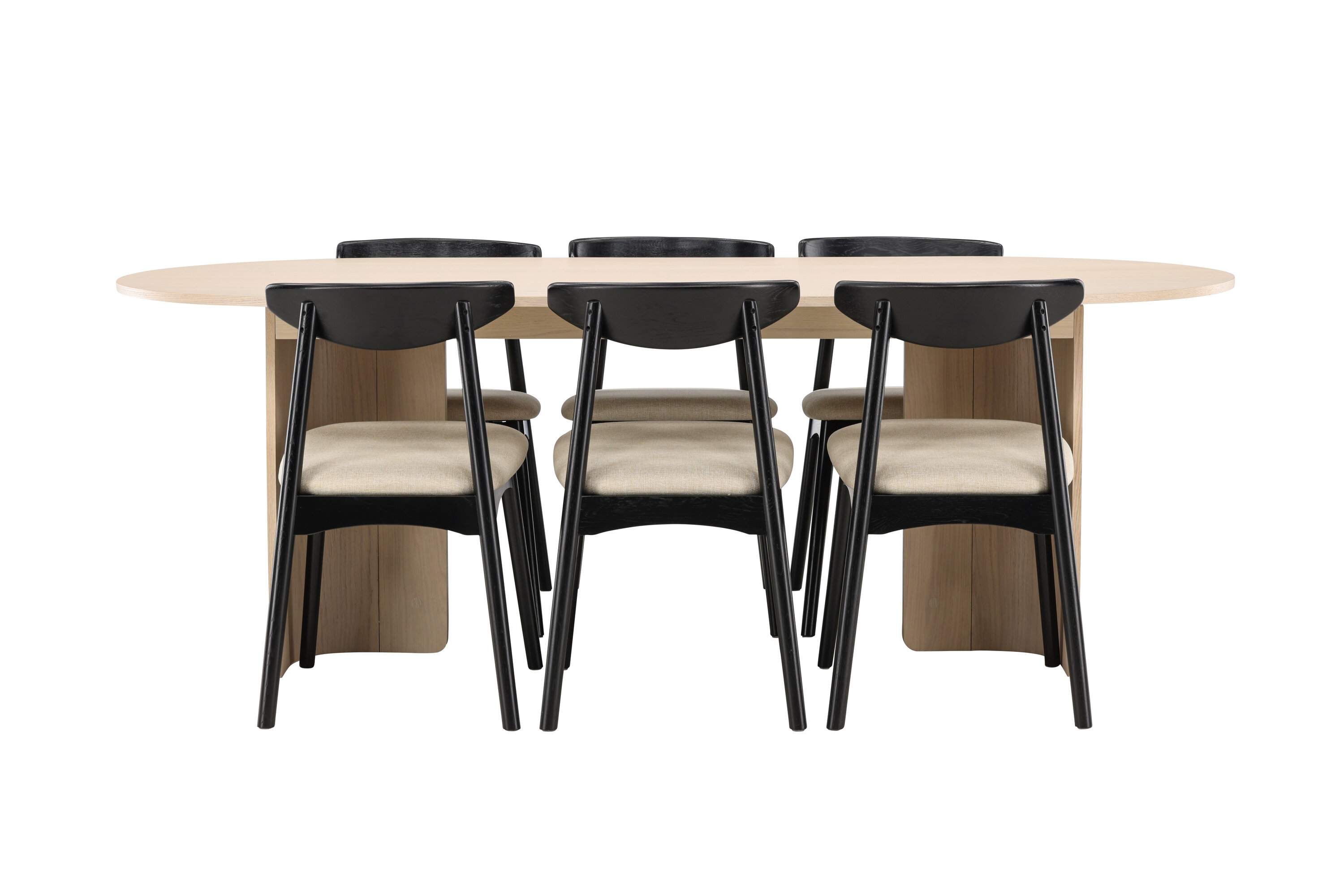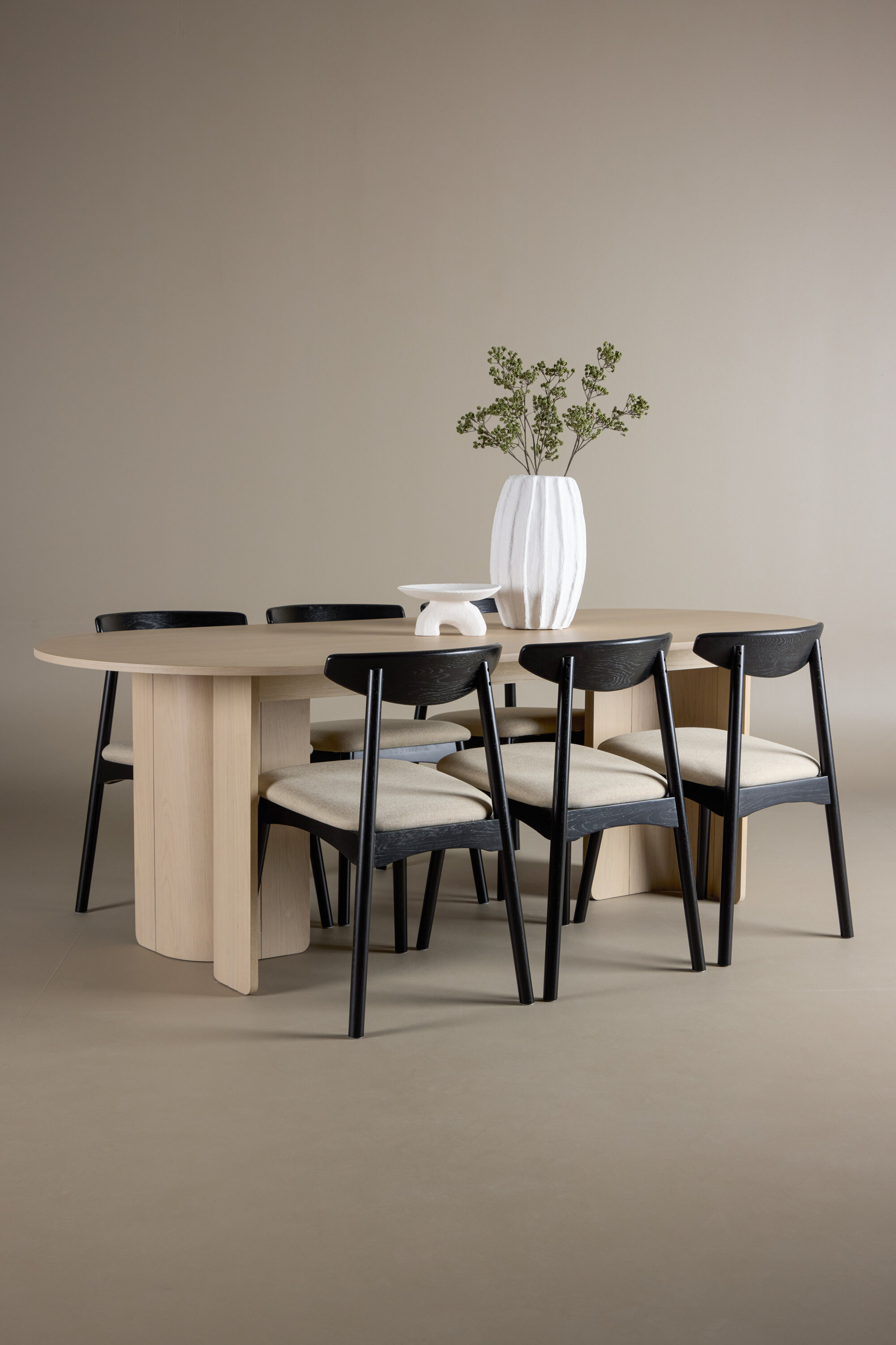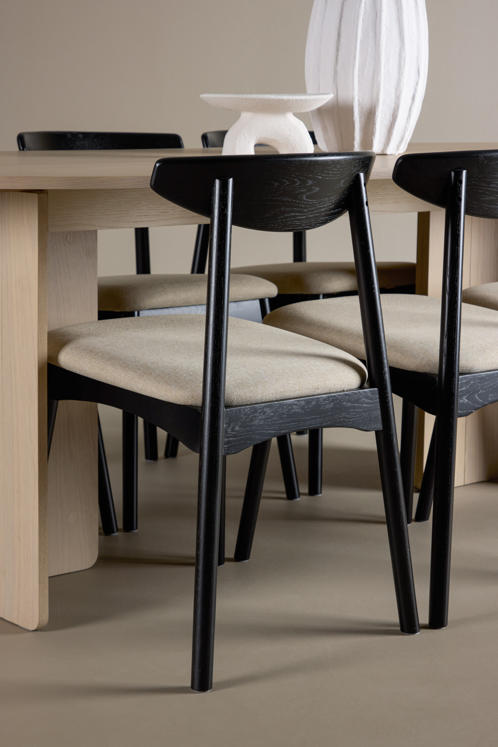 Lauda ümbritsevad Veni toolid oma mustade raamide ja pehmete beežide istmetega – klanitud kontrast, mis lisab ansamblile sügavust ja iseloomu. Üheskoos moodustavad need tasakaalustatud ja ajatu söögikomplekti, mis sobib suurepäraselt nii kiireteks argipäevasteks eineteks kui ka pikkadeks koosviibimisteks sõprade ja perega.