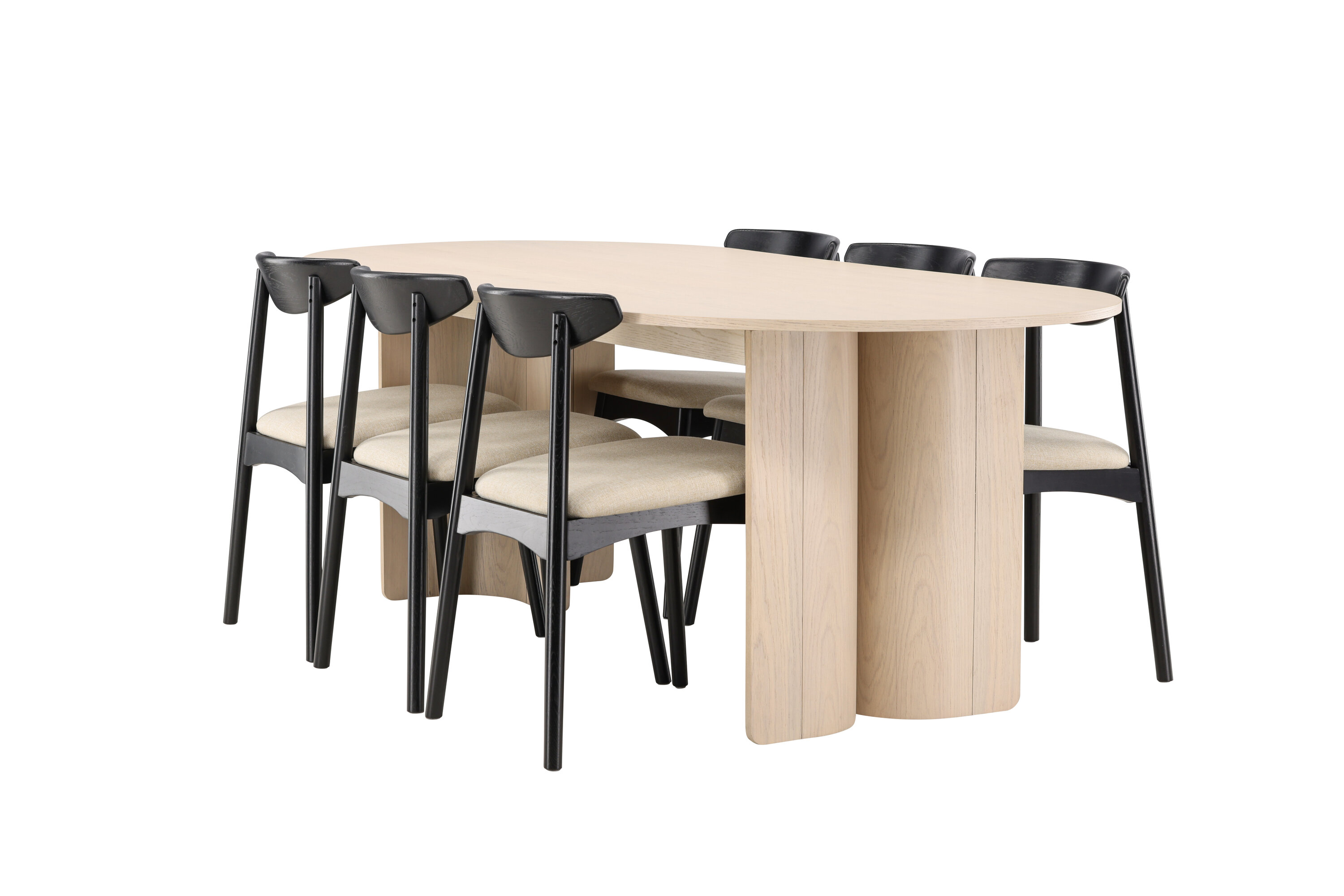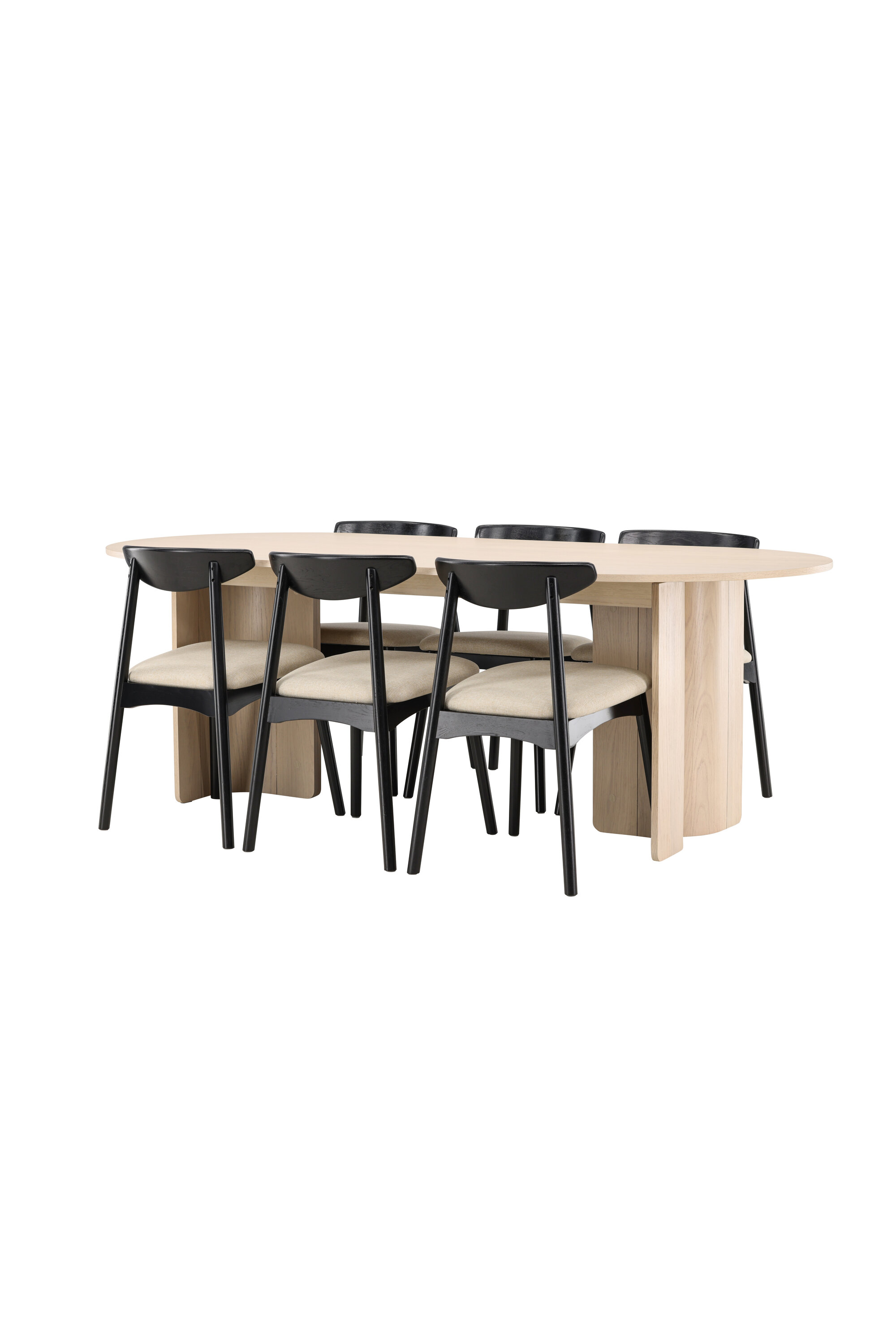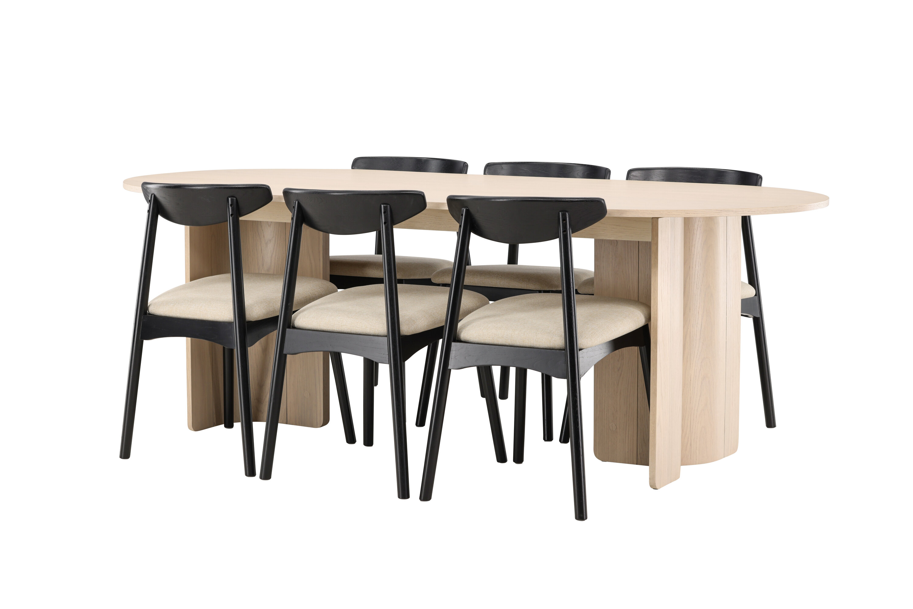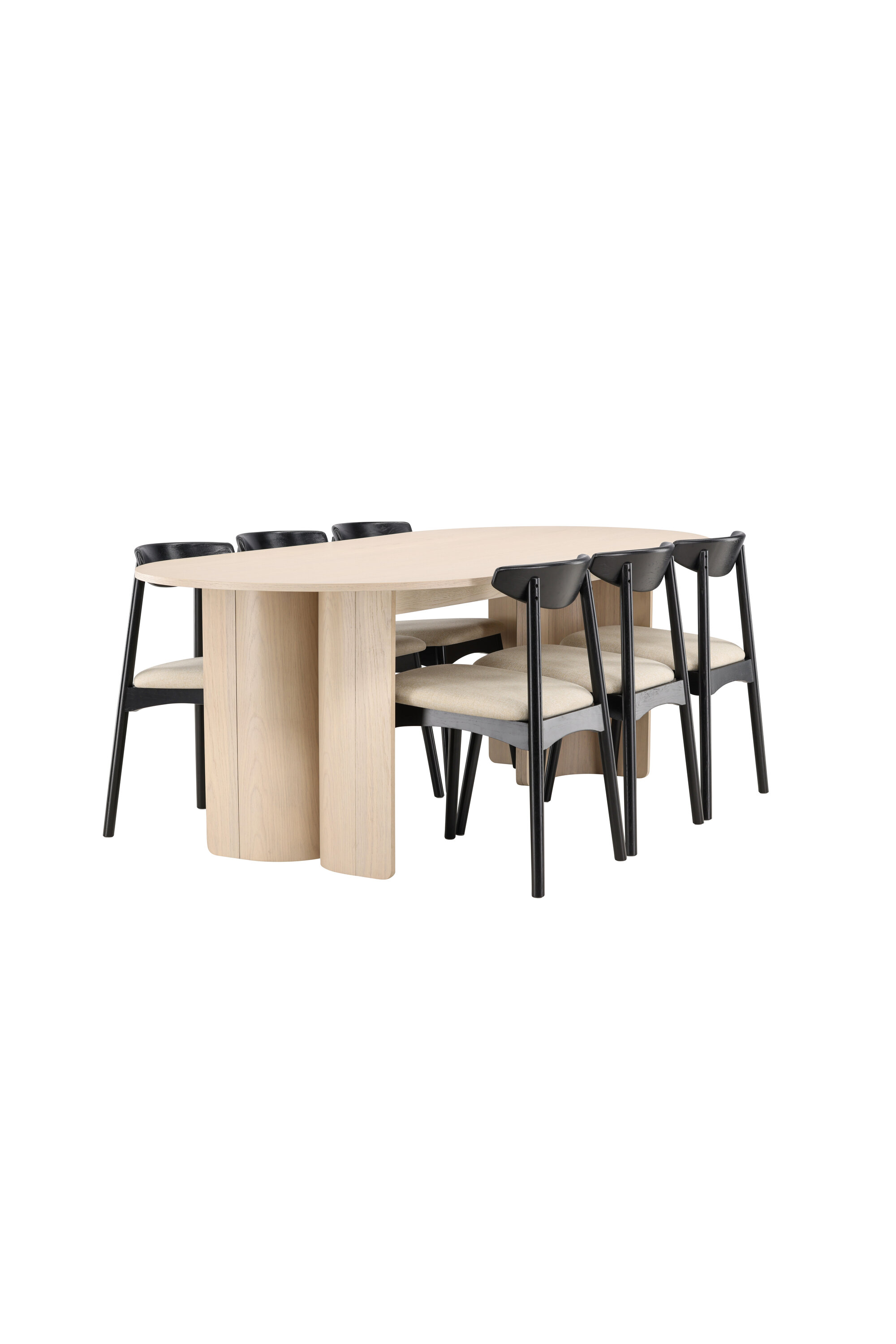 Lauda ümbritsevad Veni toolid oma mustade raamide ja pehmete beežide istmetega – klanitud kontrast, mis lisab ansamblile sügavust ja iseloomu. Üheskoos moodustavad need tasakaalustatud ja ajatu söögikomplekti, mis sobib suurepäraselt nii kiireteks argipäevasteks eineteks kui ka pikkadeks koosviibimisteks sõprade ja perega.