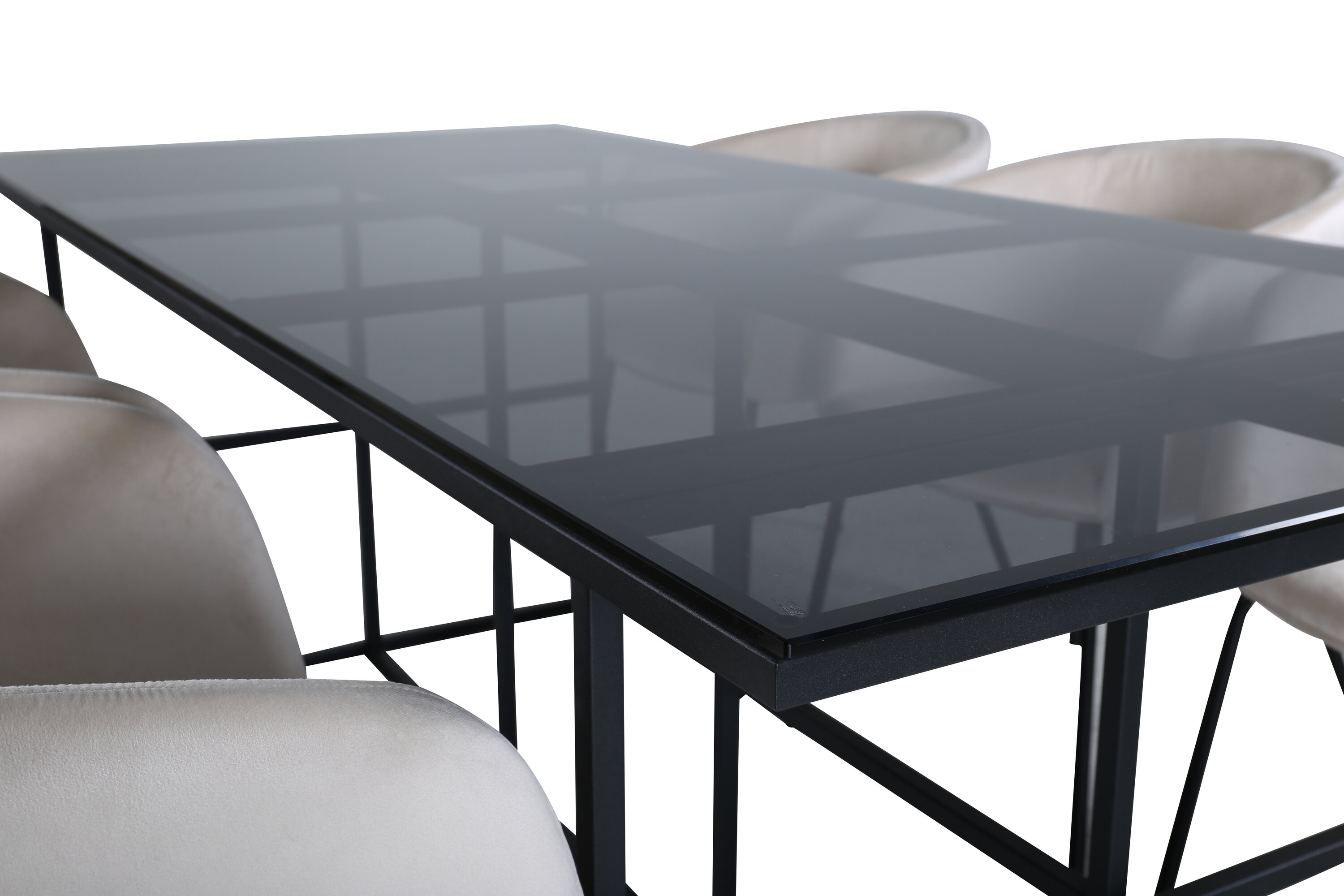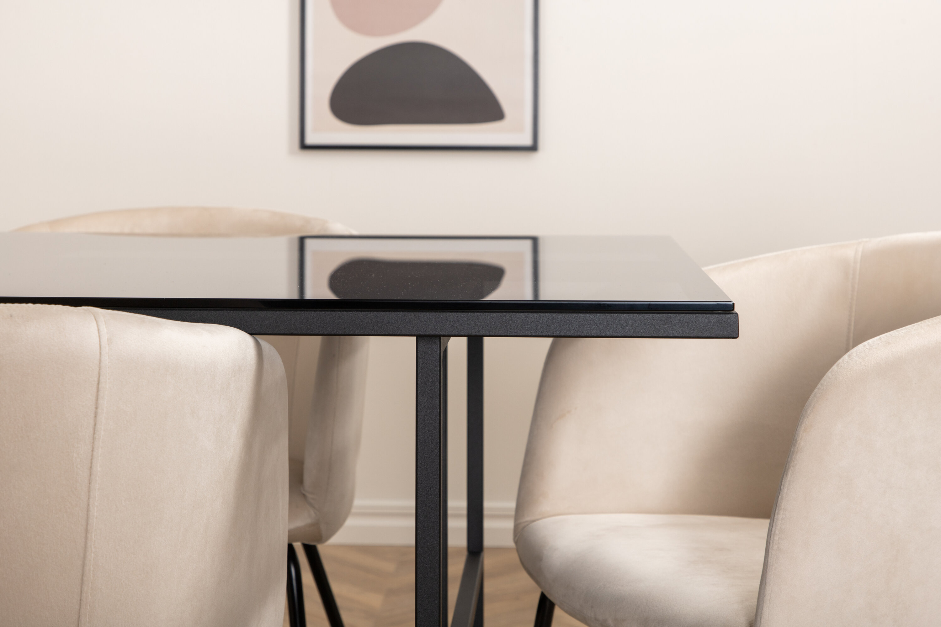 Mugavusele ja elegantsile keskenduv toidugrupp! Söögilaud Leif loob kiiresti pilgupüüdja, mis avaldab muljet oma tööstusliku välimuse ja sirgete minimalistlike vormidega. Pealmine plaat on suitsumustast klaasist stiilse terviku jaoks ja korpus mustast metallist. Laua mõõdud: pikkus: 200 cm, laius: 90 cm, kõrgus: 74 cm. Siin on ideaalne kombinatsioon 4 Beriti beeži sametist riietuses söögitooli ja kitsaste mustast rauast toolijalgadega. Tooli mõõdud: kõrgus: 78 cm, istme kõrgus: 49 cm, laius: 55 cm, sügavus: 55 cm. Viige oma sisustus uuele tasemele sihvaka disainiga moodsa toidugrupiga!