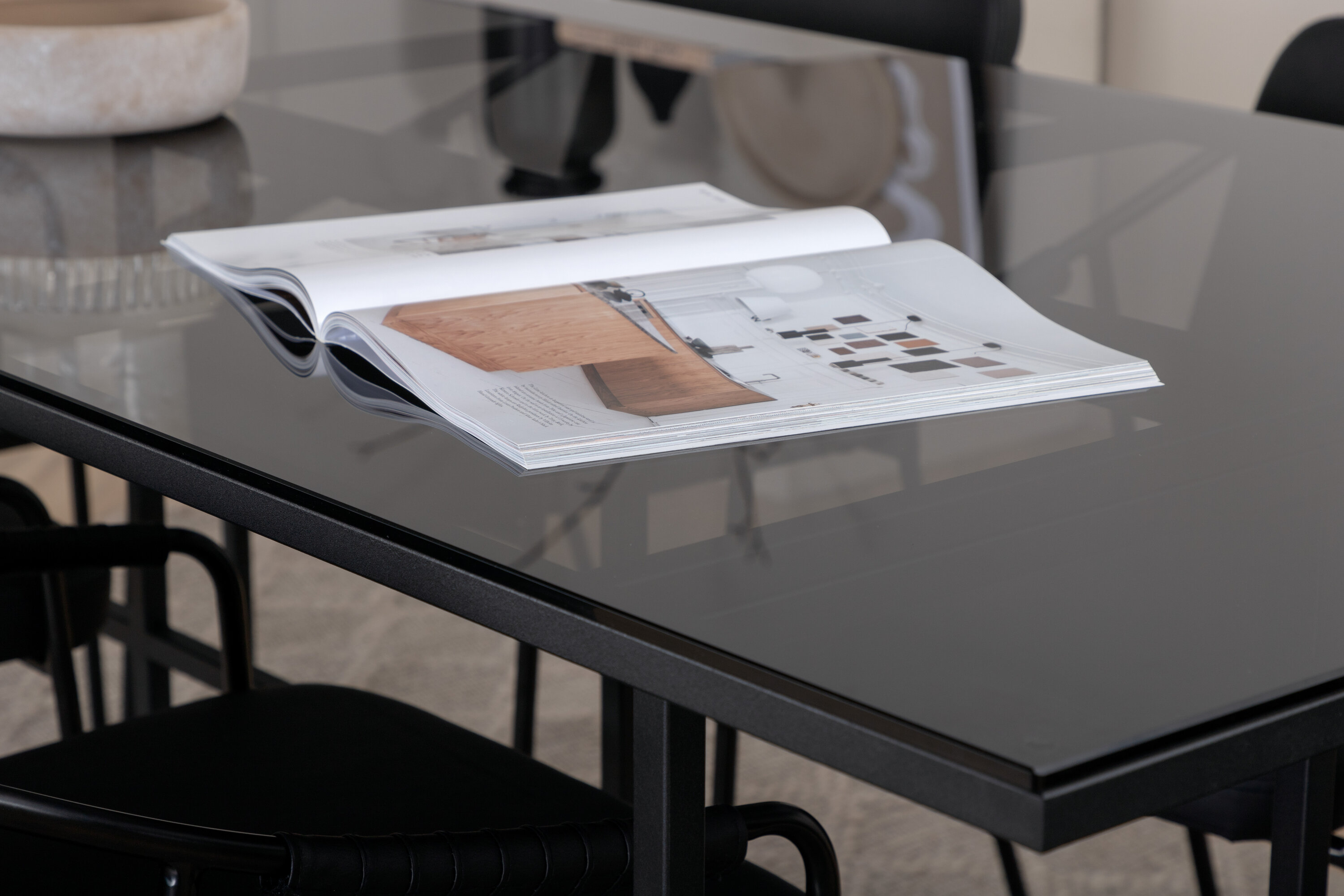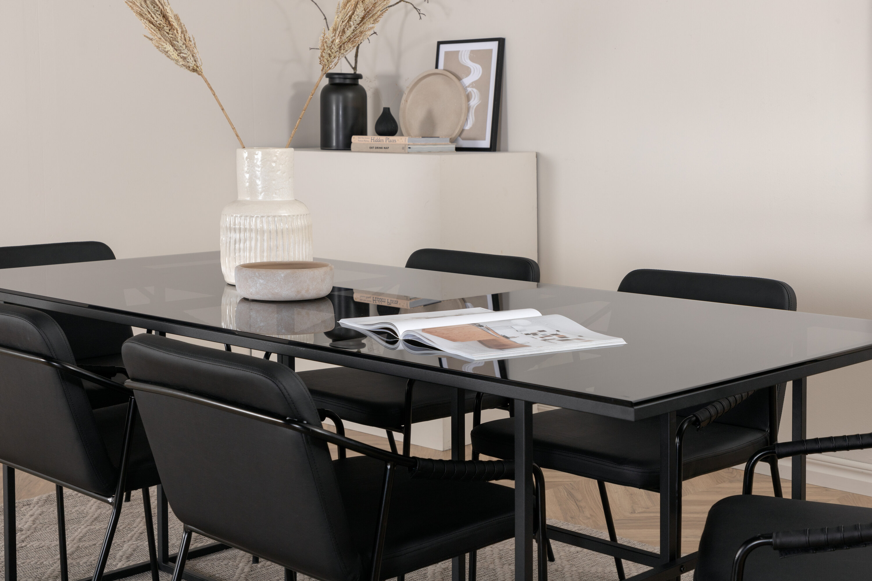 Viige oma sisustus uuele tasemele sihvaka disainiga moodsa toidugrupiga! Söögilaud Leif loob kiiresti pilgupüüdja, mis avaldab muljet oma tööstusliku välimuse ja sirgete minimalistlike vormidega. Pealmine plaat on suitsumustast klaasist stiilse terviku jaoks ja korpus mustast metallist. Laua mõõdud: pikkus: 200 cm, laius: 90 cm, kõrgus: 74 cm. Siin on täiuslik kombinatsioon 4 õhukese disainiga vaidlustooliga. Istmed on mustast kunstnahast ning neil on integreeritud käetoed ning mustast rauast toolijalad. Tooli mõõdud: kõrgus: 77 cm, istme kõrgus: 48 cm, laius: 53 cm, sügavus: 59 cm. Las söögilauas veedetud aeg saab üheks tänase päeva tipphetkeks!