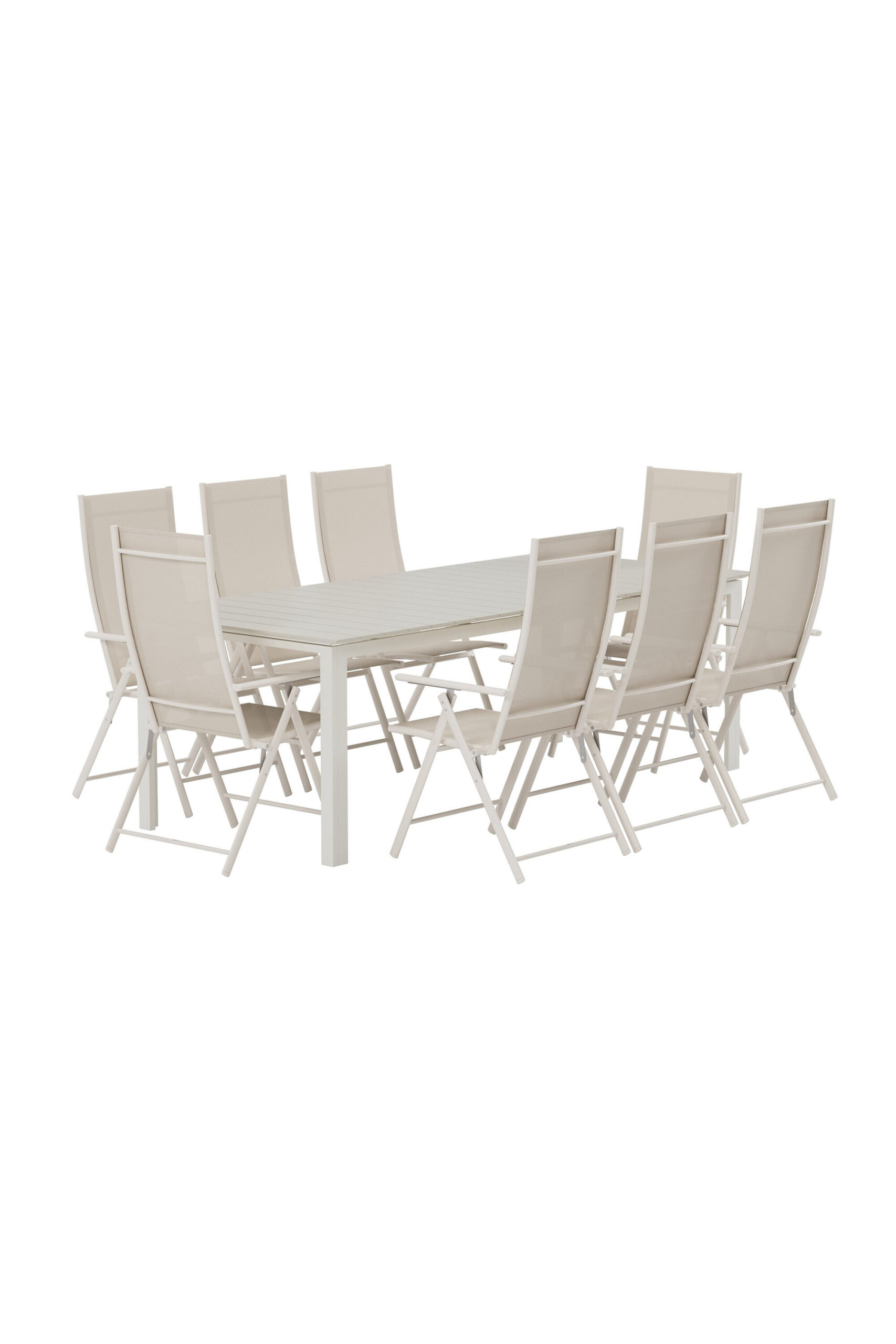 Looge stiilne ja funktsionaalne välisöögituba selle moodsa söögikomplektiga, mis ühendab praktilised Lavenzo toolid elegantse pikendatava Levelsi söögilauaga. Lavenzo söögitool on loodud pakkuma nii mugavust kui ka paindlikkust. Beež terasraam annab kaasaegse välimuse, samas kui tekstiilist iste pakub mugavat ja kergesti hooldatavat istumiskogemust. Tool on kokkuklapitav ja varustatud reguleeritava seljatoega, mis teeb istumisasendi kohandamise lihtsaks – ideaalne kõigeks alates einest kuni lõõgastavate hetkedeni päikese käes. Nutikas valik, kui soovite stiili ja praktiliste omaduste kombinatsiooni.