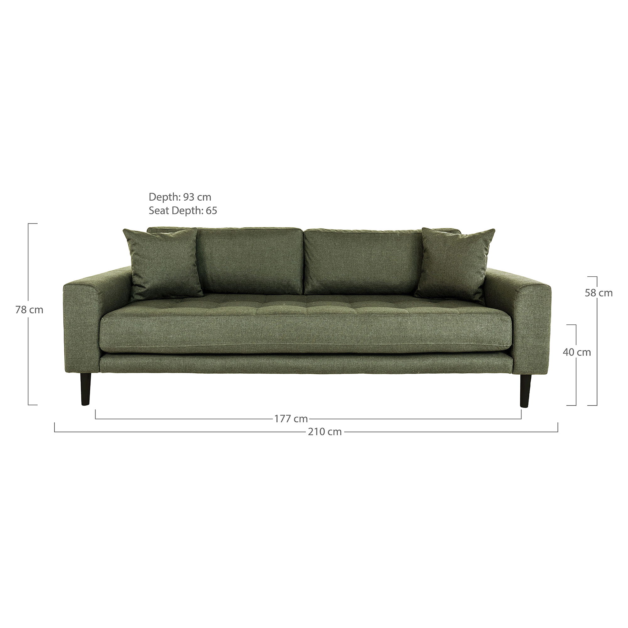 Lido 3-kohaline diivan, oliivroheline, kahe padja ja mustade puidust jalgadega