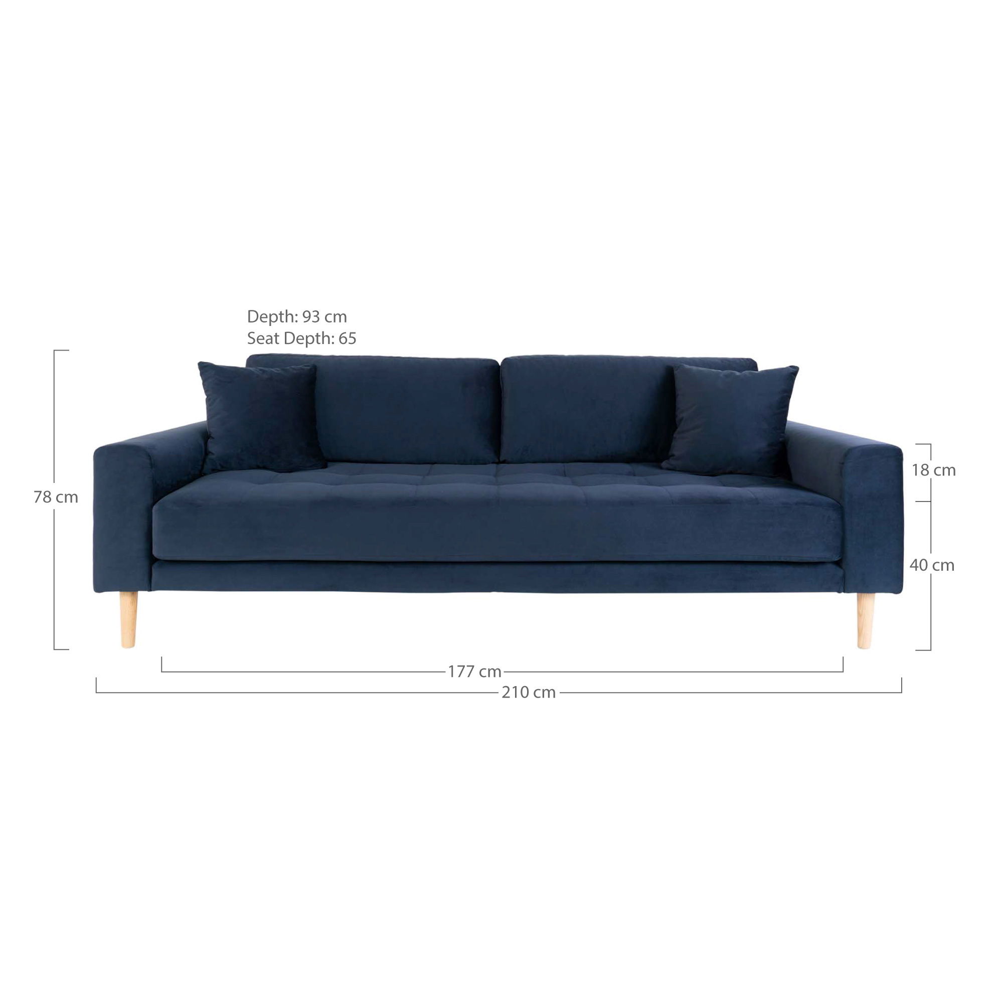 Lido 3-kohaline diivan, tumesinine samet, kahe padja ja naturaalsest puidust jalgadega