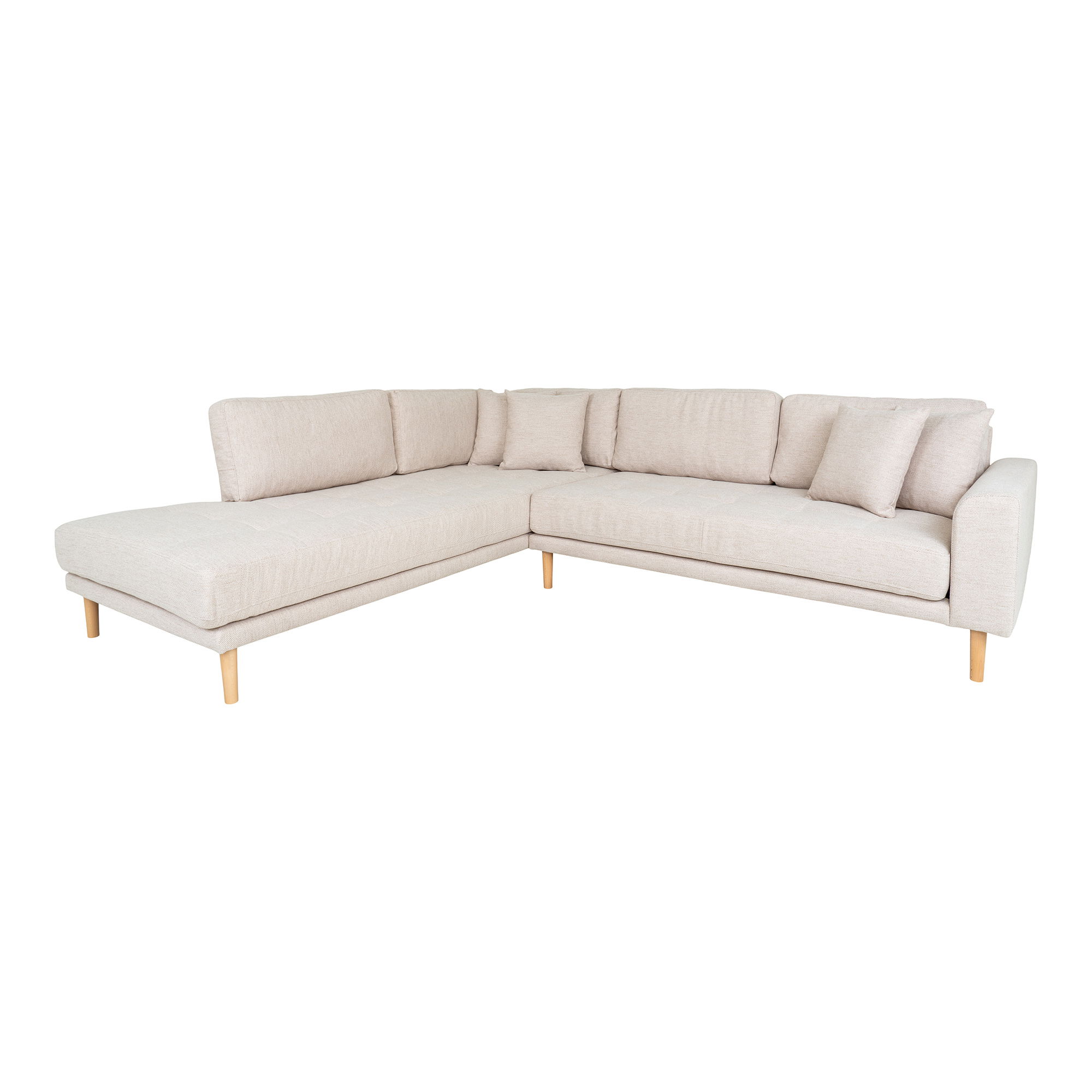 Lido nurgadiivan avatud otsaga, vasakpoolne liivakarva, nelja padja ja naturaalsest puidust jalgadega