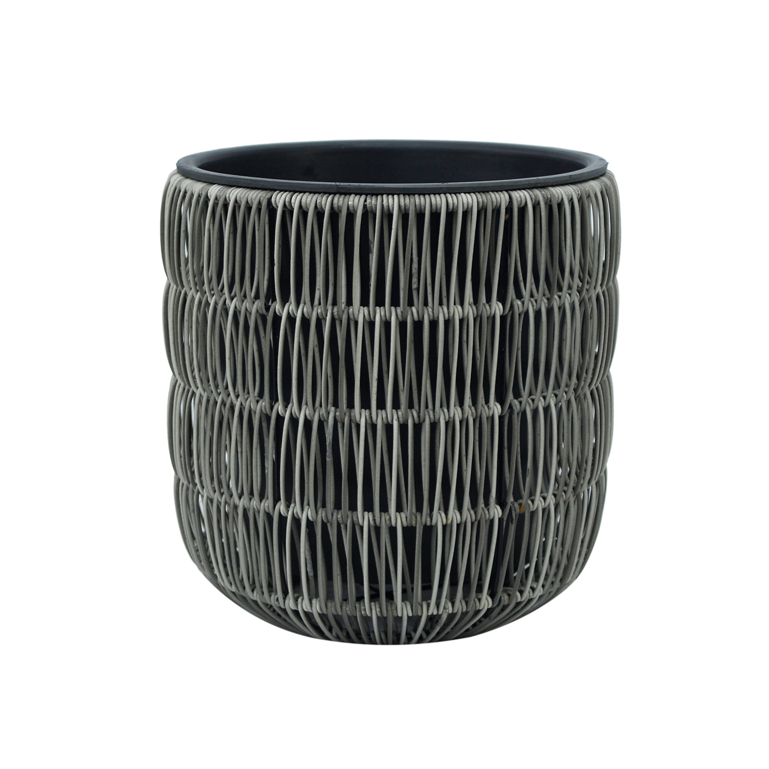 Lillepott WICKER D27xH28cm, hall. Lillepoti metallraam on kaetud plastikpunutisega. Plastikust sisepoti mõõdud on D23xH23cm. Sisepott on ilma auguta.