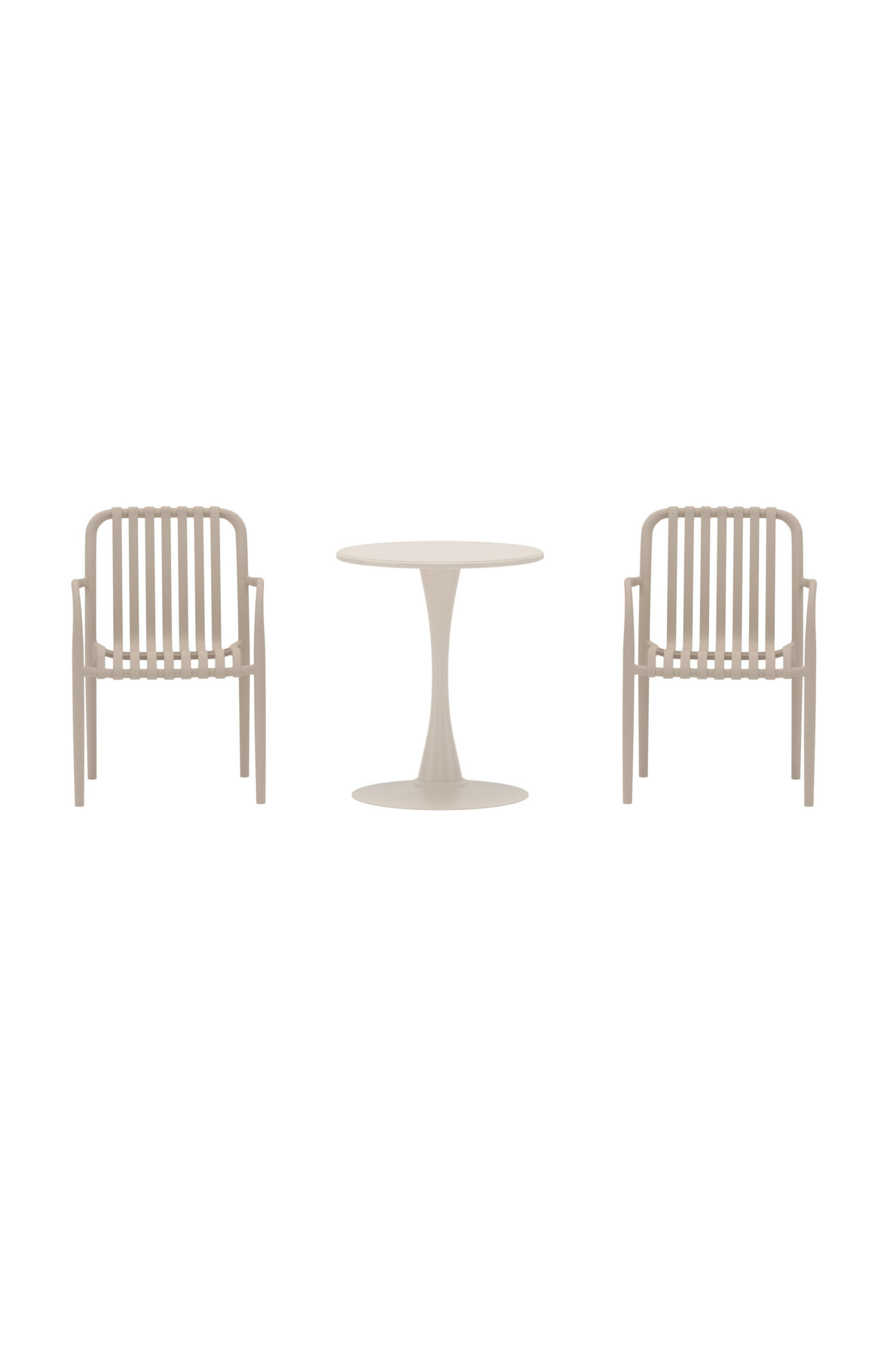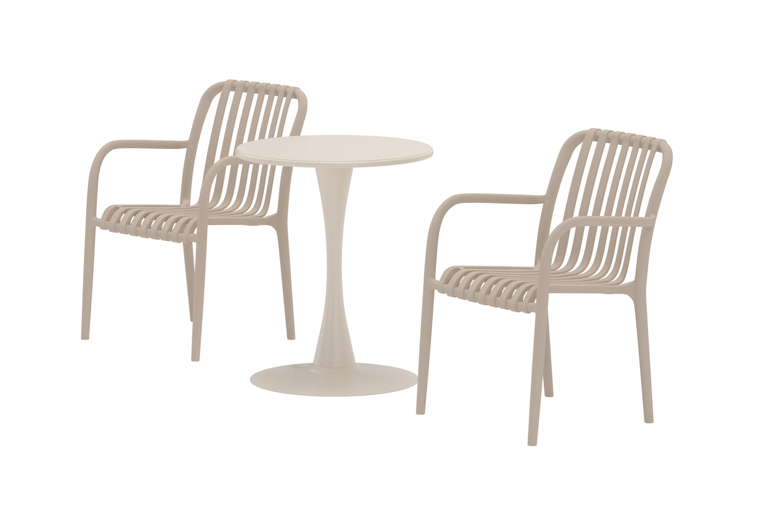 Beežis Limnos kohvik on stiilne ja praktiline lahendus rõdule, terrassile või aeda. Komplekt koosneb kahest mugavast toolist ja ümarast ühtse disainiga lauast, mis loob moodsa ja harmoonilise välimuse. Ajatu beež värv võimaldab Limnos kergesti sulanduda erinevatesse keskkondadesse, muutudes kutsuvaks kohaks kohvikuks, hommikusöögiks või vaikseks hetkeks päikese käes.