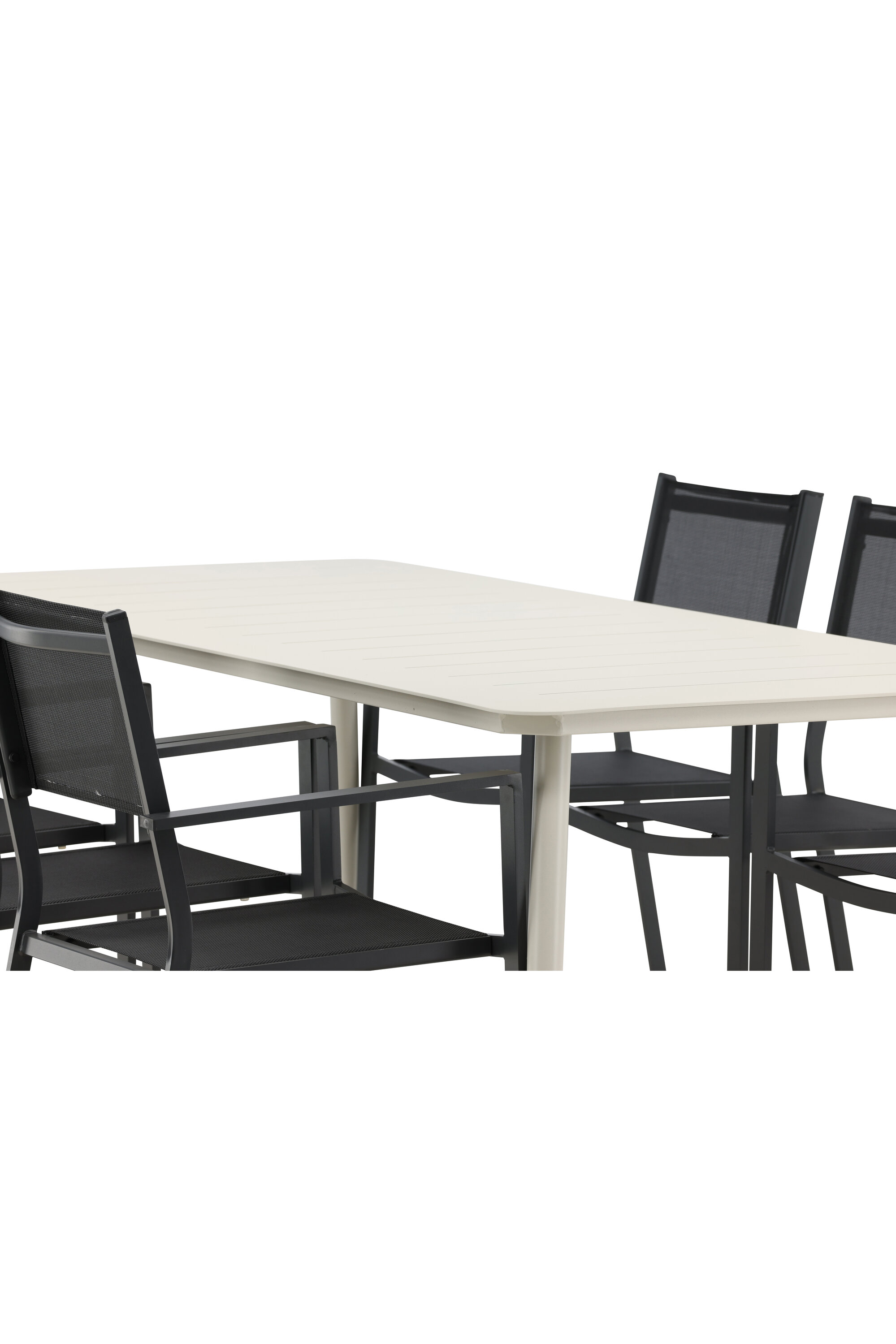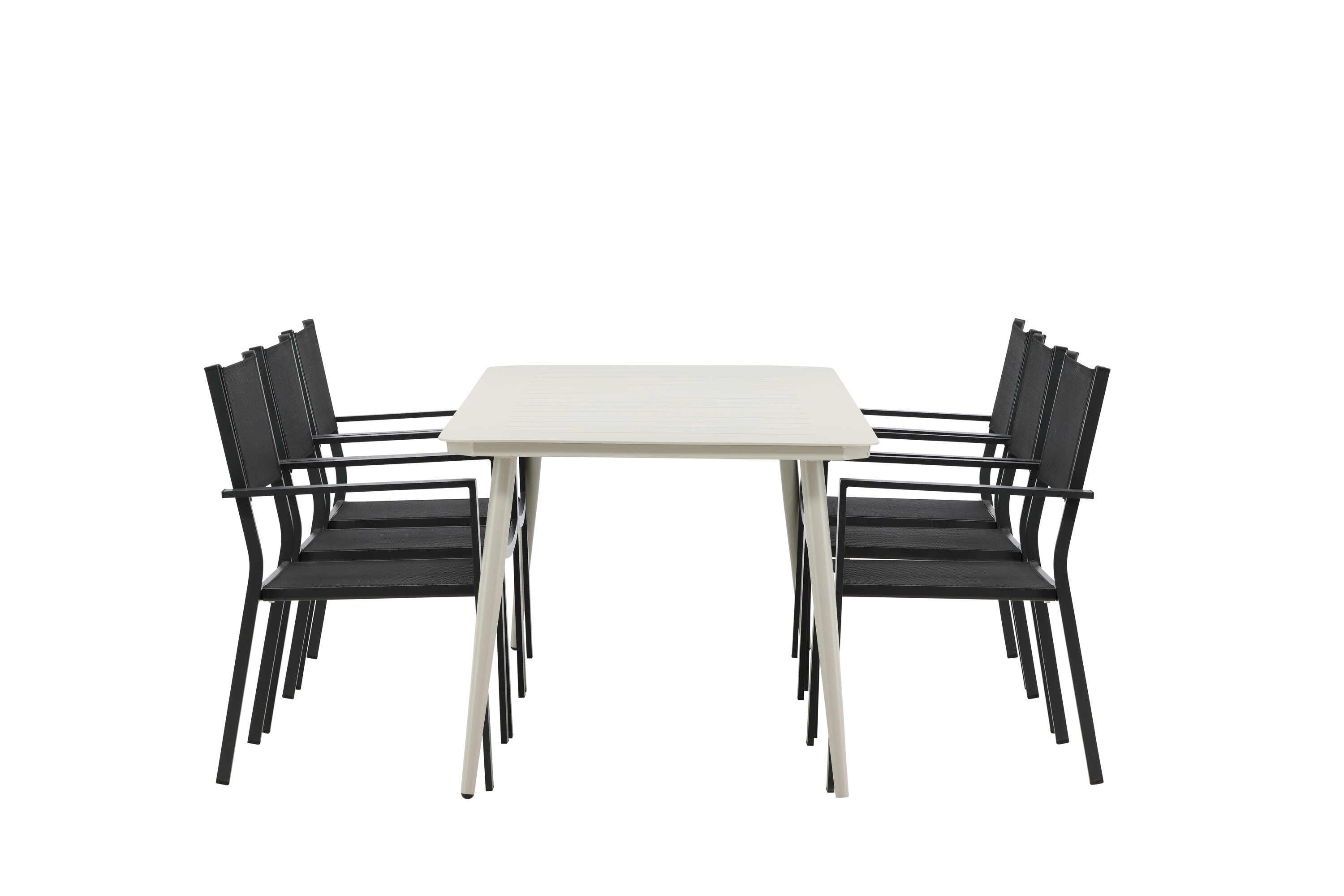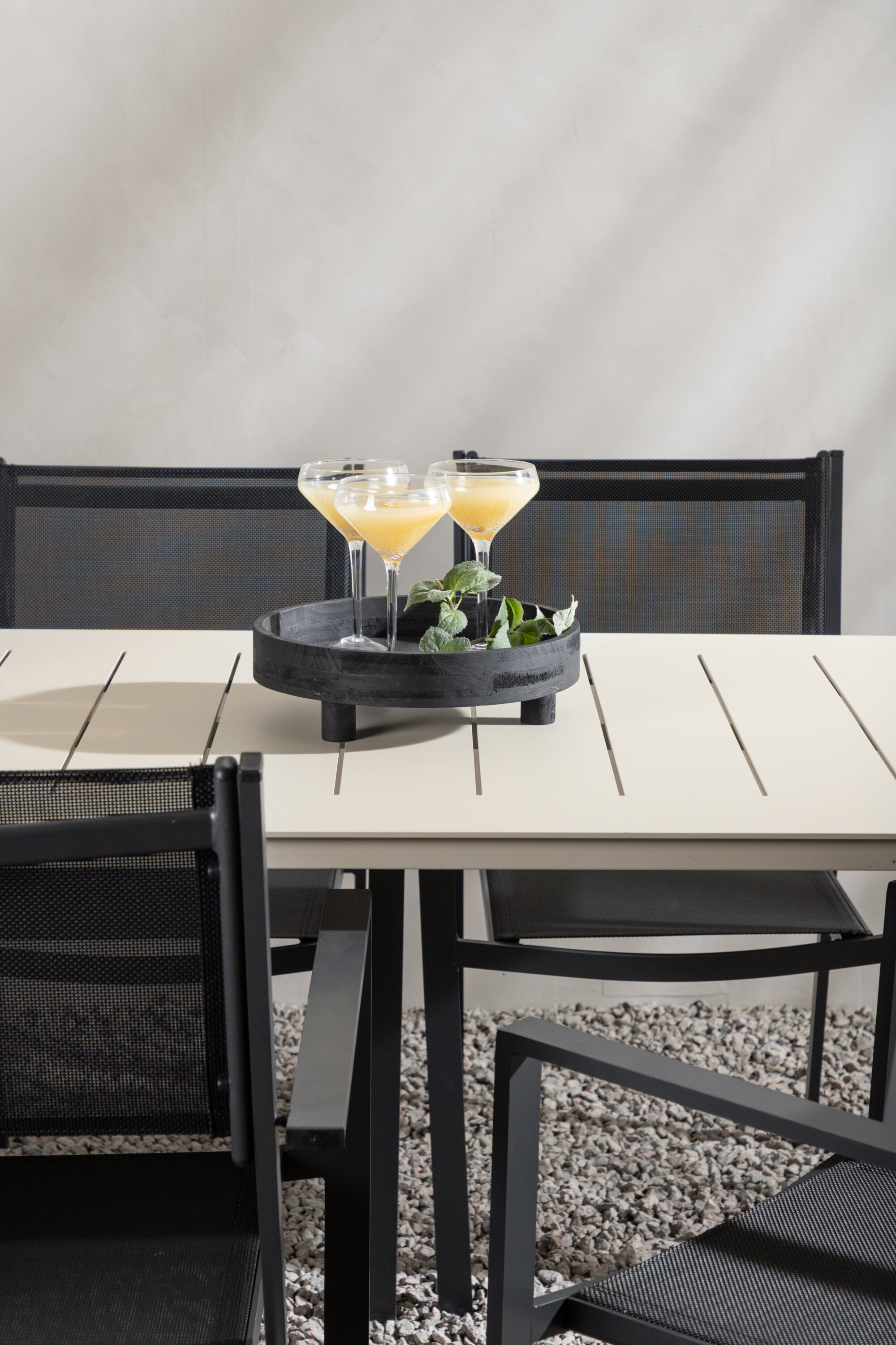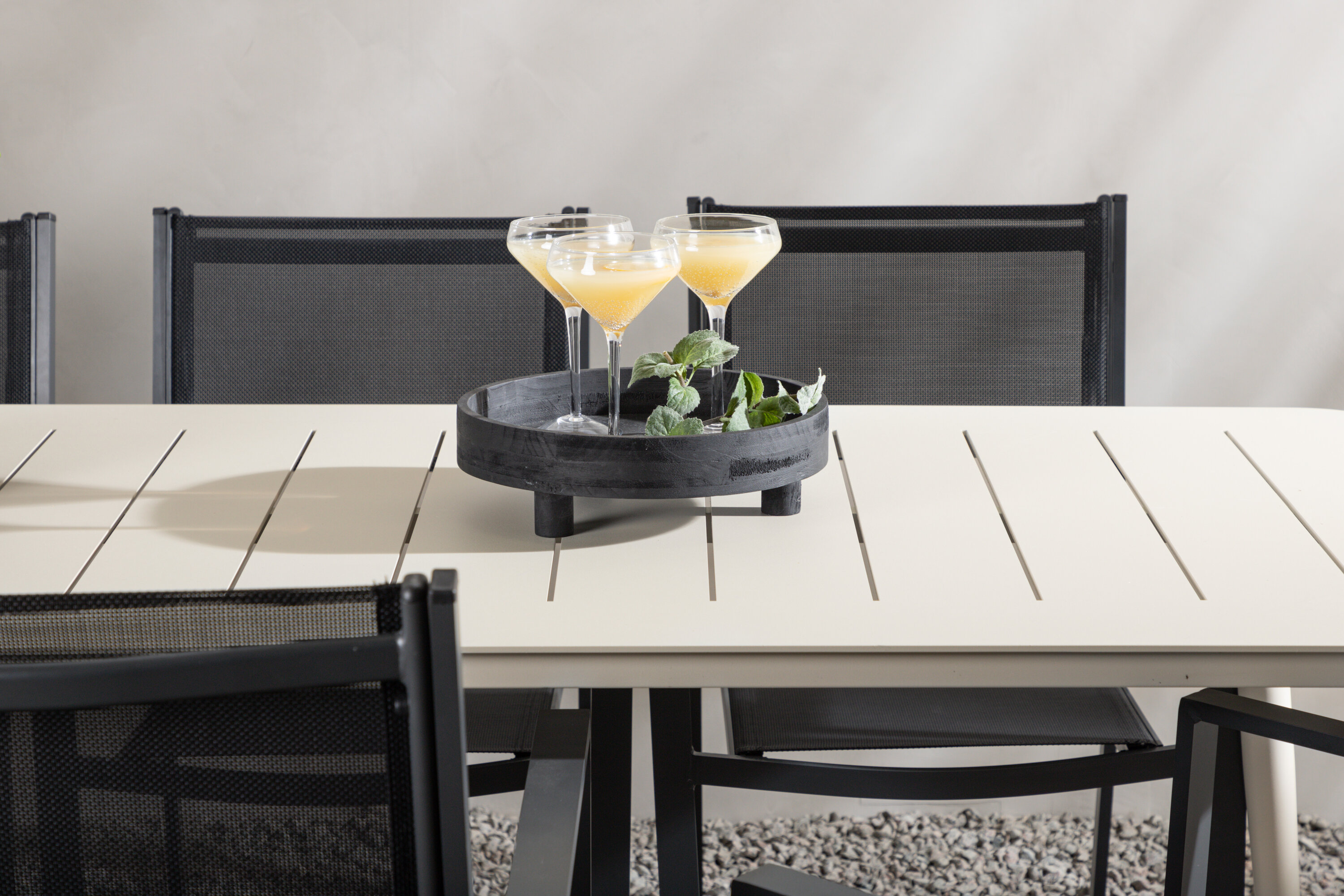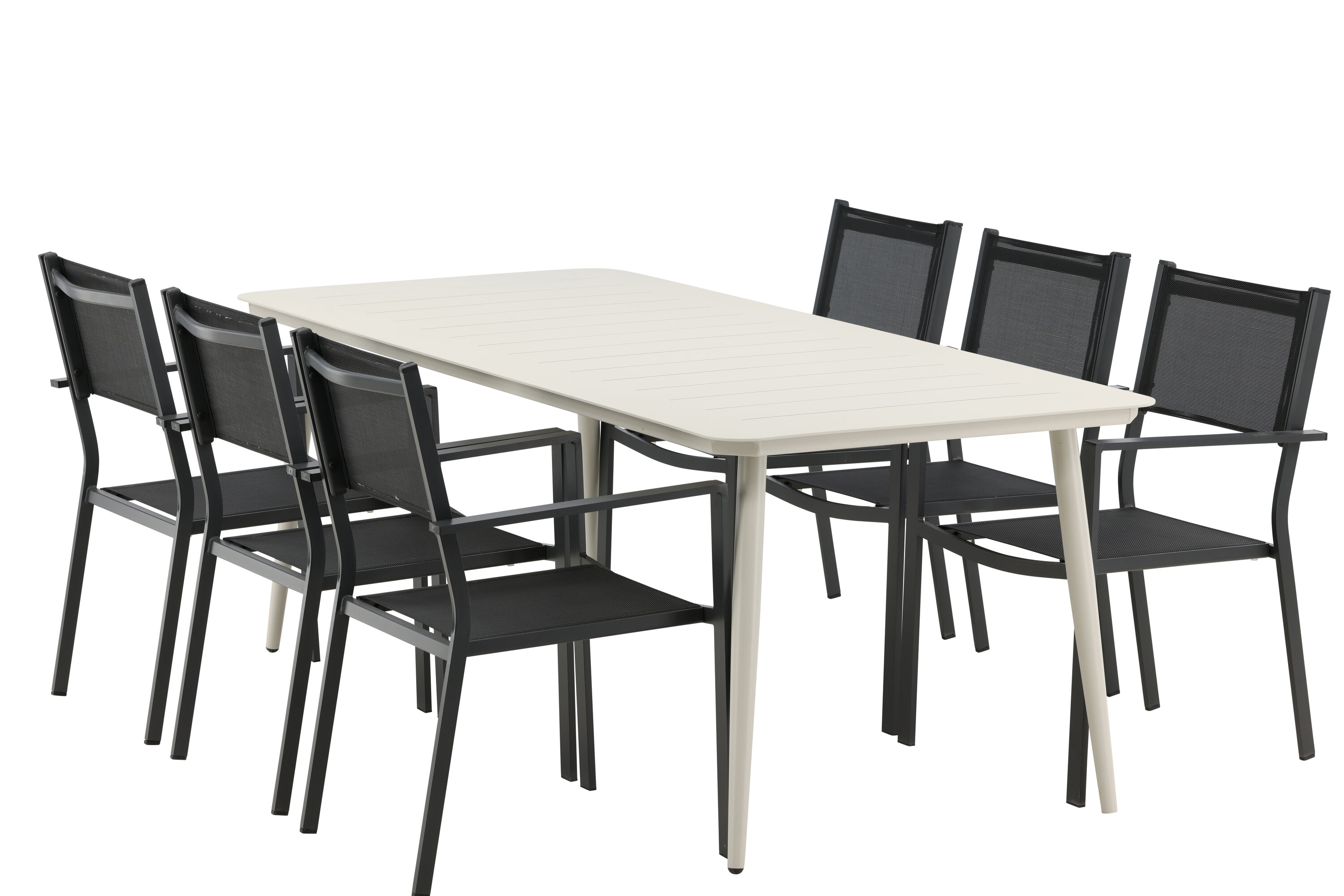It’s a match – kaasaegne värvikombinatsioon, mis loob õues moeteadliku mulje. Laud Lina on minimalistliku disainiga valgest/beežist terasest, ristkülikukujulise lauaplaadi ja pehmete ümarate servadega. Lauajalad on kergesti laienevad ja jätavad ühtlase mulje. Mõõdud: 200×90 cm. Siin koos mugavate Copacabana seeria söögitoolidega. Toolid on põhjamaise sirge kujuga, integreeritud alumiiniumist käetugedega ja mustast tekstiilist istmega. Olgu siinne aeg päeva tipphetk!