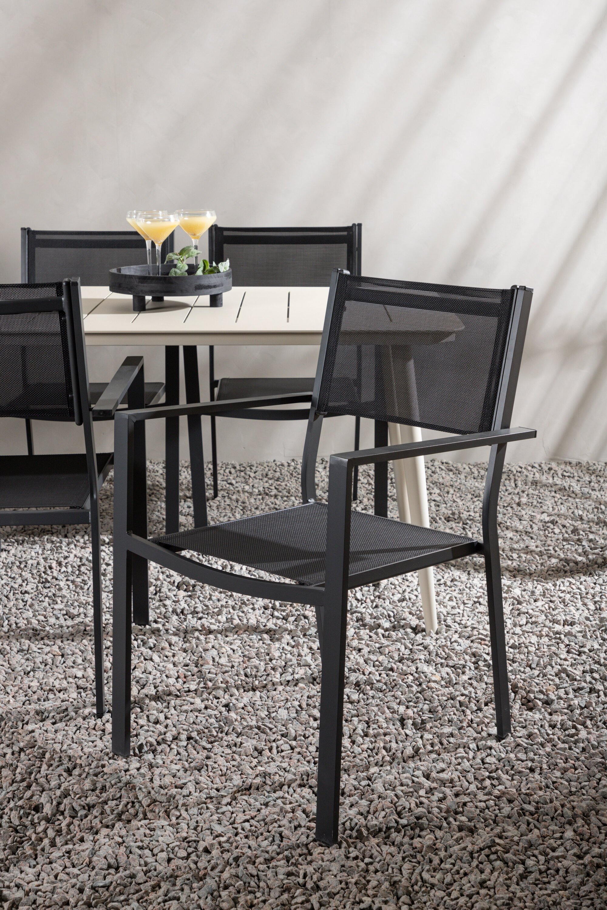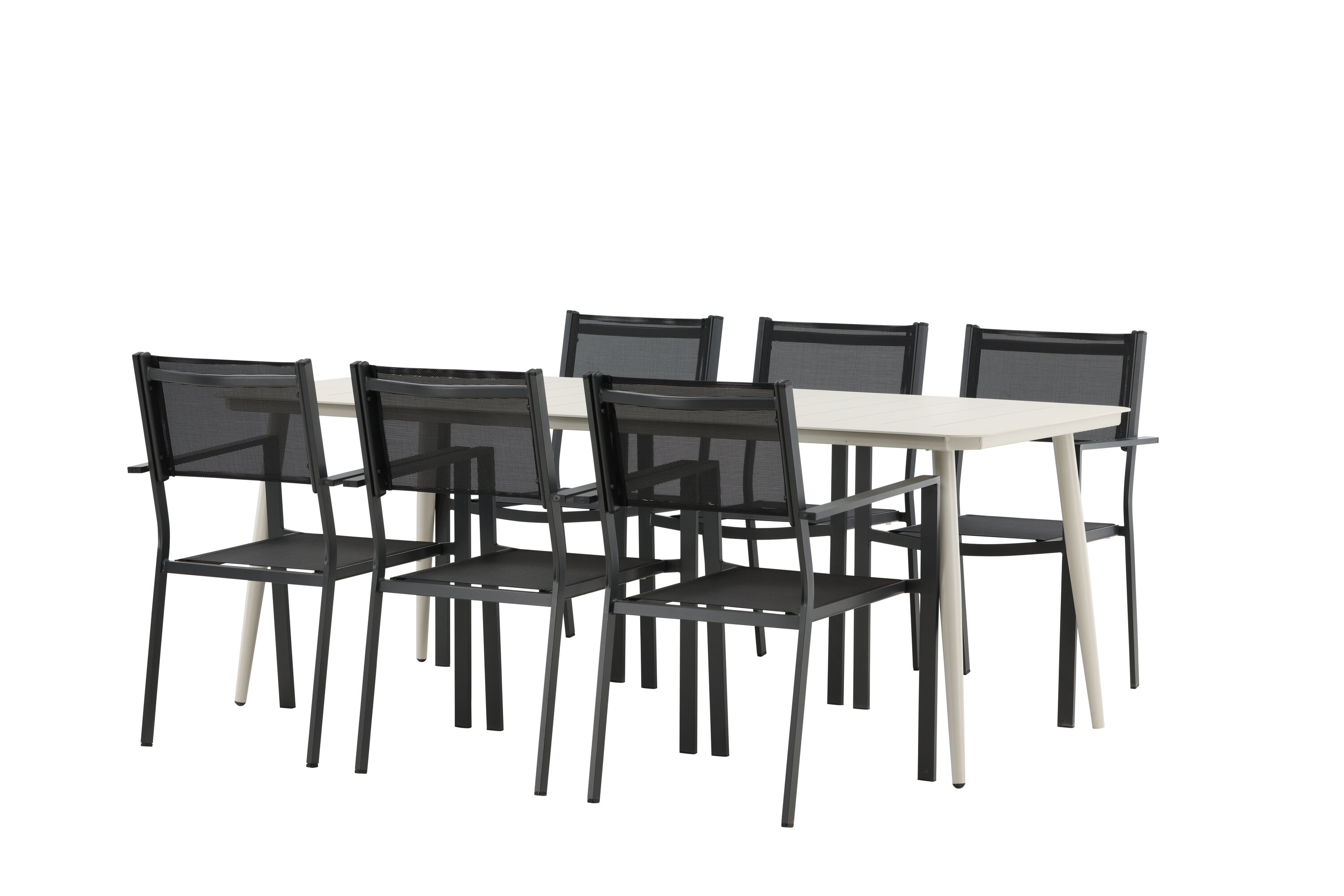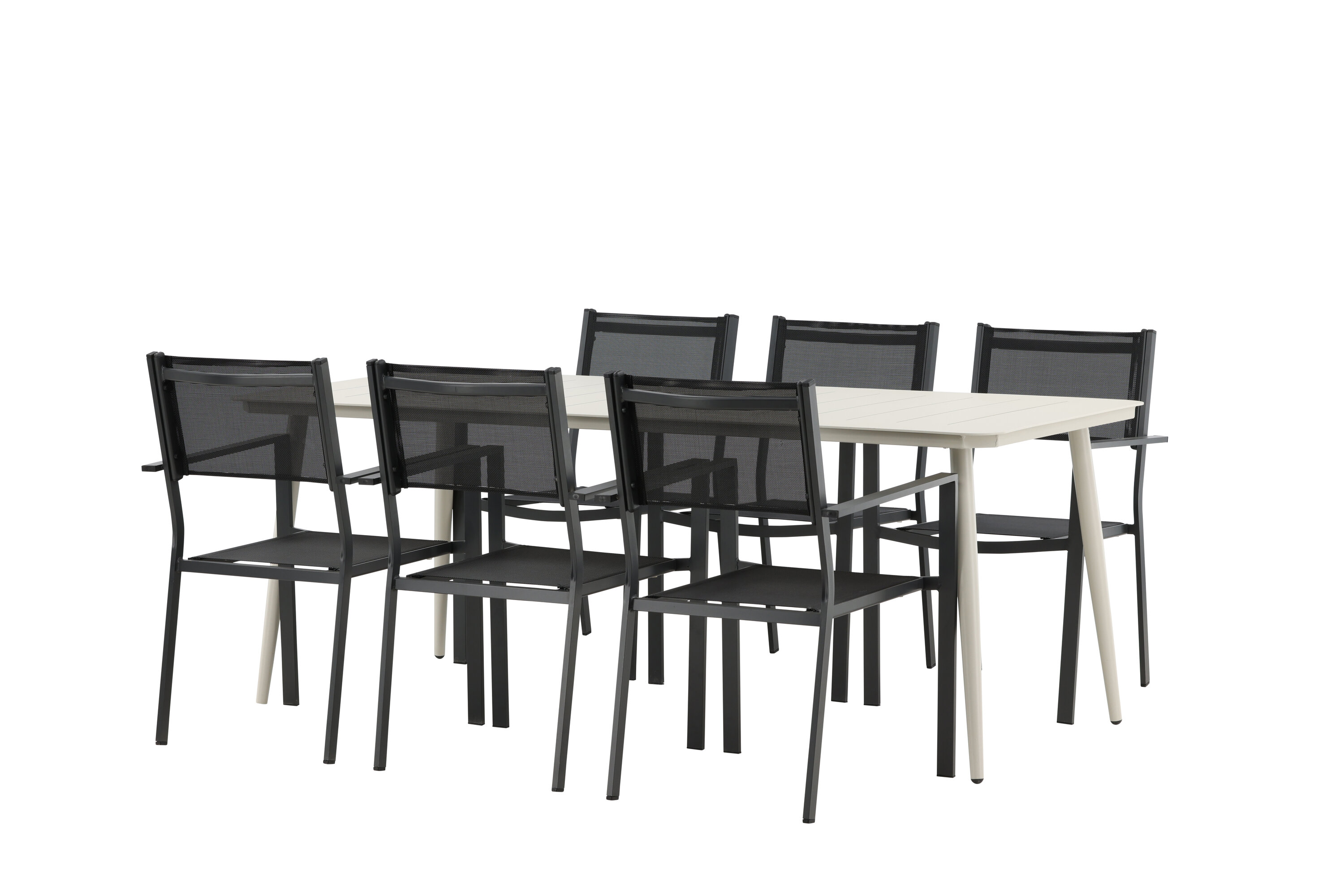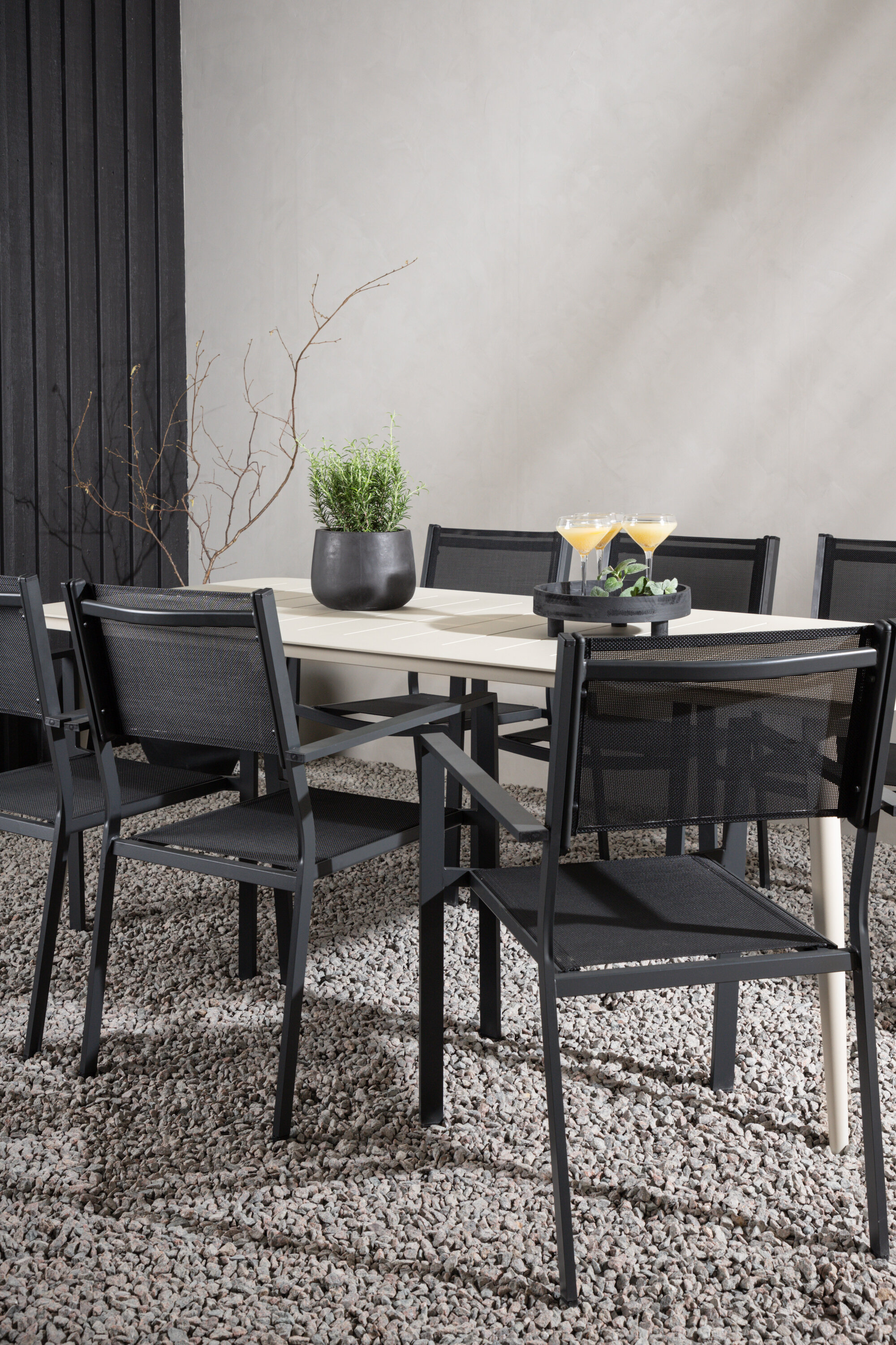 It’s a match – kaasaegne värvikombinatsioon, mis loob õues moeteadliku mulje. Laud Lina on minimalistliku disainiga valgest/beežist terasest, ristkülikukujulise lauaplaadi ja pehmete ümarate servadega. Lauajalad on kergesti laienevad ja jätavad ühtlase mulje. Mõõdud: 200×90 cm. Siin koos mugavate Copacabana seeria söögitoolidega. Toolid on põhjamaise sirge kujuga, integreeritud alumiiniumist käetugedega ja mustast tekstiilist istmega. Olgu siinne aeg päeva tipphetk!