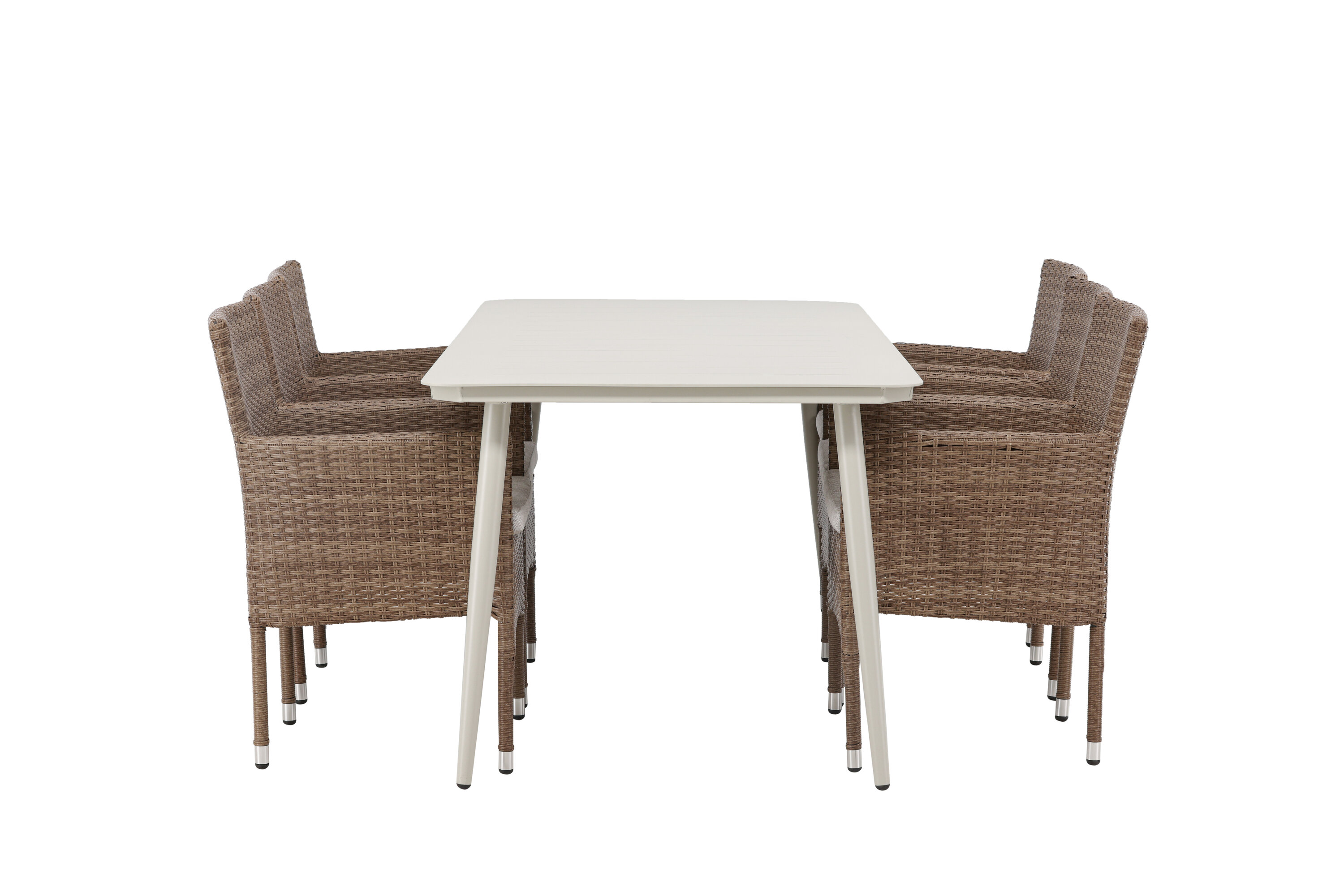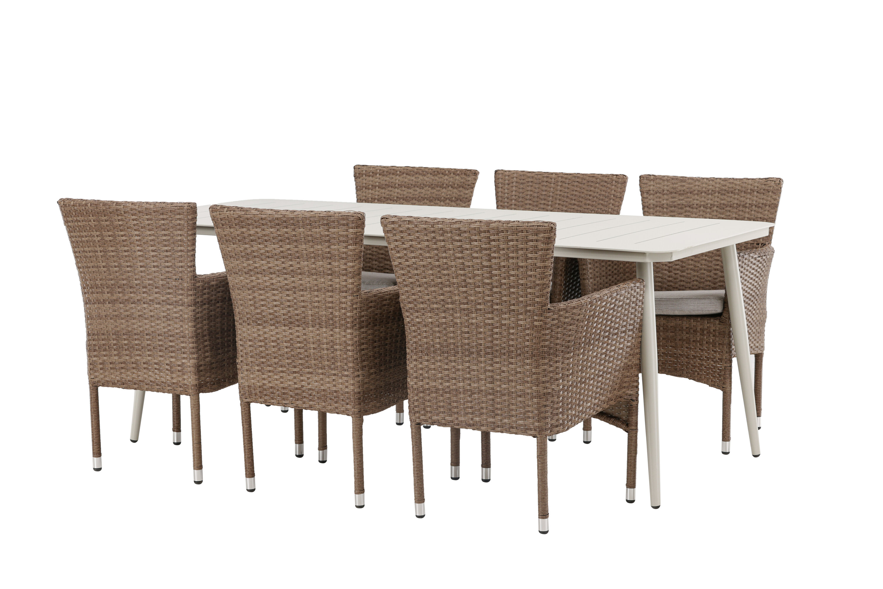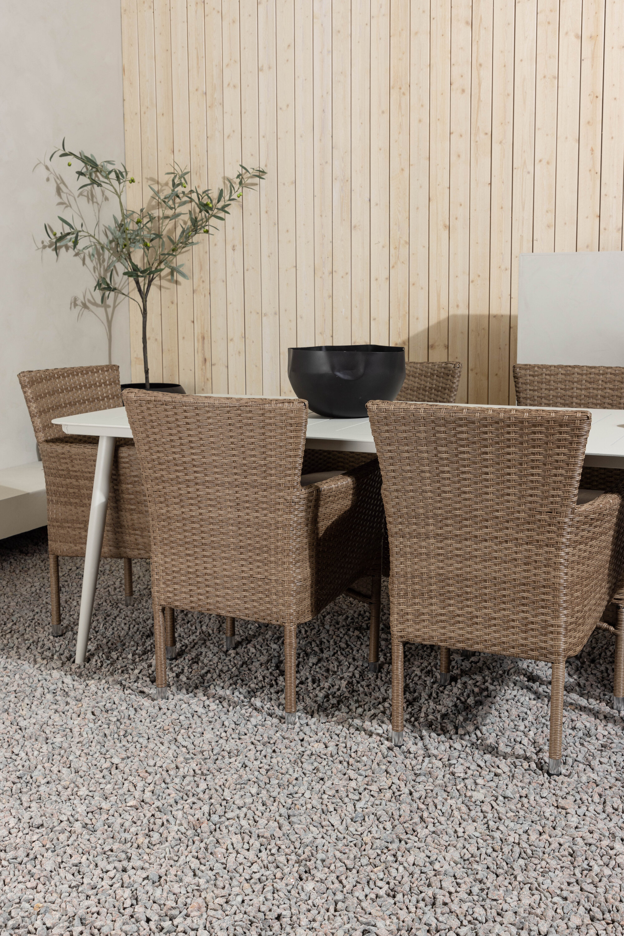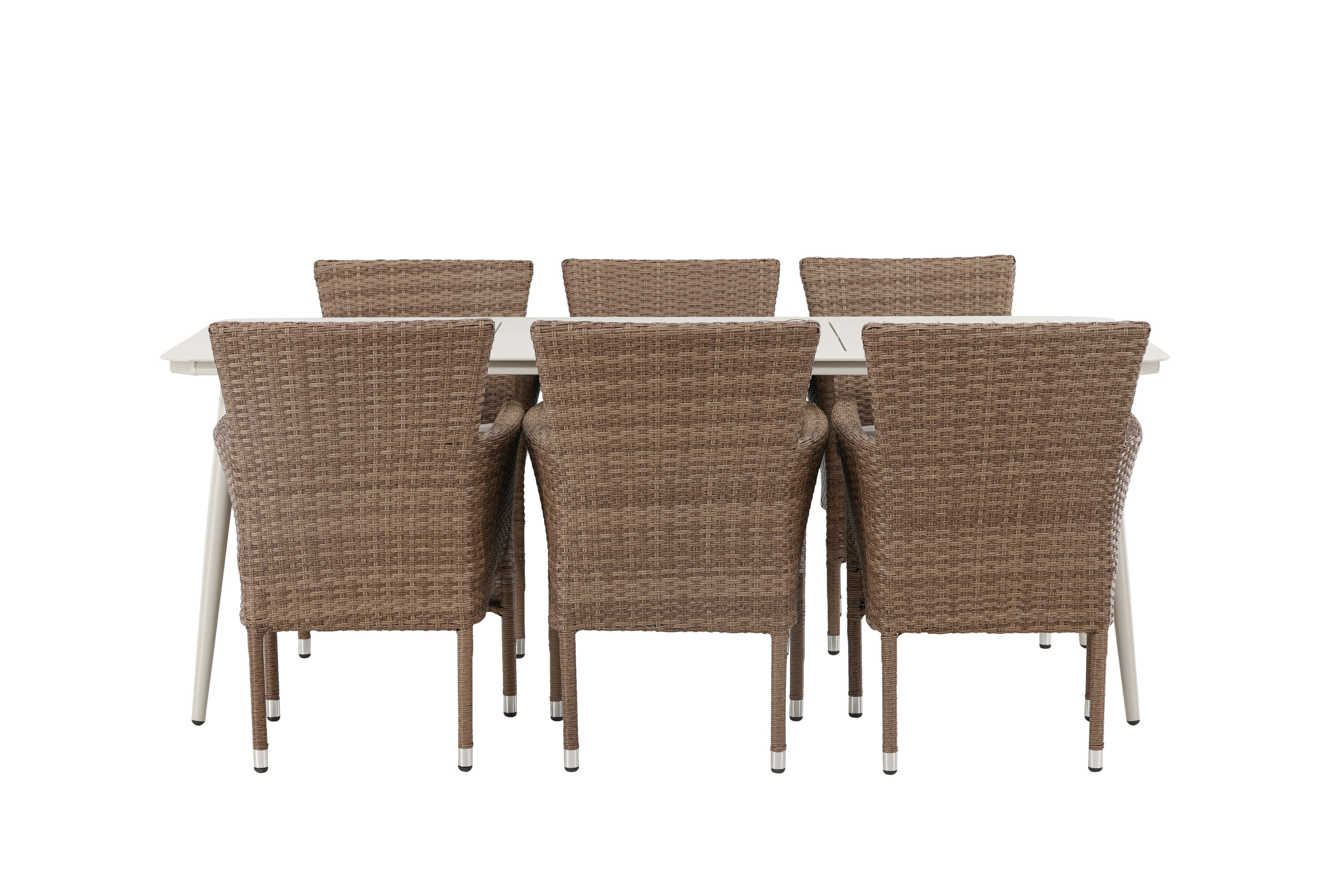Täiuslik kombinatsioon kõrgest mugavusest ja stiilsest disainist – see söögigrupp sobib igaks juhuks! Söögilaual Lina on ristkülikukujuline minimalistliku disainiga kate ja kergelt laienevad jalad, mis on ühtlaselt valmistatud beežist terasest. Siin on suurepärane kombinatsioon Malina sarja söögitoolidega. Toolil on alumiiniumraam ja maalähedases beežis kunstrotangist. Istuge sel suvel mugavalt ja nautige maitsvaid eineid õues! Laua mõõdud: 200x90cm.