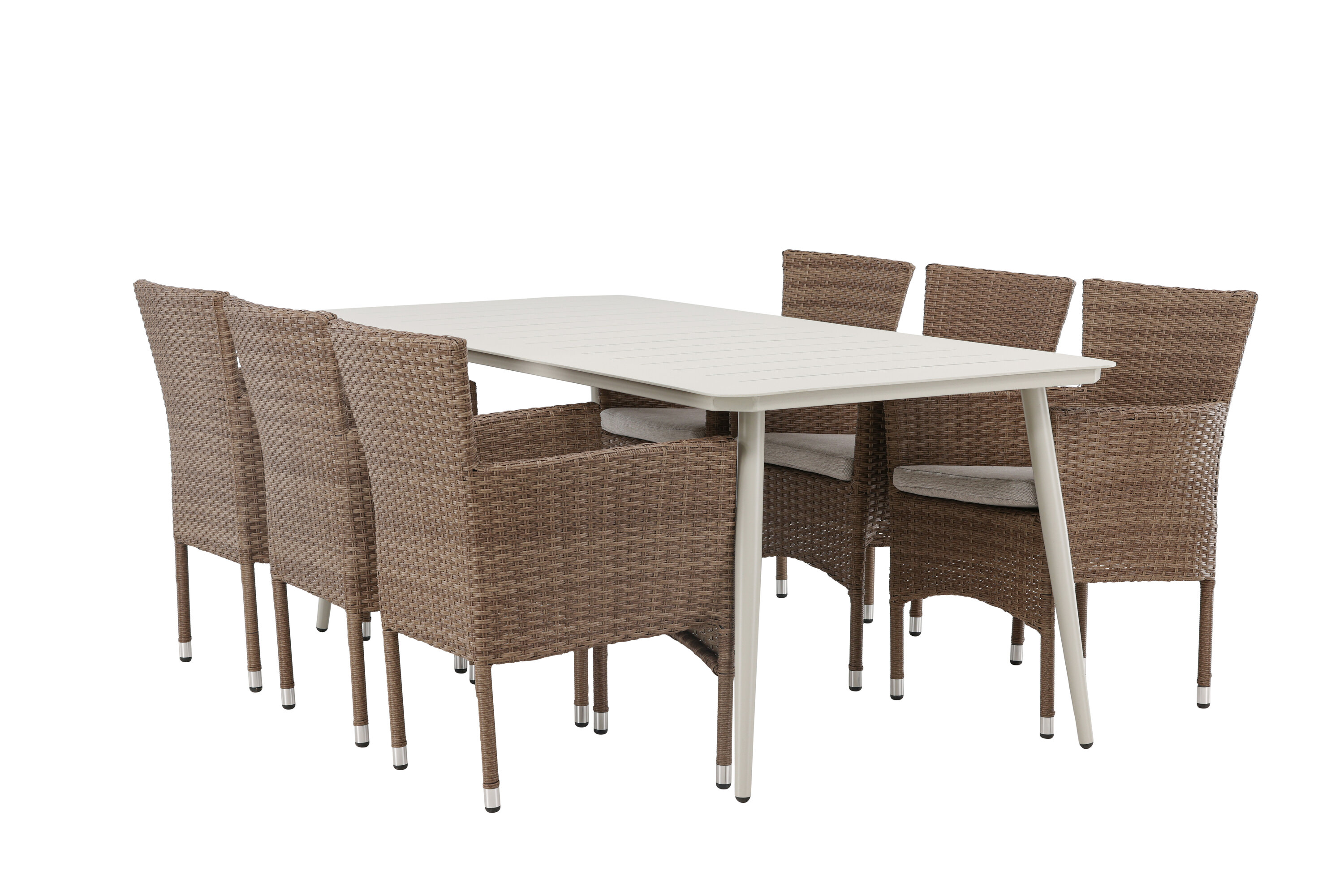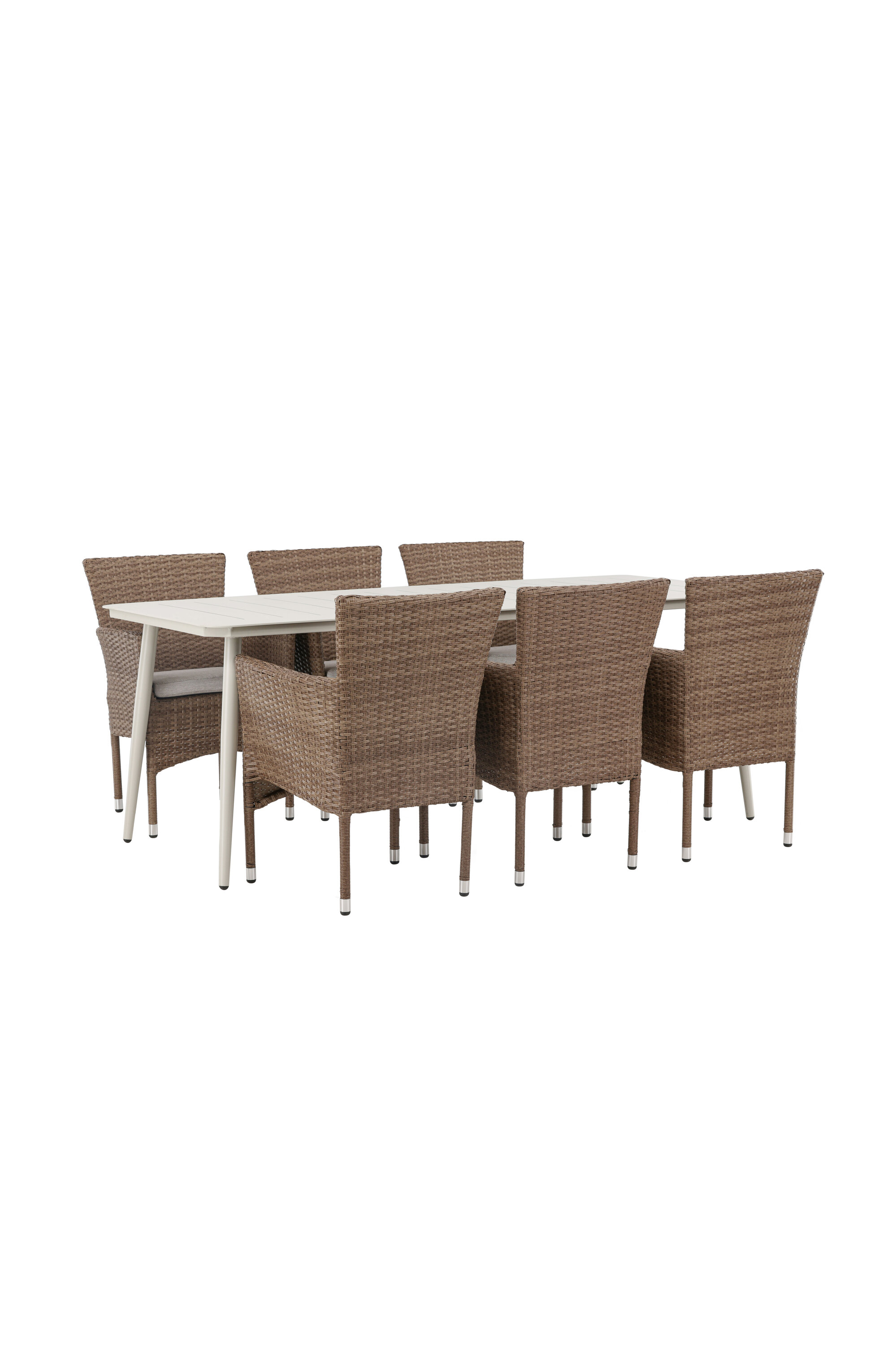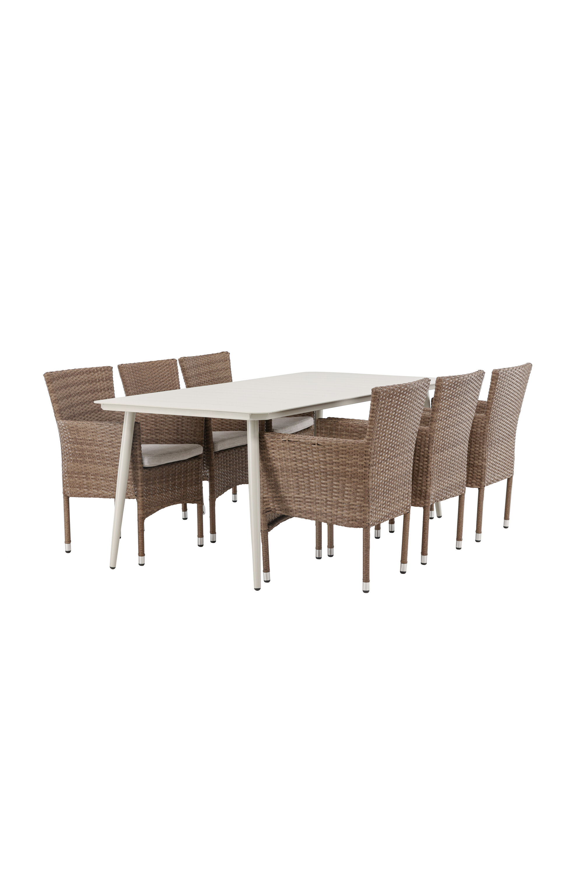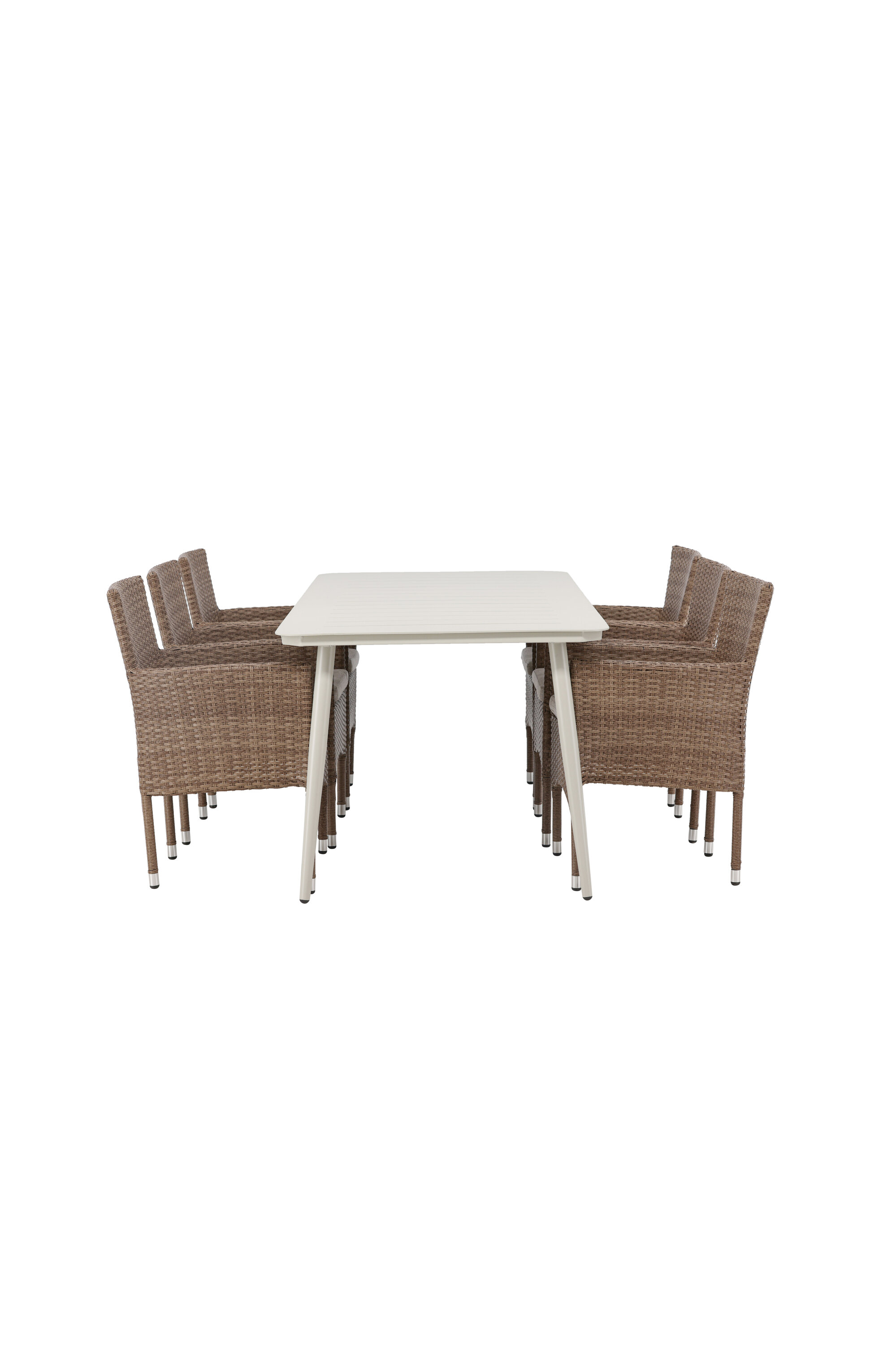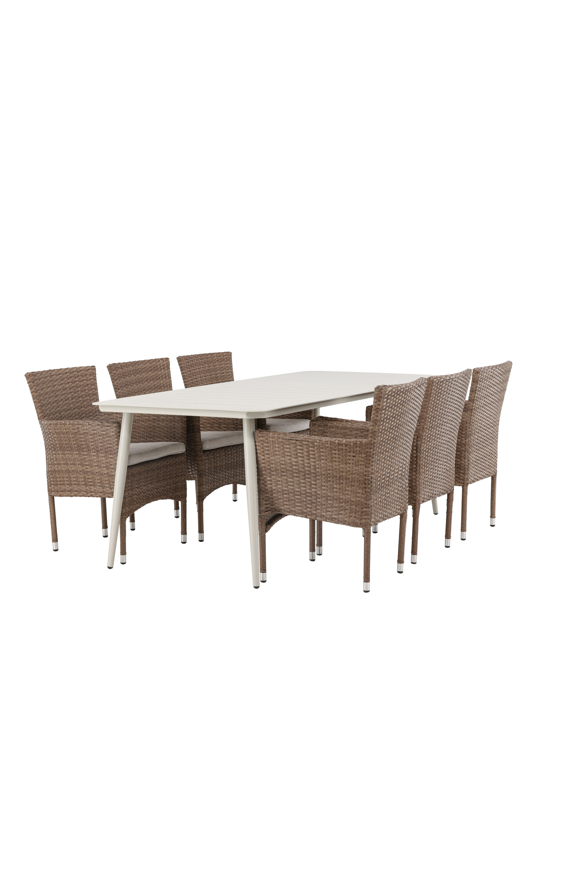 Täiuslik kombinatsioon kõrgest mugavusest ja stiilsest disainist – see söögigrupp sobib igaks juhuks! Söögilaual Lina on ristkülikukujuline minimalistliku disainiga kate ja kergelt laienevad jalad, mis on ühtlaselt valmistatud beežist terasest. Siin on suurepärane kombinatsioon Malina sarja söögitoolidega. Toolil on alumiiniumraam ja maalähedases beežis kunstrotangist. Istuge sel suvel mugavalt ja nautige maitsvaid eineid õues! Laua mõõdud: 200x90cm.