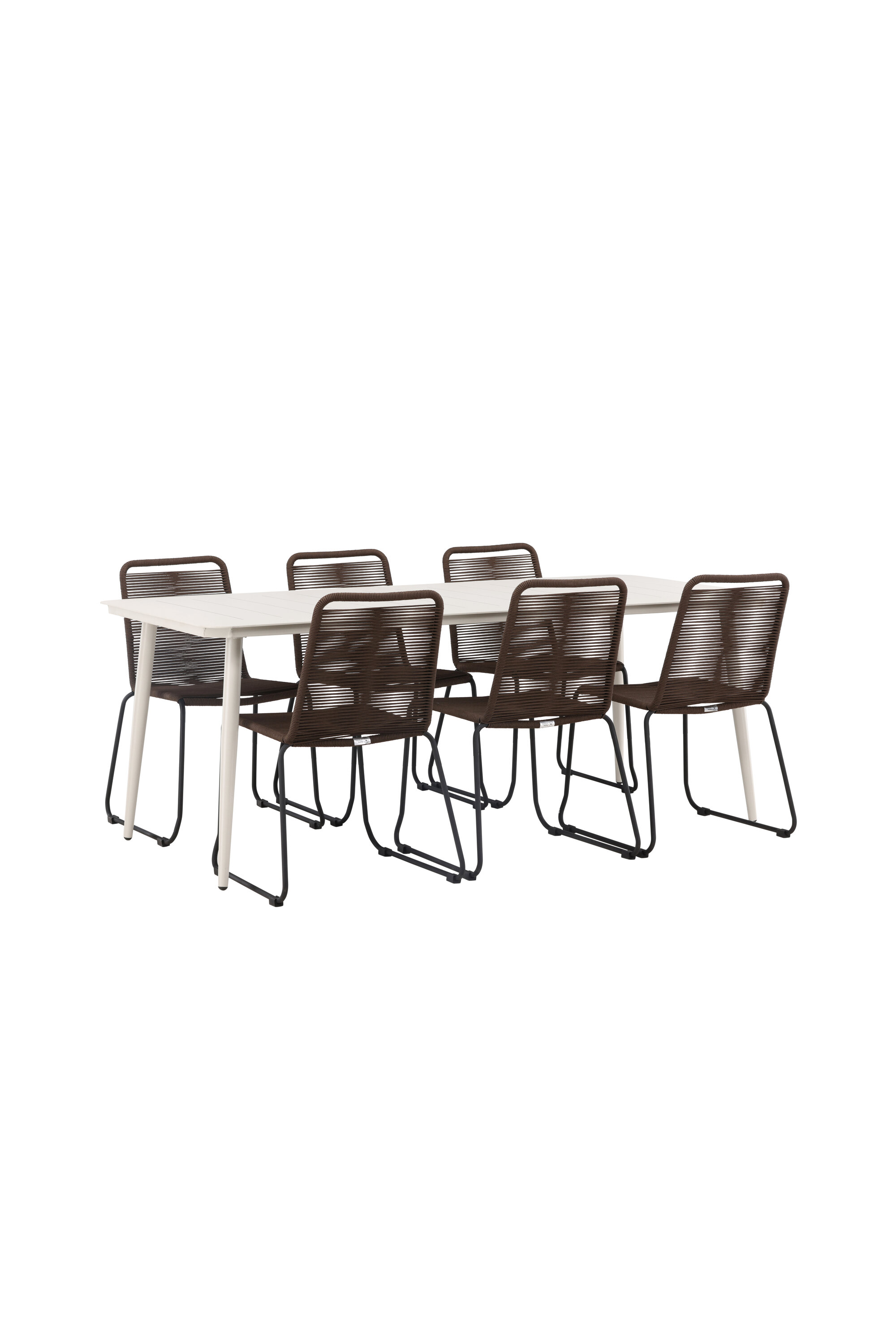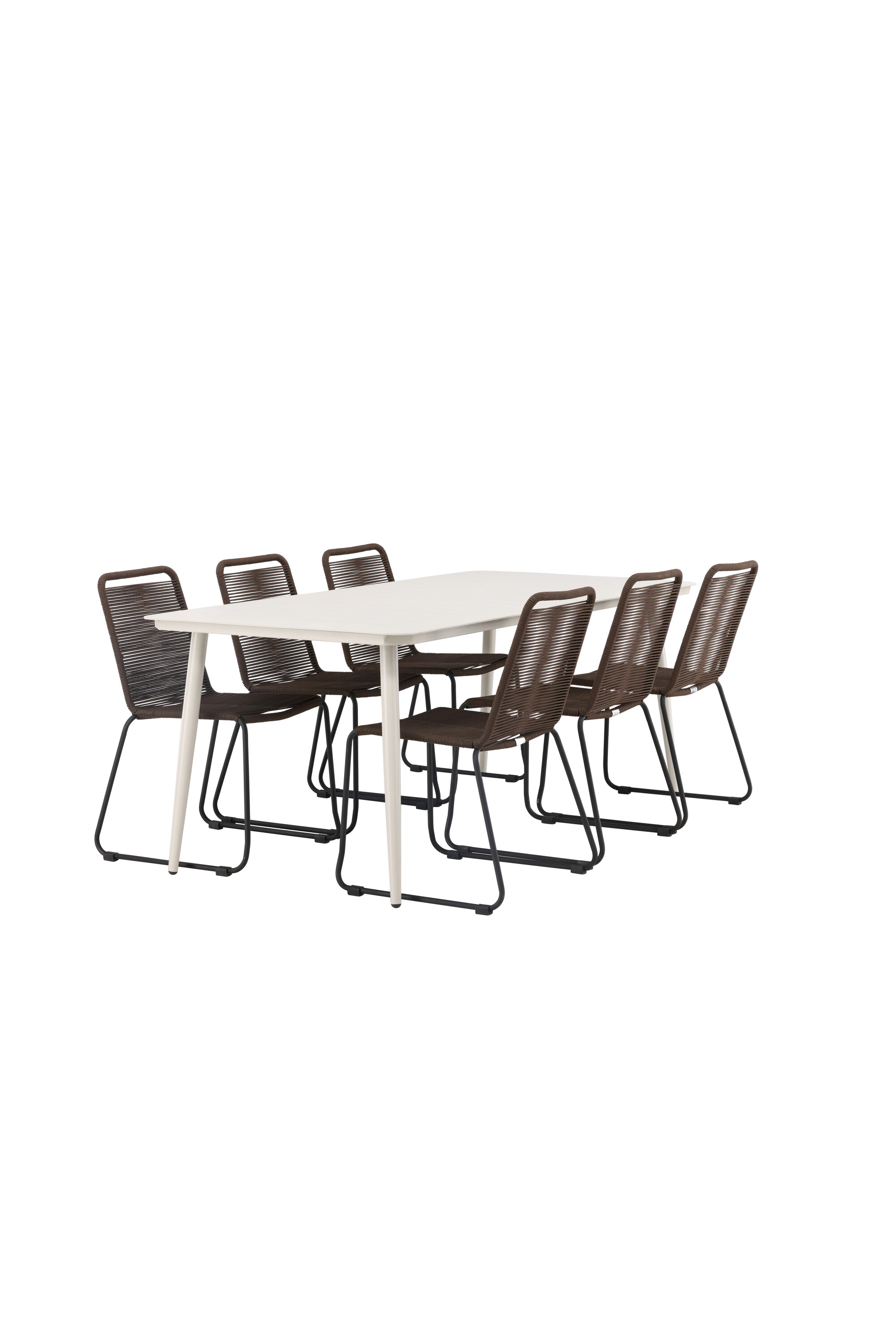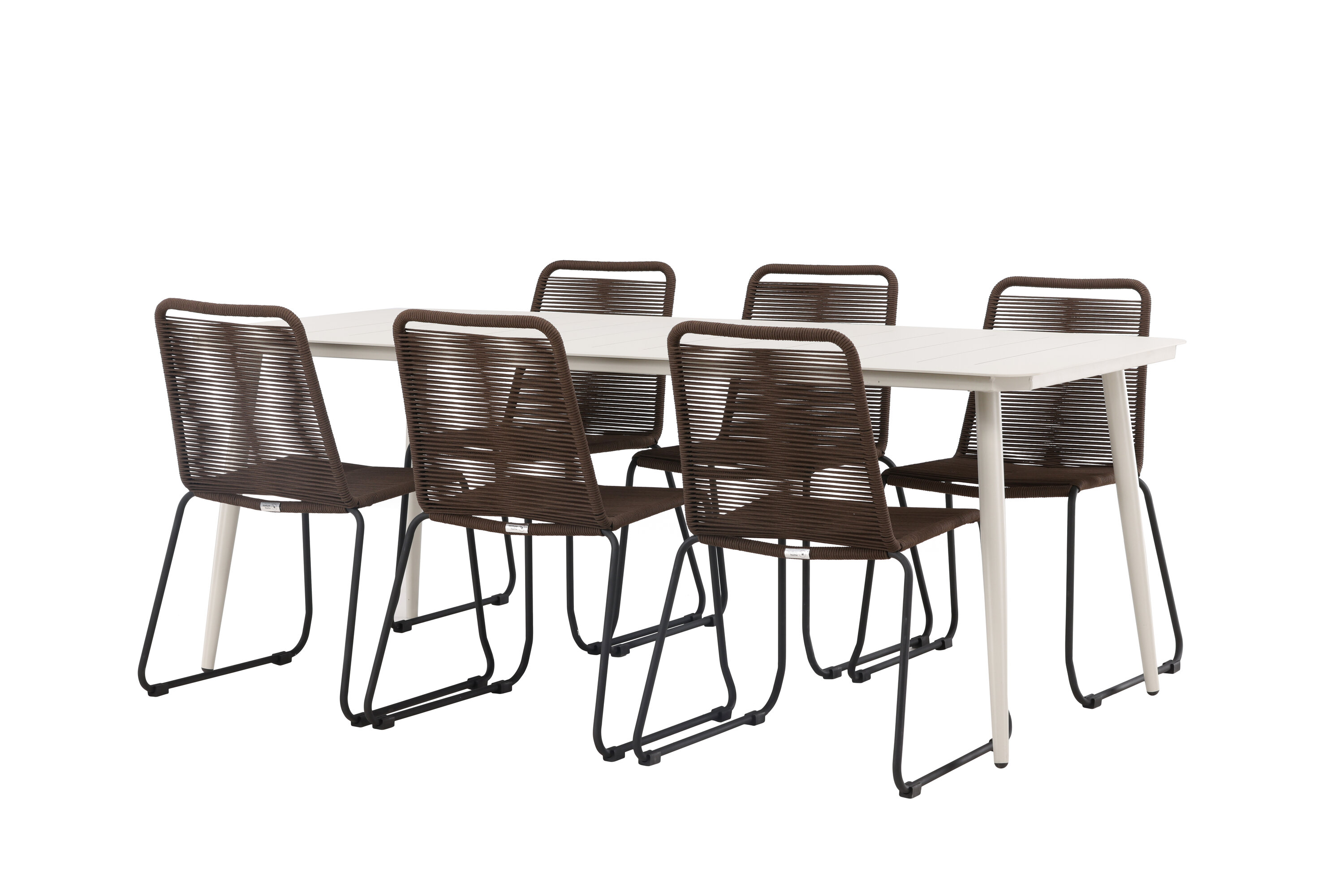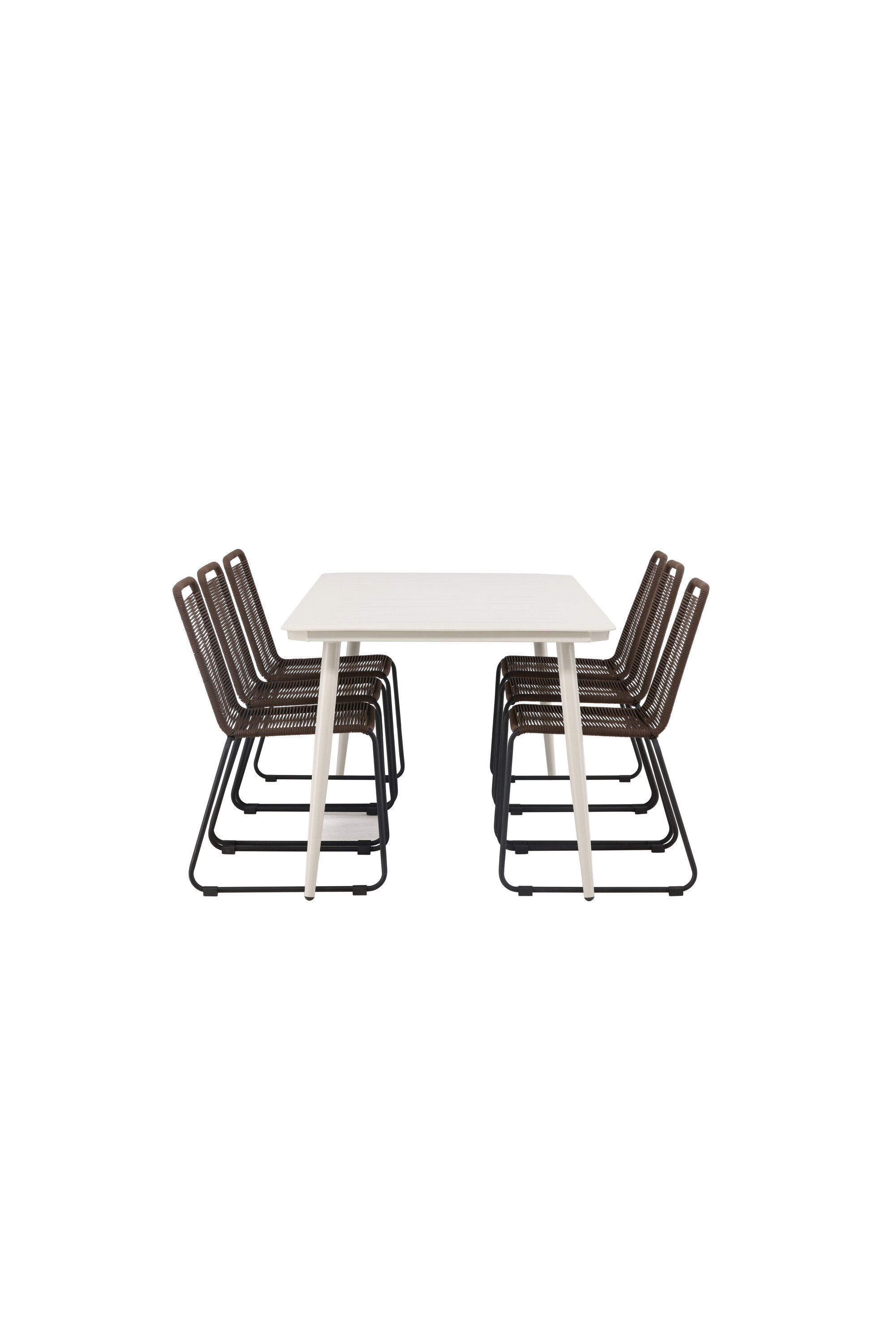 Täiesti trendidega kooskõlas kujundatud söögigrupp! Söögilaual Lina on ristkülikukujuline minimalistliku disainiga kate ja kergelt laienevad jalad, mis on ühtlaselt valmistatud beežist terasest. Siin koos kaasaegsete minimalistliku disainiga söögitoolidega Lindose seeriast. Toolil on populaarses pruunis toonis vastupidavast köiest valmistatud iste ja minimalistlik mustast terasest karkass. Olge sel suvel valmis silmapaistvaks ööeluks! Laua mõõdud: 200x90cm.
