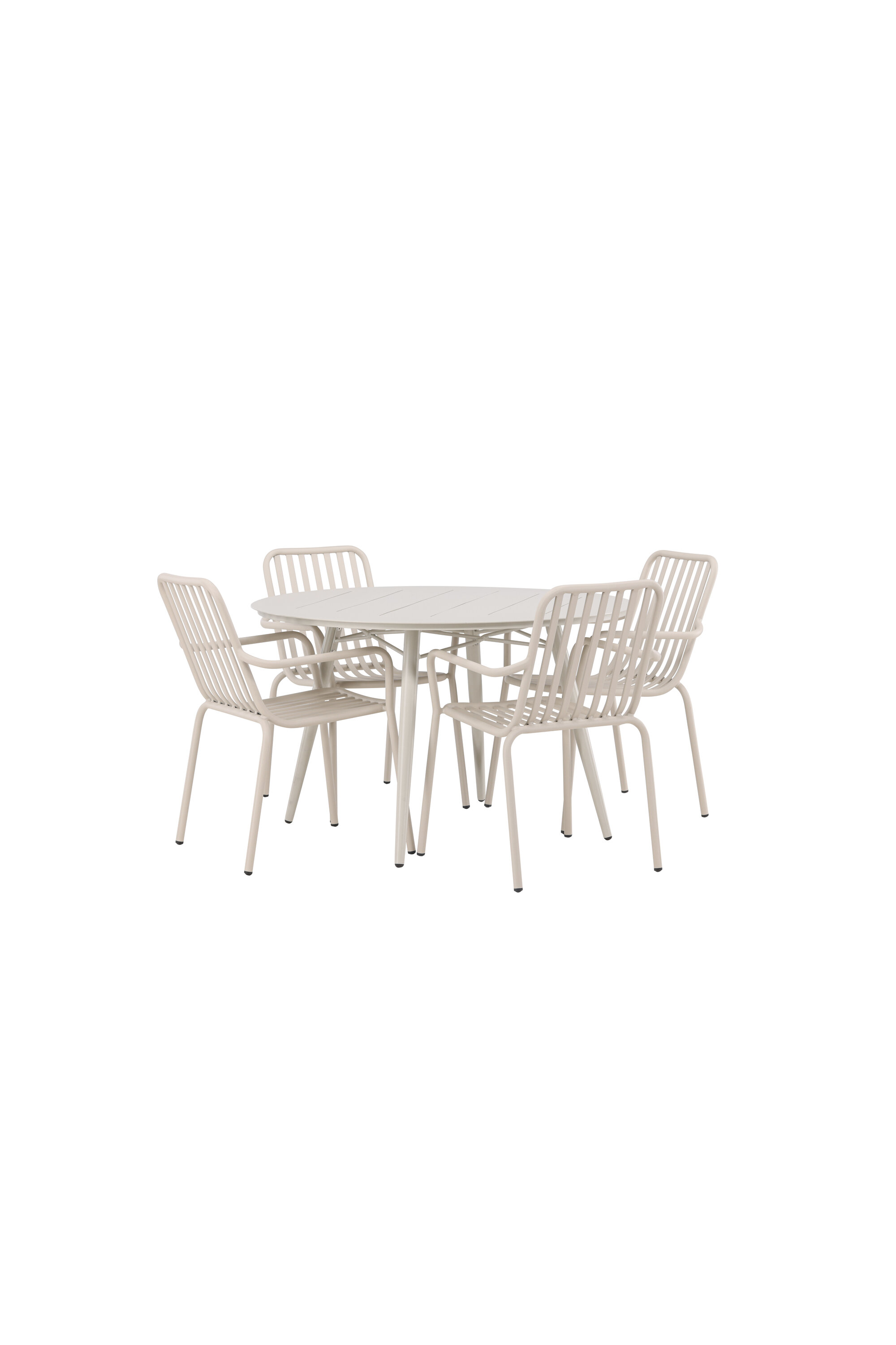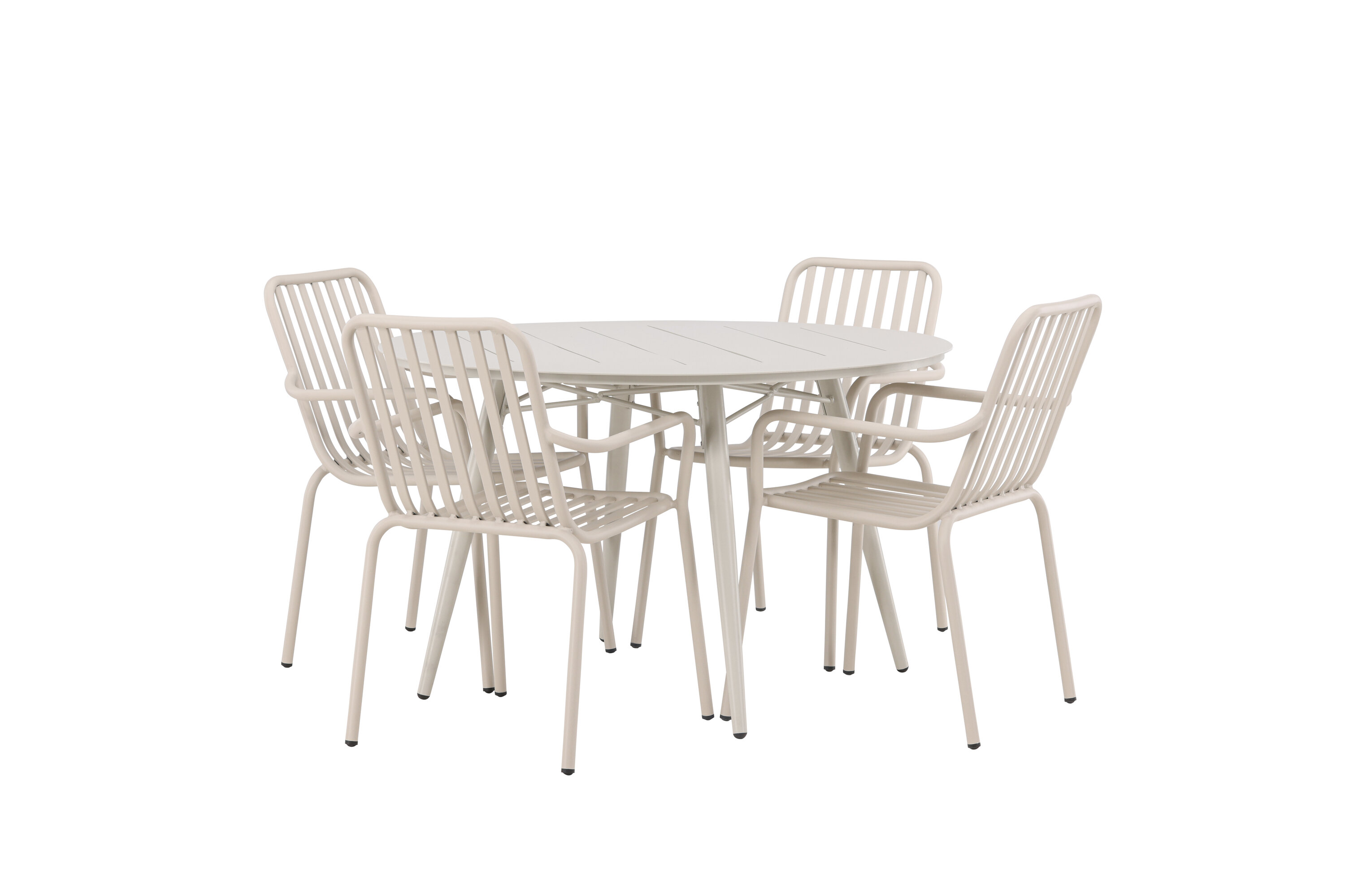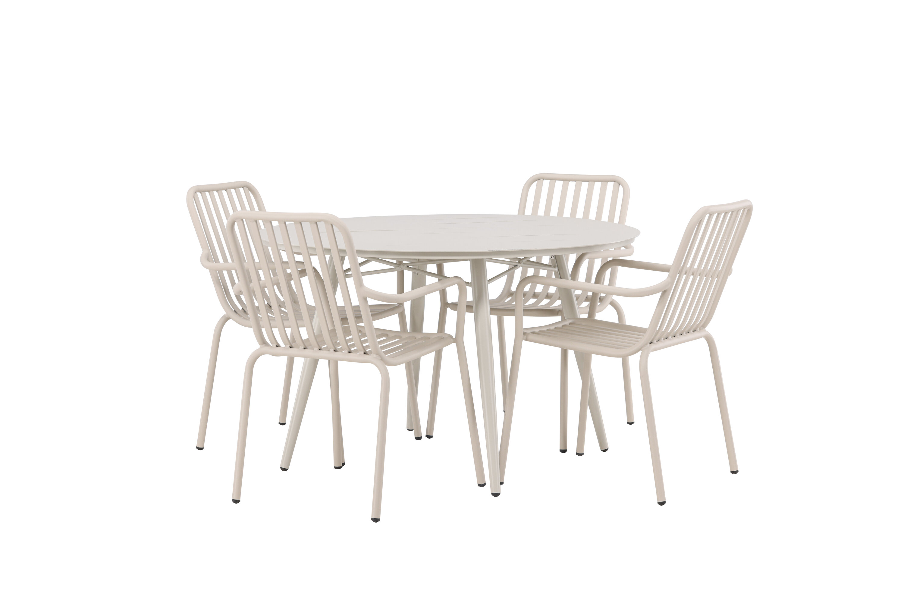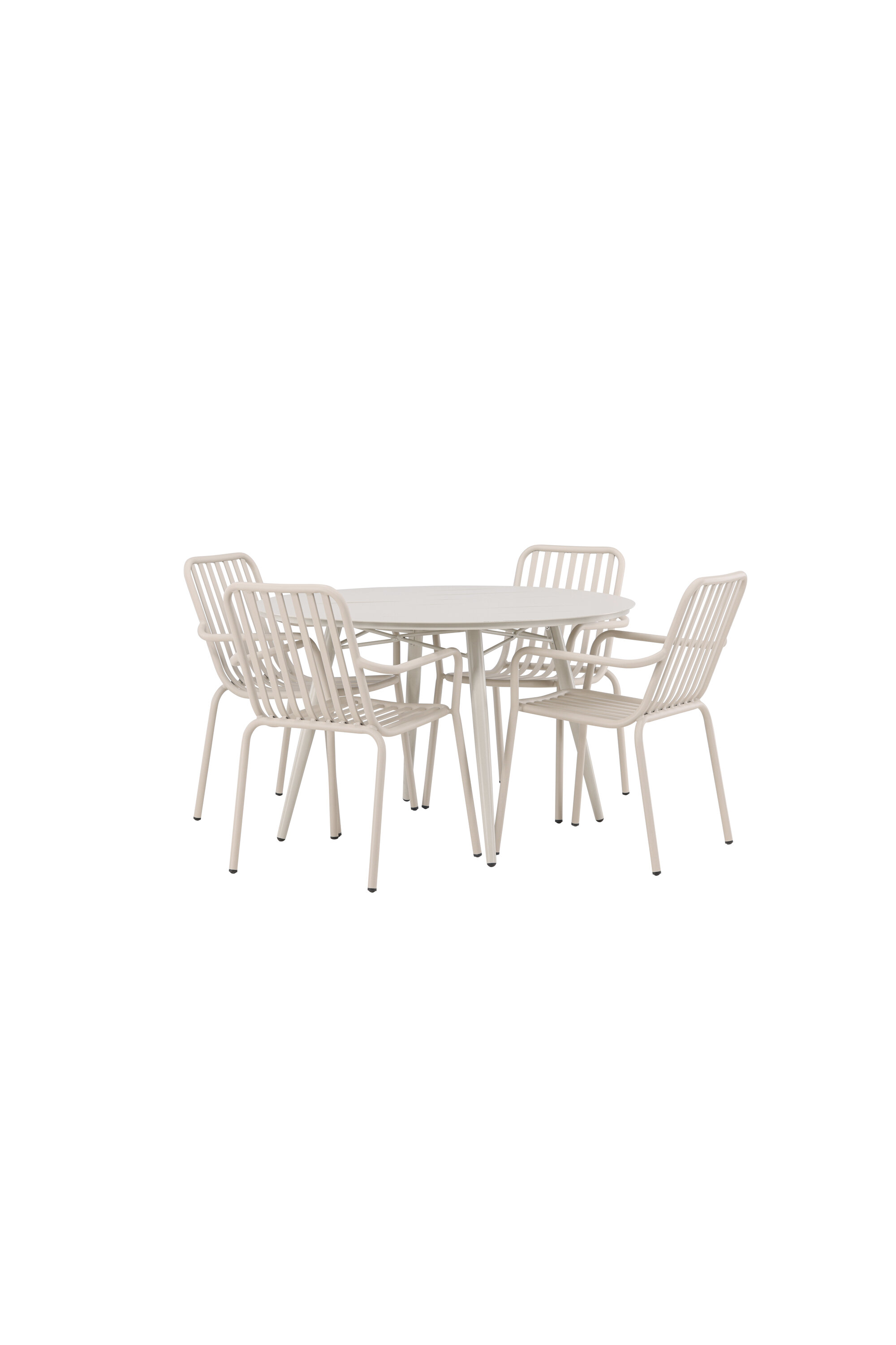 Sisusta talveaed säravalt ja värskelt! Lihtne, kuid elegantne ümmargune söögilaud Lina sarjast on klassikalise disaini ja sooja beeži värviga. Peal on õhuke dekoratiivsete pragudega ja lauajalad veidi laienenud; valmistatud järjekindlalt terasest. Siin on stiilne kombinatsioon 4 meie moodsa Pekingi seeria söögitooliga. Tooli soonik disain ja kreemjas beež värv muudavad selle nii modernseks kui ka ajatuks. See on sobiv söögigrupp, mis ei lähe kunagi moest välja! Laua läbimõõt: 120 cm.