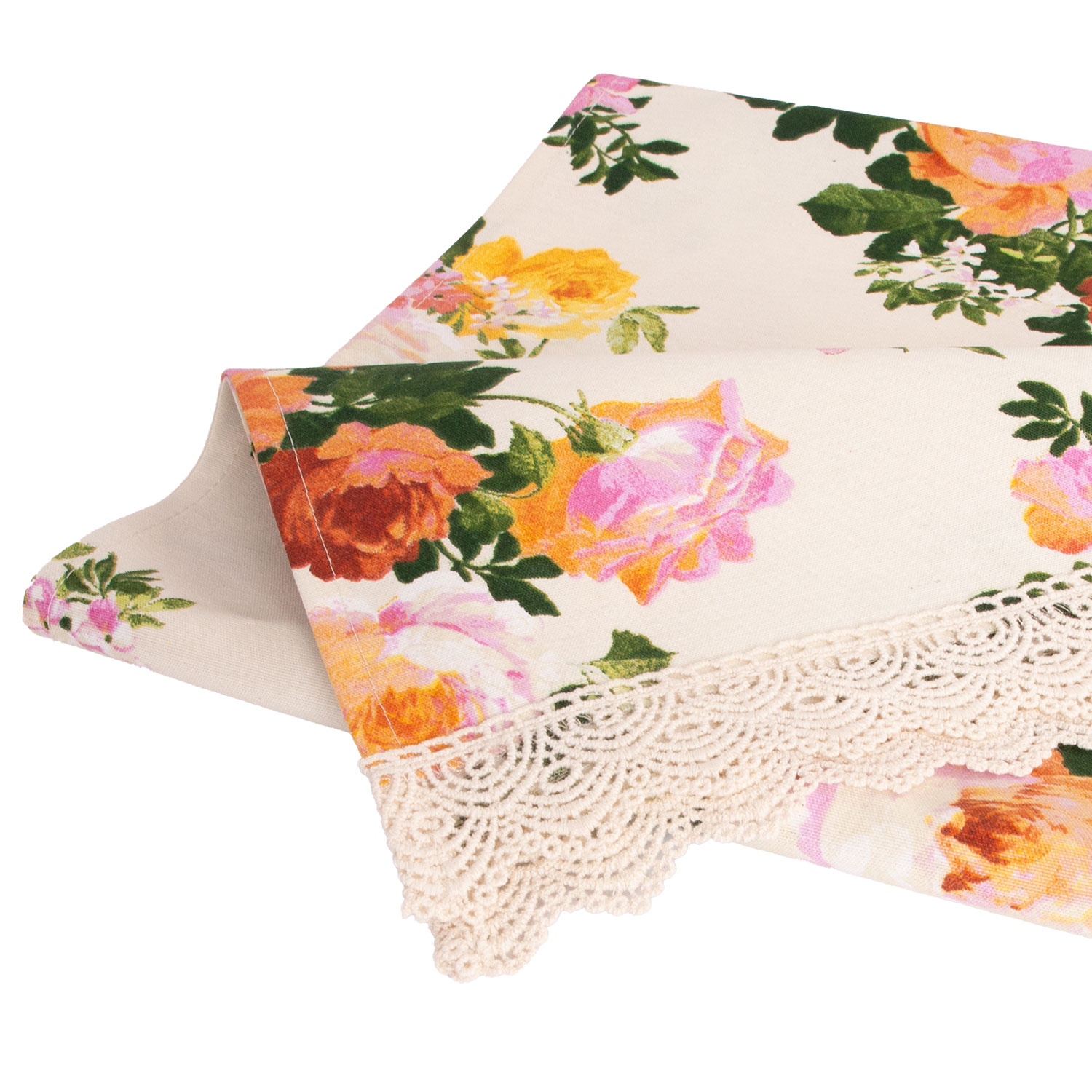 Linik HOLLY pitsiga, 45x116cm, heledad roosid, 20% polüester, 80% puuvill, kangas 495. HOOLDUS: võib pesta temperatuuril 30 kraadi pesumasinas.