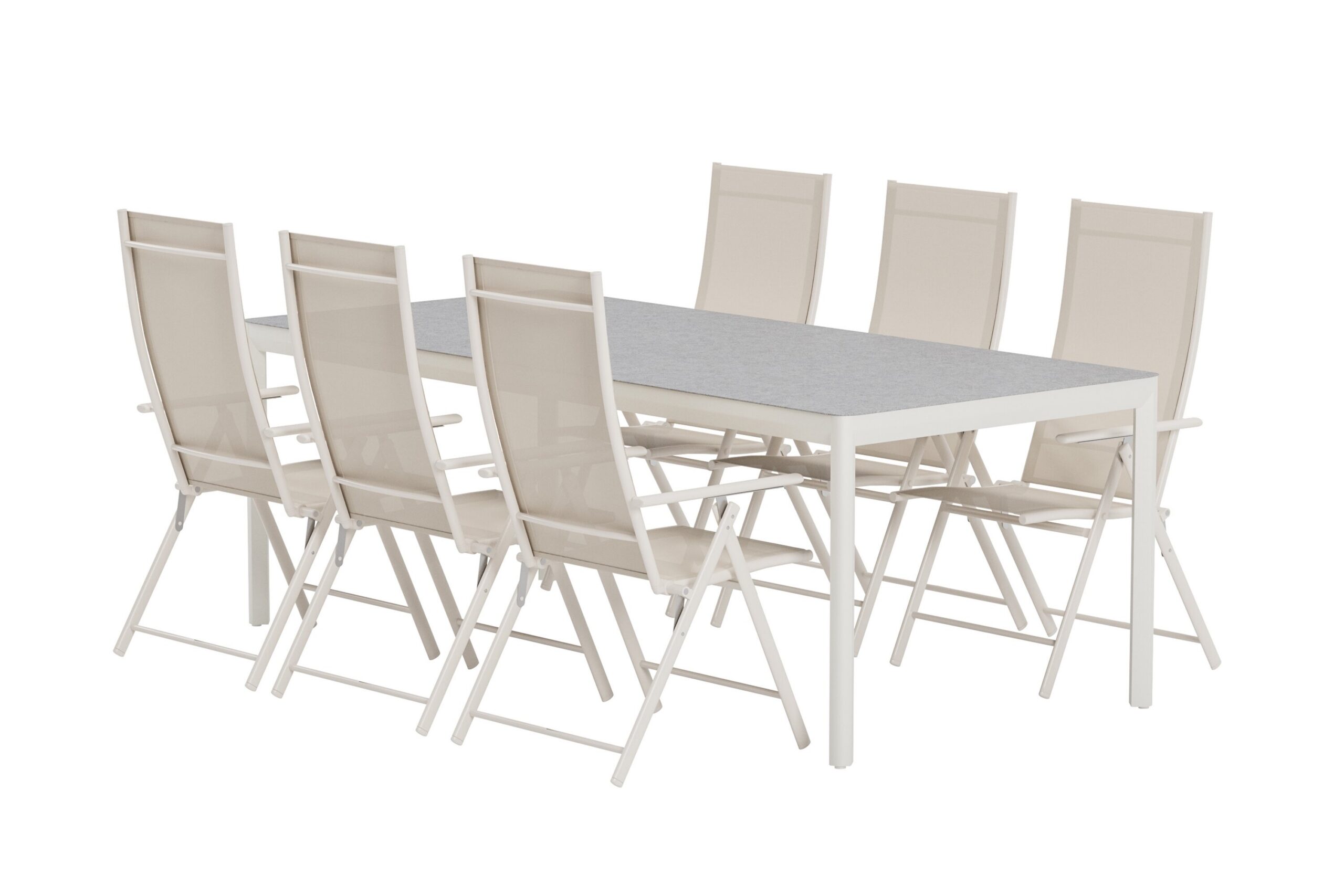 Selle moodsa söögikomplektiga, mis ühendab nutika funktsiooni elegantse disainiga, looge elegantne ja mugav välisöögituba. Siin kohtuvad kokkupandavad Lavenzo toolid avara Lino söögilauaga harmooniliseks tervikuks, mis sobib ideaalselt nii terrassile, terrassile kui ka aeda. Lavenzo söögitool on loodud paindlikkuse ja mugavuse tagamiseks. Beež teraskonstruktsioon annab kaasaegse ilme ning tekstiilist iste pakub mugavat ja kergesti hooldatavat istumiskogemust. Reguleeritava seljatoe ja kokkuklapitava funktsiooniga tooli on lihtne vastavalt olukorrale kohandada ja seda on lihtne hoiustada, kui seda ei kasutata. Lino söögilaud täiendab komplekti oma minimalistliku disaini ja helde lauaplaadiga. Beež alumiiniumraam loob modernse õhulise mulje, samas kui lauda on lihtne vastavalt vajadusele liigutada. Avar pind teeb lihtsaks nii pere kui sõprade kogumise nii igapäevasteks õhtusöökideks kui ka suuremateks koosviibimisteks.