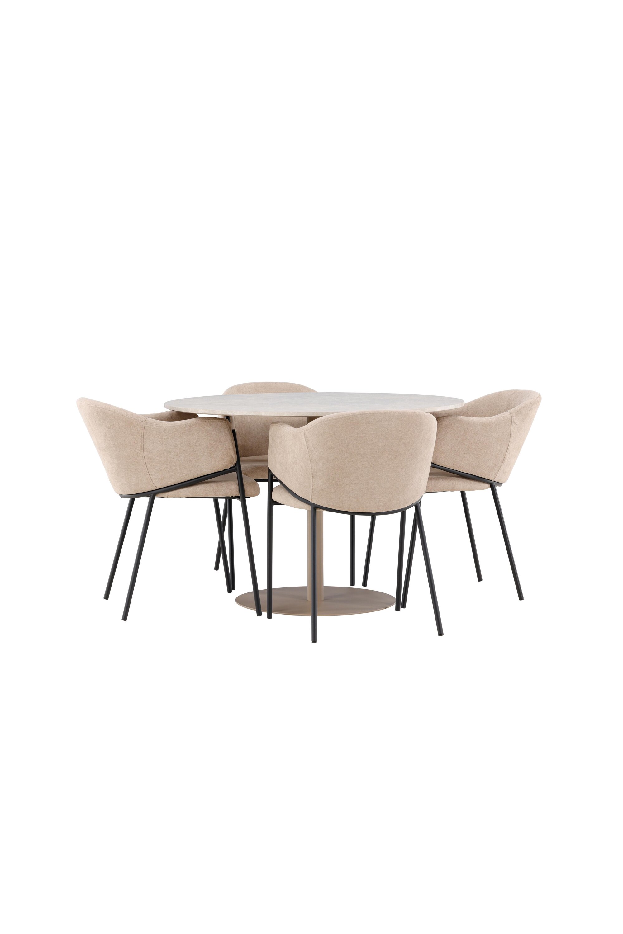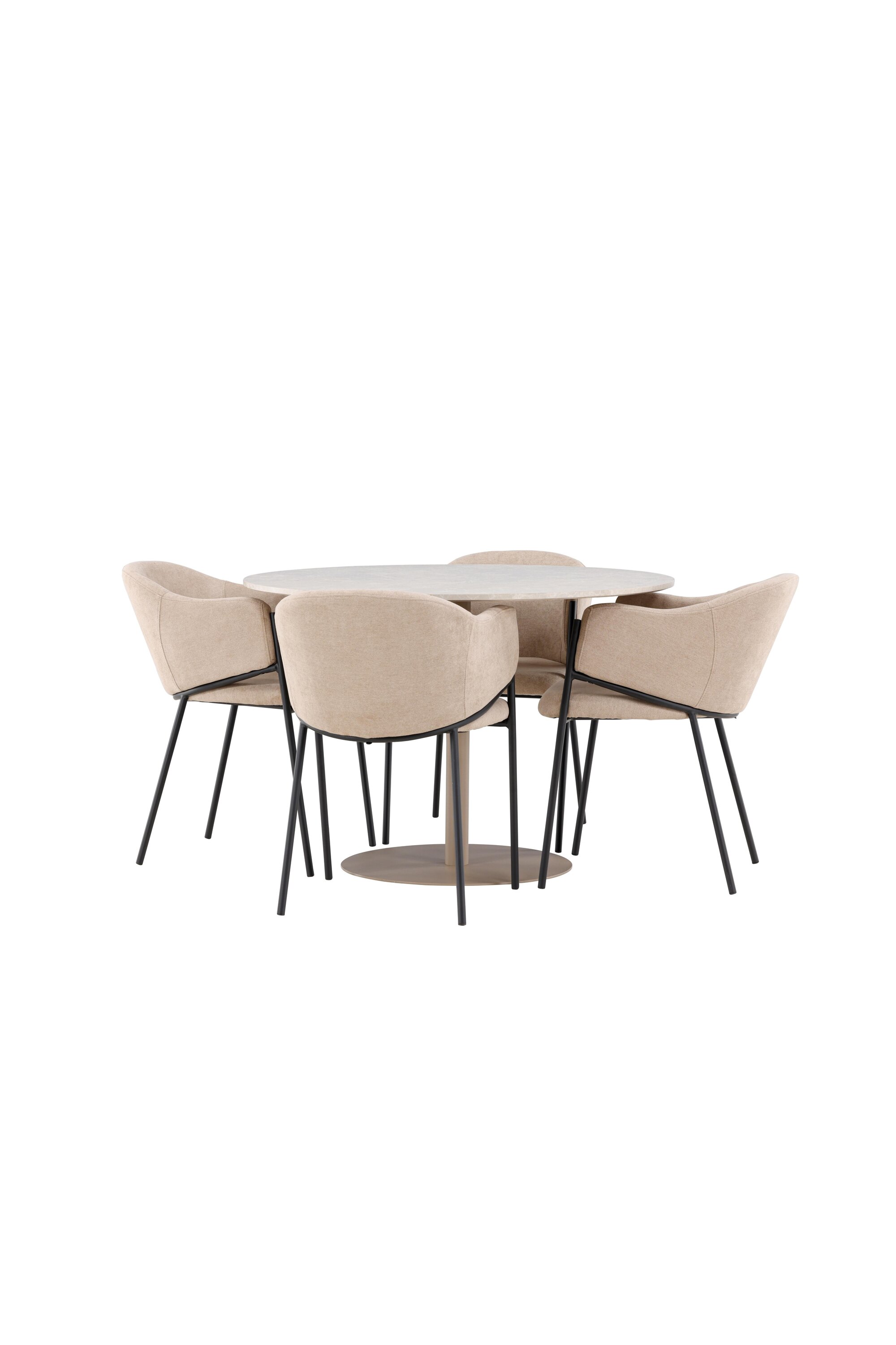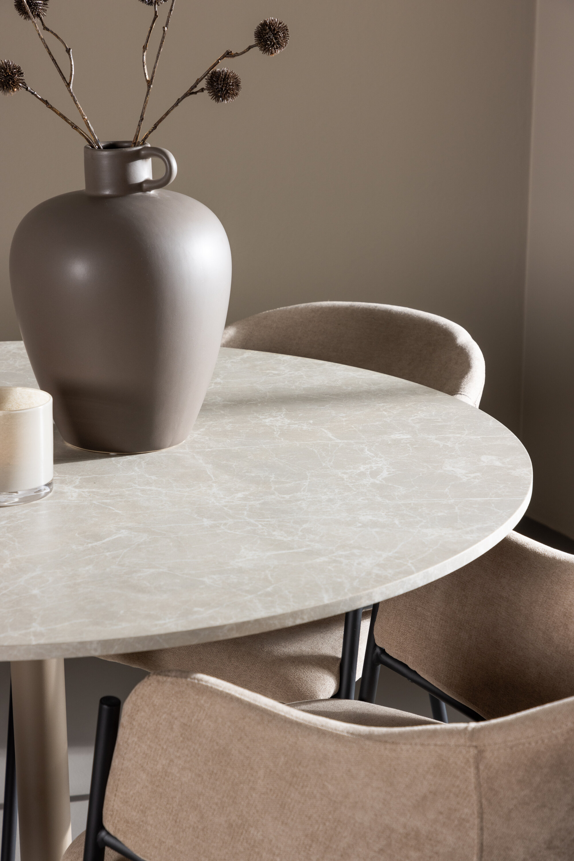 Muutke oma söögituba stiilse ja moodsa söögikomplektiga, mis koosneb Lycke lauast ja Evelina toolidest. See söögikomplekt on loodud ühendama elegantsi ja mugavust, muutes selle täiuslikuks lisandiks teie koju. Lycke laud on elegantne keskosa oma peene beeži värvi ja MDF-konstruktsiooniga. 110 cm läbimõõduga laud pakub piisavalt ruumi einestamiseks ja seltskondlikeks koosviibimisteks, samas kui selle harmooniline disain lisab teie söögituppa rahulikku ja kutsuvat õhkkonda. Vastupidav pind on kergesti puhastatav ja hooldatav, tagades laua kauakestva ilu ja funktsionaalsuse. Kaasas olevad neli Evelina tooli täiendavad lauda suurepäraselt. Need toolid on polsterdatud pehme beeži linaga, pakkudes loomulikku ja mugavat istumiskogemust. Lina on tuntud oma vastupidavuse ja mugavuse poolest, mis võimaldab teil ja teie külalistel pikkade söögikordade ja vestluste ajal mugavalt istuda. Toolide beež värv harmoneerub kaunilt lauaga, luues teie söögituppa ühtse ja elegantse ilme. Lycke söögikomplekt Evelina toolidega on ideaalne valik neile, kes soovivad luua elegantset ja funktsionaalset söögikeskkonda. Moodsa disaini ja kõrge mugavuse kombinatsioon muudab iga toidukorra nauditavaks kogemuseks. Tere tulemast uuele stiili ja mugavuse tasemele oma kodus koos Lycke ja Evelinaga!