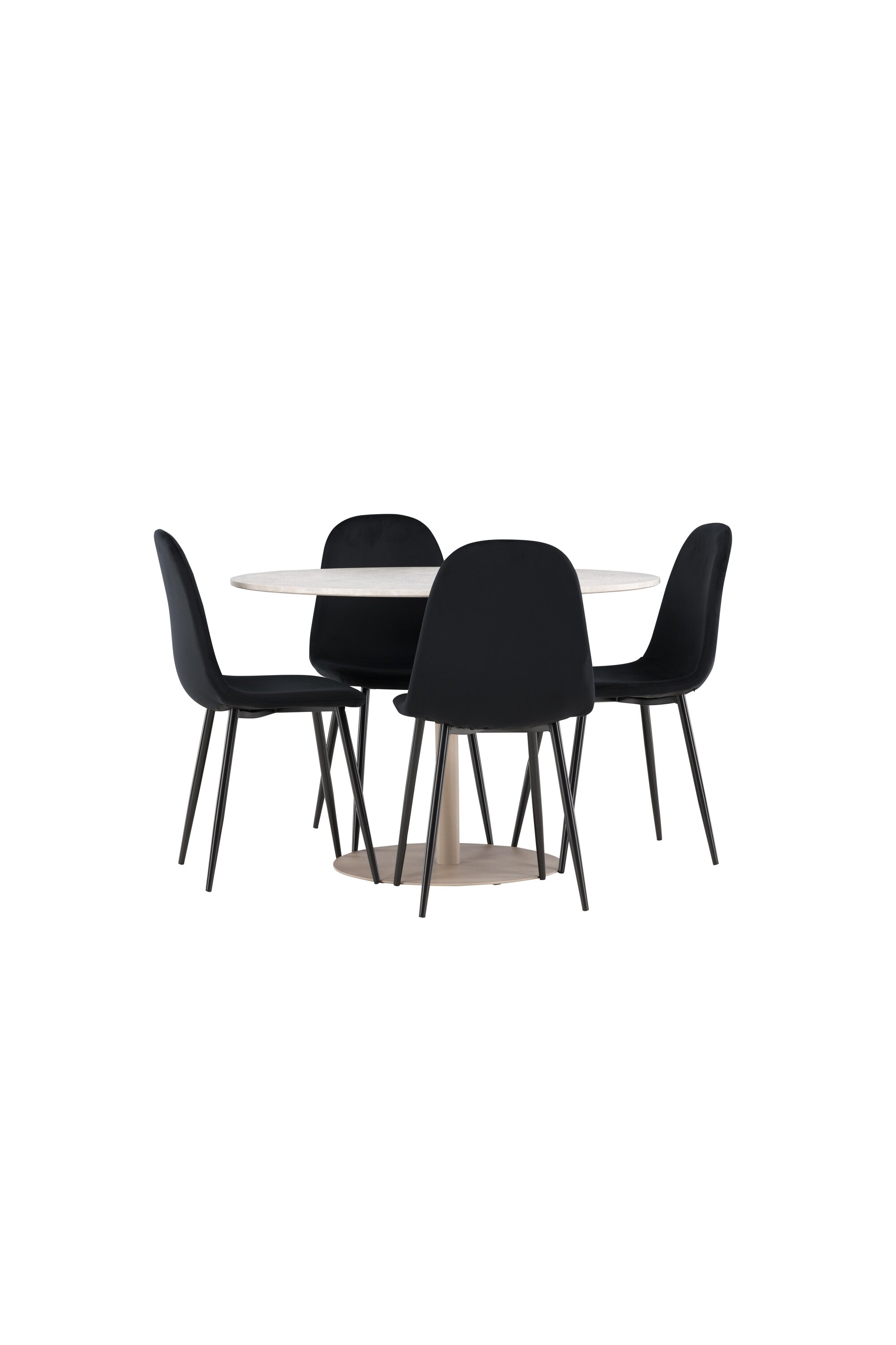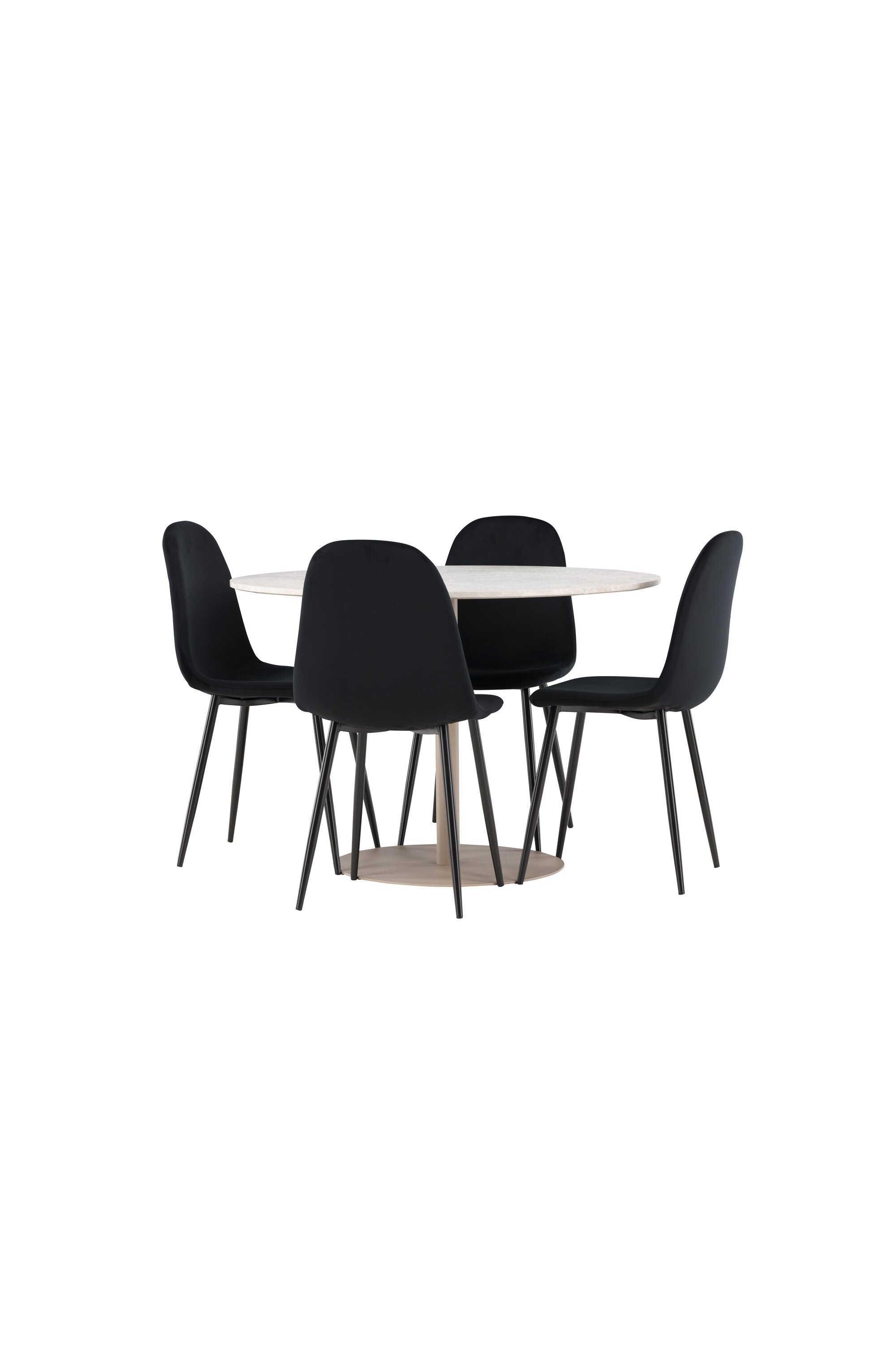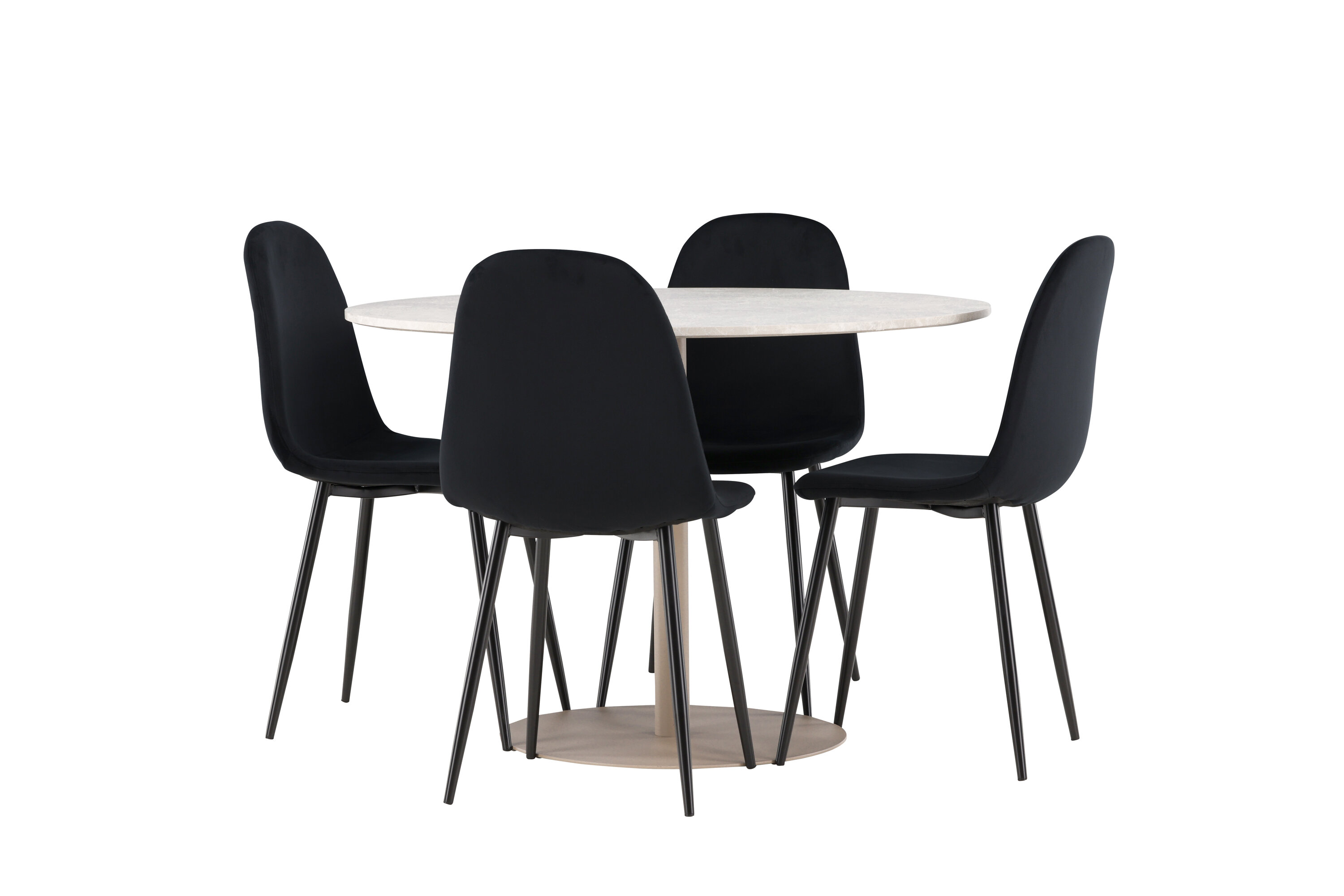 Looge elegantne ja kutsuv söögituba meie keeruka söögikomplektiga, mis ühendab elegantse Lycke laua luksuslike Polari toolidega. See söögikomplekt sobib suurepäraselt nii igapäevasteks eineteks kui ka pidulikeks sündmusteks, andes teie söögitoale kaasaegse ja peene tunde. MDF-st valmistatud Lycke laud on kauni beeži värviga, mis lisab teie söögituppa pehme ja harmoonilise atmosfääri. 110 cm läbimõõduga laud pakub rohkelt ruumi söögiks ja vestluseks, ümar kuju loob aga tasakaalustatud ja kutsuva keskkonna. Laua tugev konstruktsioon tagab vastupidavuse ja stabiilsuse pikaajaliseks kasutamiseks. Neli Polari tooli täiendavad suurepäraselt lauda oma elegantsete musta sametiga polsterdatud istmetega. Need toolid pakuvad nii mugavust kui ka stiili, muutes need ideaalseks pikaks ja nauditavaks õhtusöögiks pere ja sõpradega. Nende kaasaegne disain koos kõrgete seljatoe ja pehmete istmetega annab teie söögitoale rafineeritud ja kaasaegse ilme. See söögikomplekt on täiuslik segu esteetikast ja funktsionaalsusest, mistõttu on see suurepärane valik neile, kes otsivad elegantset ja mugavat söögituba. Täiustage oma söögituba Lycke laua ja Polari toolide stiilse kombinatsiooniga ning looge koht, kus jagatakse mälestusi ja rõõmu.