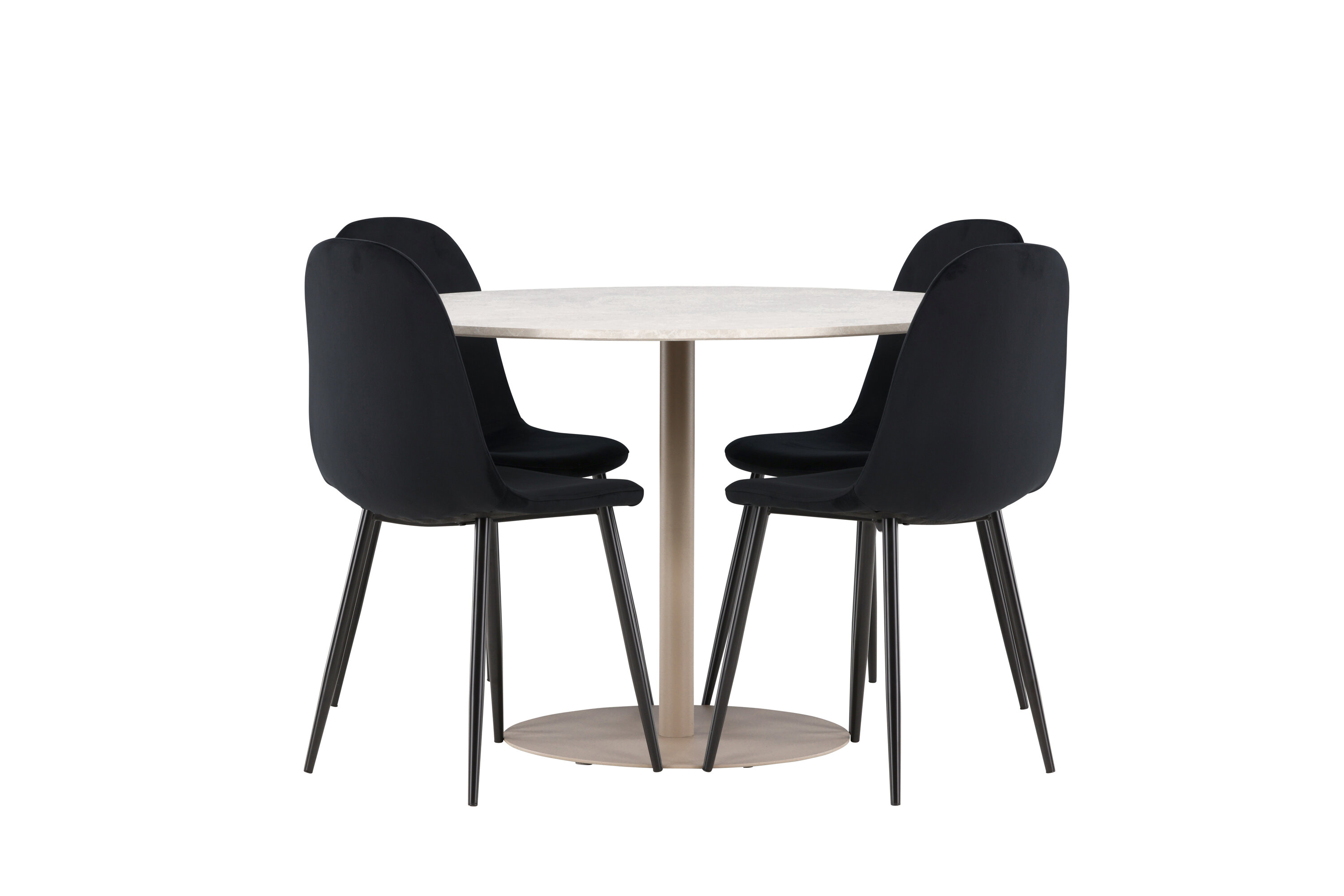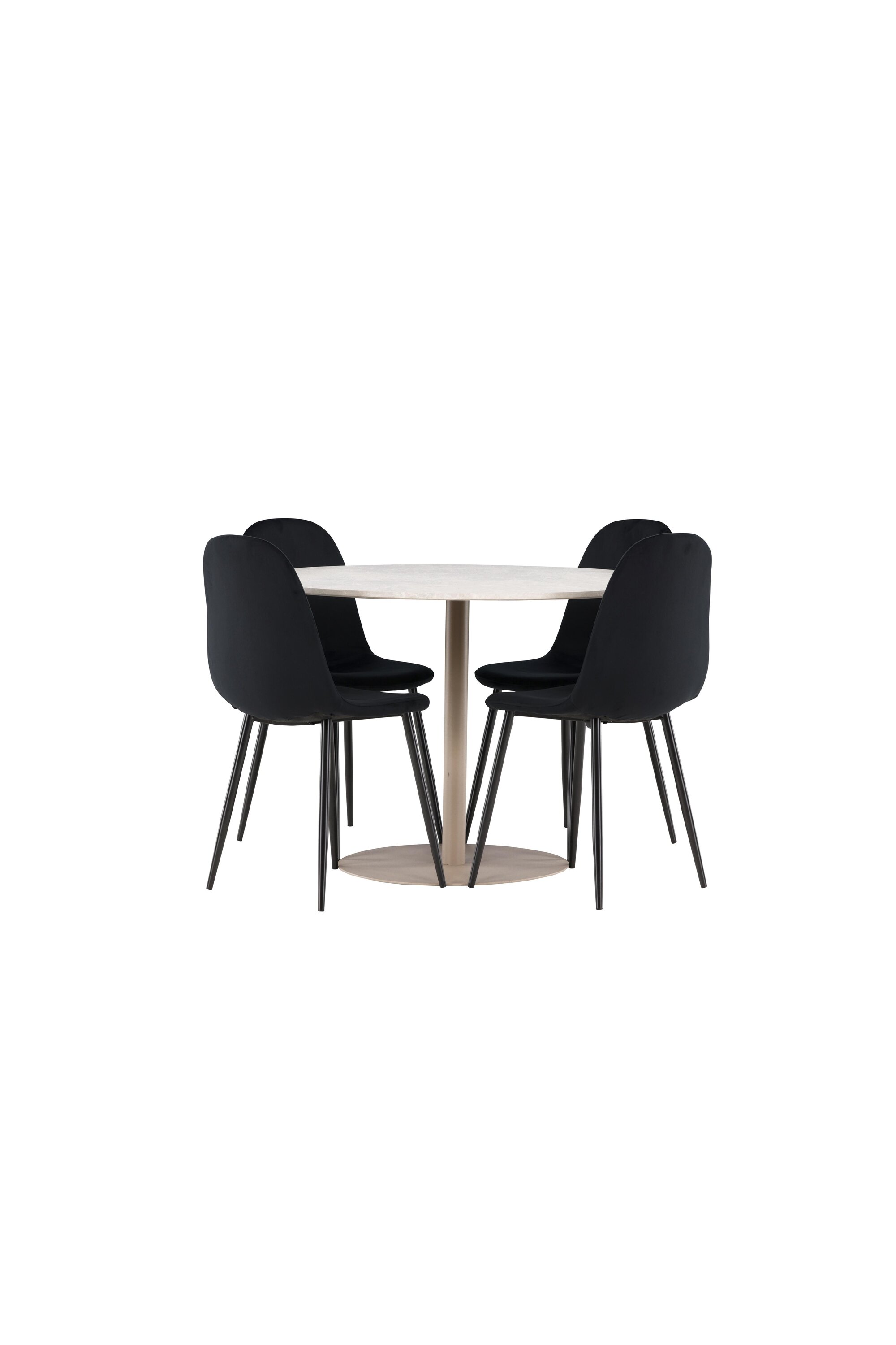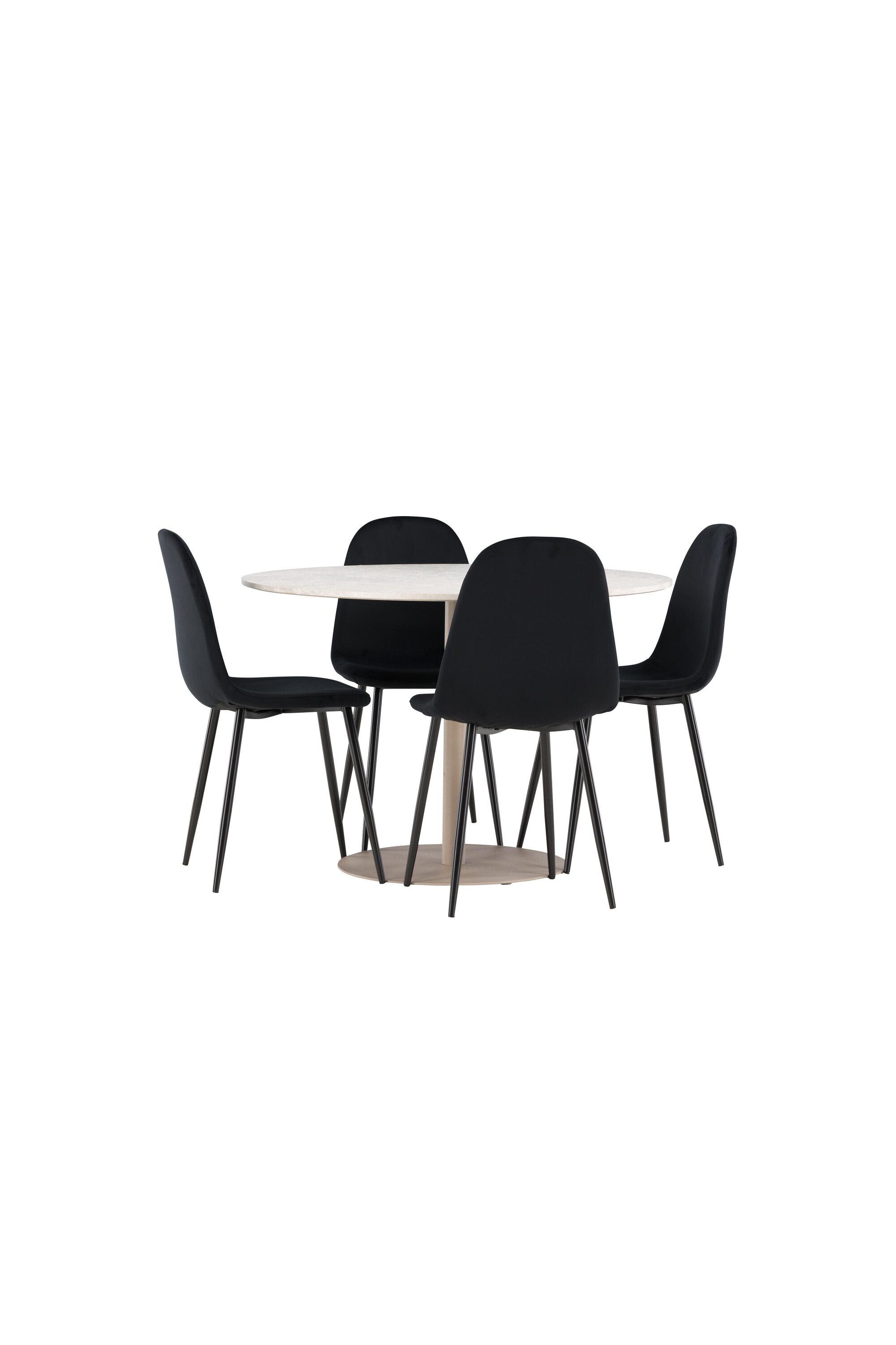 Looge elegantne ja kutsuv söögituba meie keeruka söögikomplektiga, mis ühendab elegantse Lycke laua luksuslike Polari toolidega. See söögikomplekt sobib suurepäraselt nii igapäevasteks eineteks kui ka pidulikeks sündmusteks, andes teie söögitoale kaasaegse ja peene tunde. MDF-st valmistatud Lycke laud on kauni beeži värviga, mis lisab teie söögituppa pehme ja harmoonilise atmosfääri. 110 cm läbimõõduga laud pakub rohkelt ruumi söögiks ja vestluseks, ümar kuju loob aga tasakaalustatud ja kutsuva keskkonna. Laua tugev konstruktsioon tagab vastupidavuse ja stabiilsuse pikaajaliseks kasutamiseks. Neli Polari tooli täiendavad suurepäraselt lauda oma elegantsete musta sametiga polsterdatud istmetega. Need toolid pakuvad nii mugavust kui ka stiili, muutes need ideaalseks pikaks ja nauditavaks õhtusöögiks pere ja sõpradega. Nende kaasaegne disain koos kõrgete seljatoe ja pehmete istmetega annab teie söögitoale rafineeritud ja kaasaegse ilme. See söögikomplekt on täiuslik segu esteetikast ja funktsionaalsusest, mistõttu on see suurepärane valik neile, kes otsivad elegantset ja mugavat söögituba. Täiustage oma söögituba Lycke laua ja Polari toolide stiilse kombinatsiooniga ning looge koht, kus jagatakse mälestusi ja rõõmu.