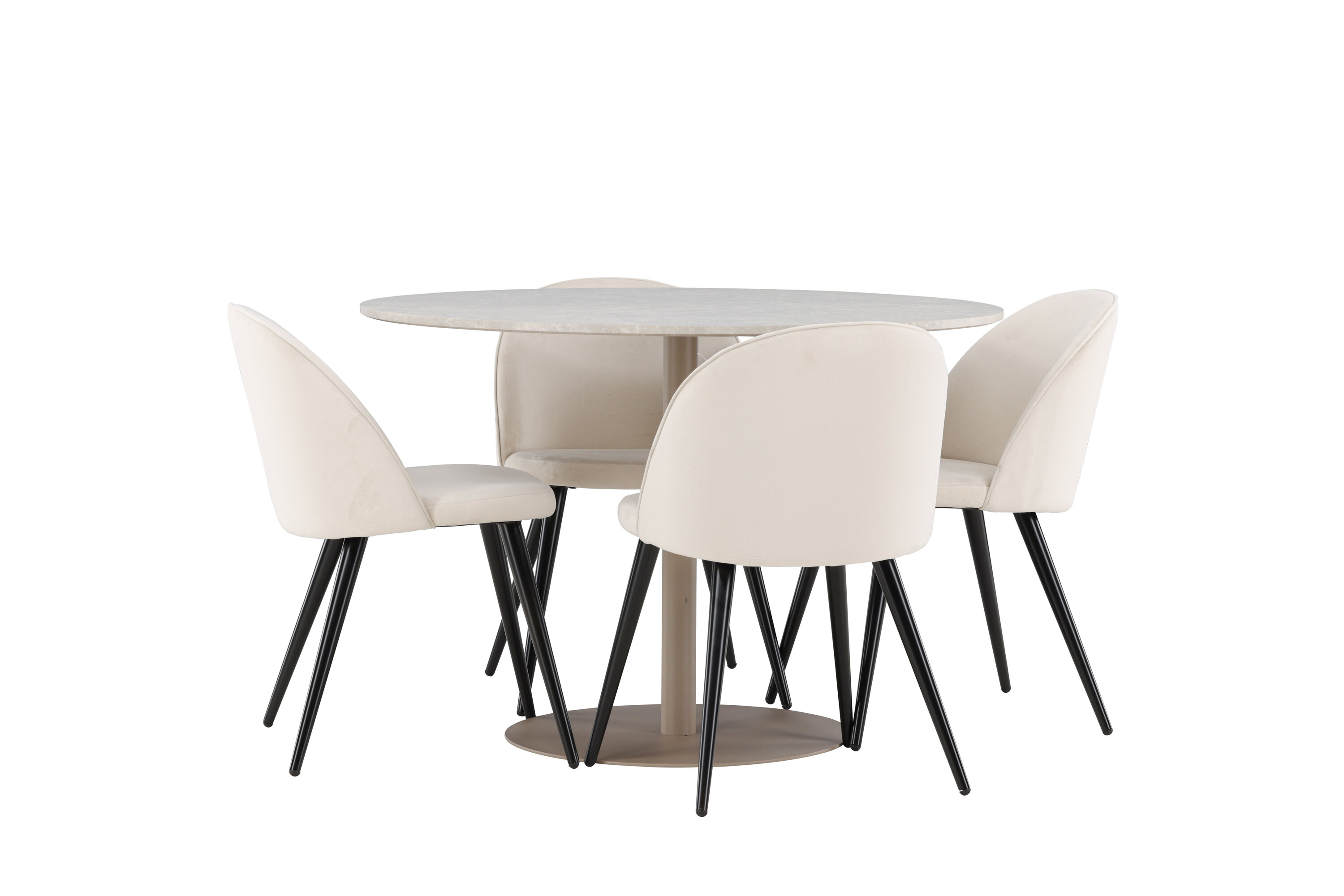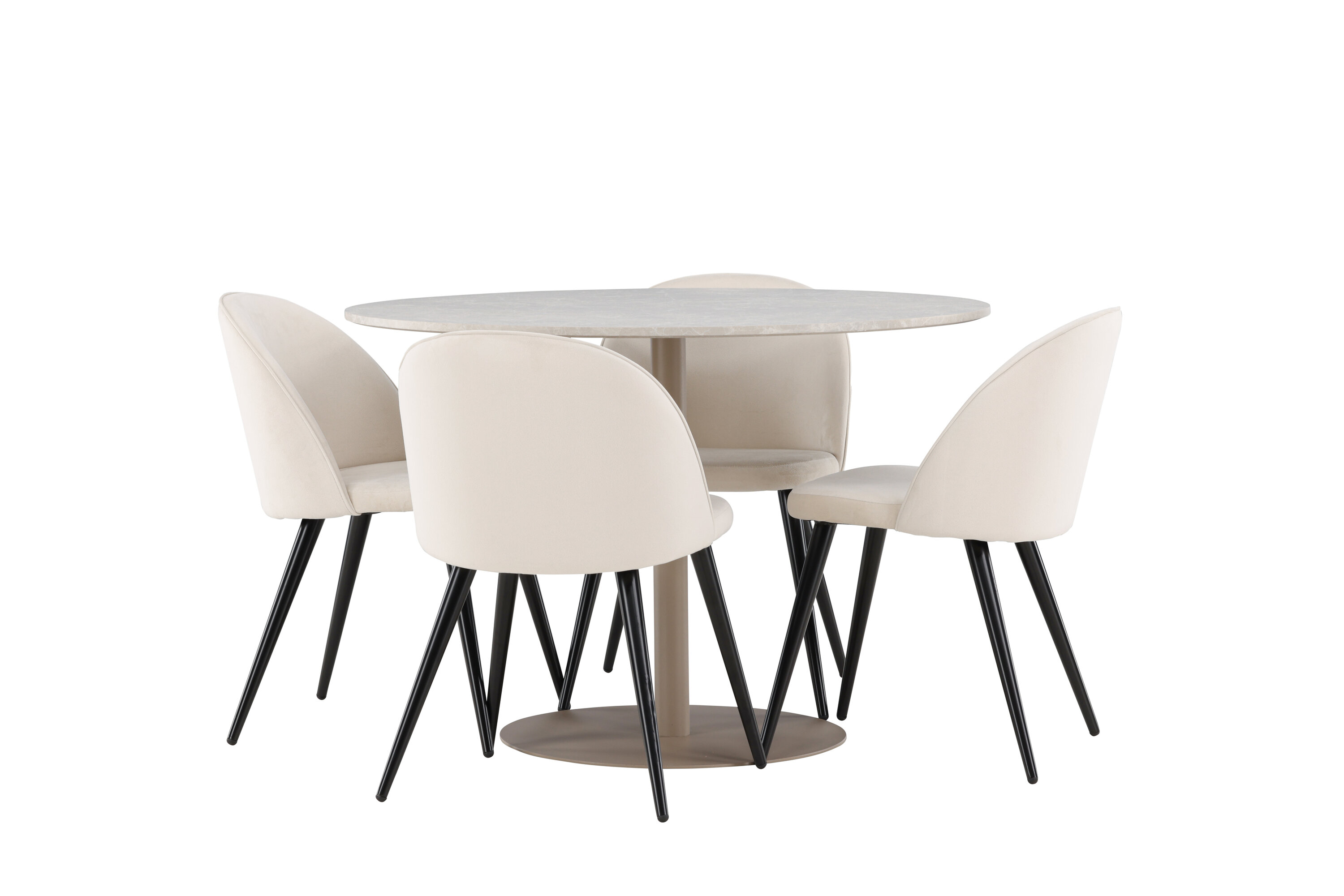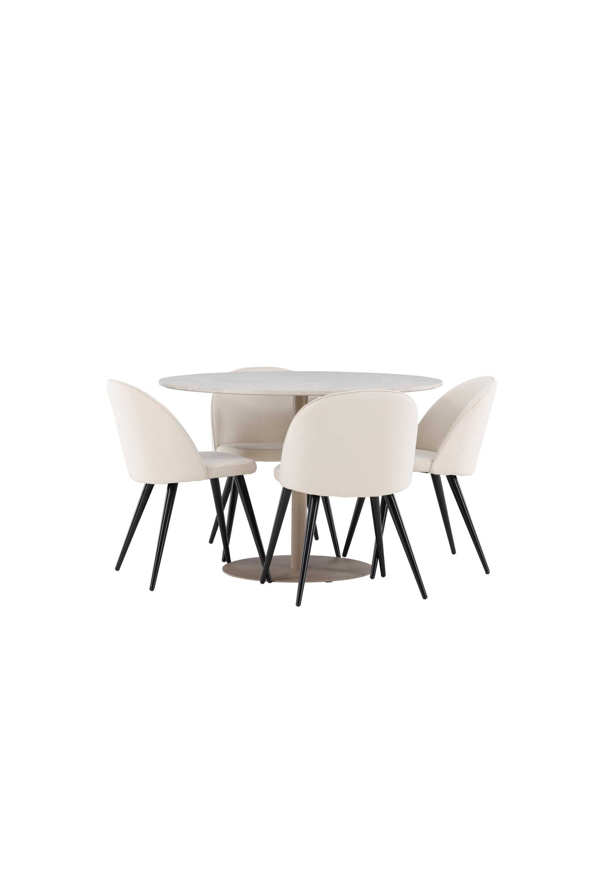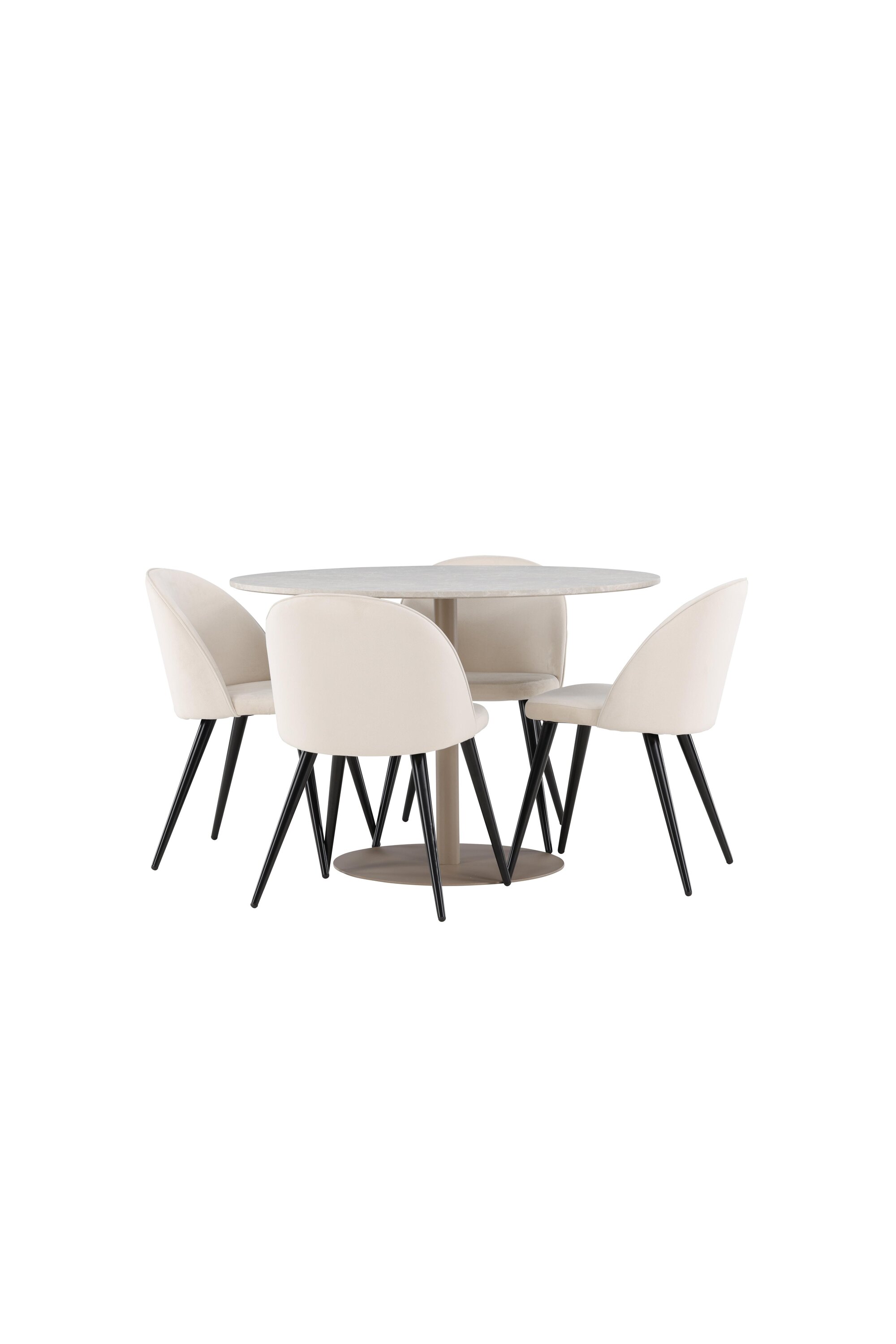 Looge elegantne ja kaasaegne söögikeskkond meie Lycke lauast ja Velvet toolidest koosneva söögikomplektiga. See söögikomplekt on loodud ühendama stiili ja mugavust ning sellest saab teie kodu kaunis fookuspunkt. Lycke laual on peen beež ja see on valmistatud MDF-st. 110 cm läbimõõduga laud pakub rohkelt ruumi einestamiseks ja seltskondlikuks koosviibimiseks, samas kui selle harmooniline disain lisab teie söögitoale rahuliku ja elegantse tunde. Laua vastupidavat pinda on lihtne puhastada ja hooldada, tagades selle kauakestva ilu ja funktsionaalsuse. Kaasas olevad neli Velvet tooli täiendavad lauda suurepäraselt. Nendel toolidel on mustad jalad, mis tagavad stabiilse konstruktsiooni, samas kui iste on polsterdatud pehme beeži sametiga, pakkudes luksuslikku ja mugavat istumiskogemust. Sametkangas on tuntud oma elegantsi ja mugavuse poolest, võimaldades teil ja teie külalistel pikkade õhtusöökide ja vestluste ajal mugavalt istuda. Toolide mustad jalad ja beež iste loovad lauale stiilse kontrasti, andes teie söögitoale kaasaegse ja peene atmosfääri. Velvet toolidega söögikomplekt Lycke on ideaalne valik neile, kes soovivad luua elegantset ja funktsionaalset söögikeskkonda. Ajatu disaini ja kõrge mugavuse kombinatsioon muudab iga toidukorra nauditavaks kogemuseks. Tere tulemast uuele stiili ja mugavuse tasemele oma kodus koos Lycke’i ja Velvetiga!