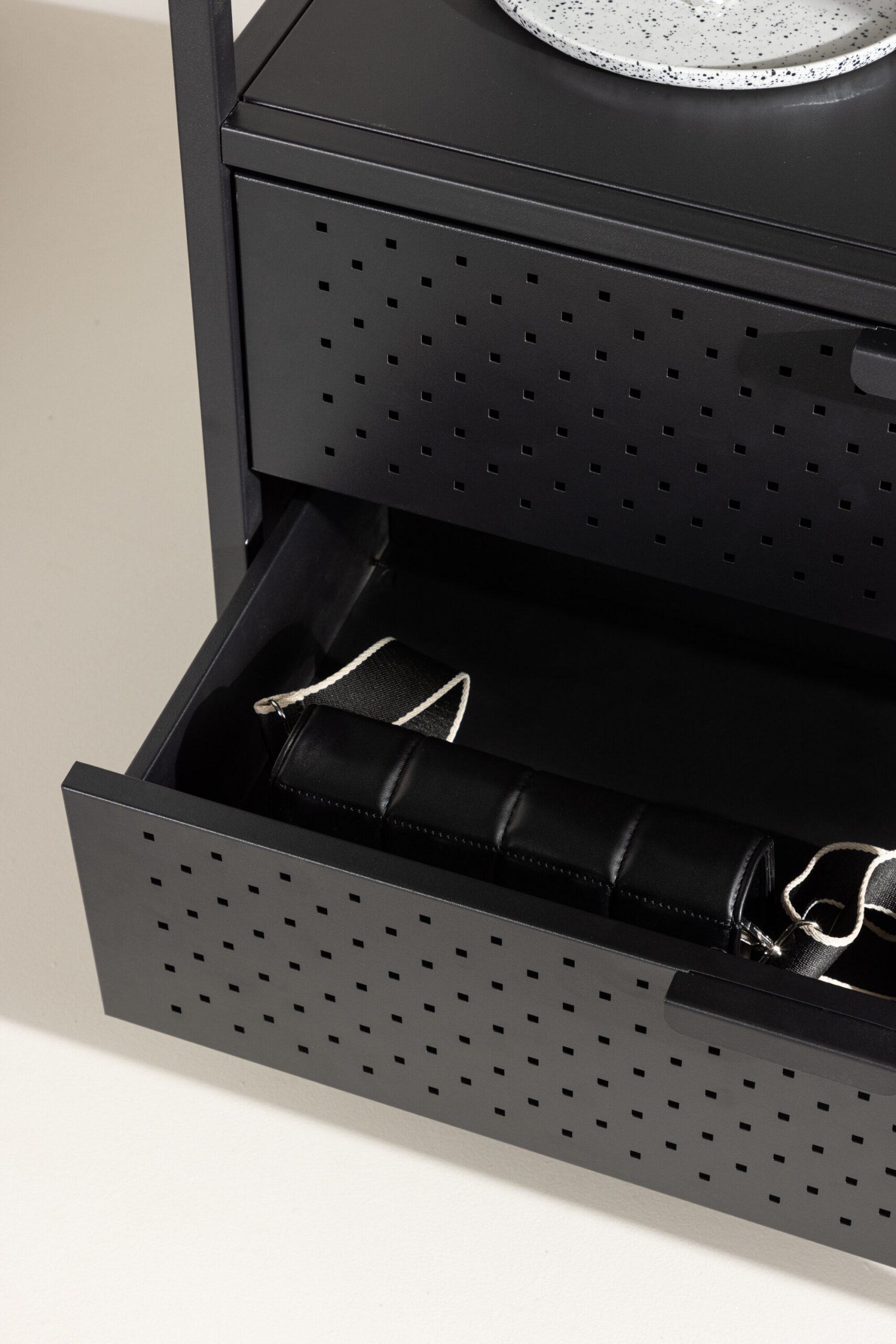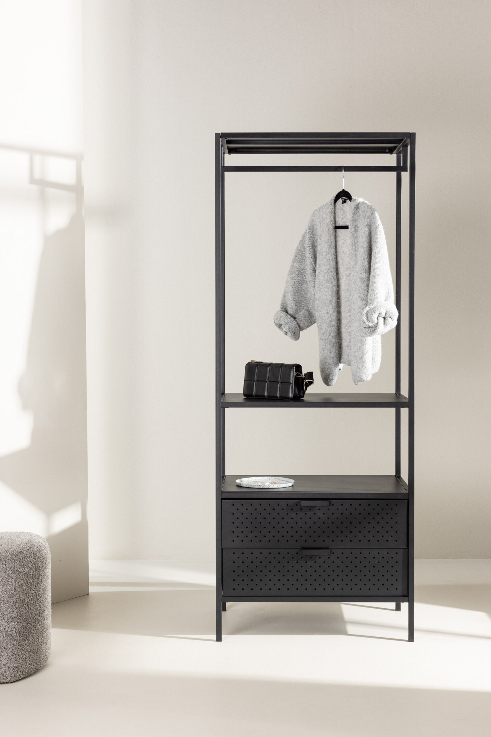 Märka, kuidas stress sulab, kui näed oma igapäevaelu korrastatuna ja täiuslikus korras. Siin saate nautida peidetud hoiustamise eeliseid, mille allosas on kaks mahukat sahtlit. Seal on ka madal riiul, mis on kohandatud teie kingade ja volditud teksade jaoks. Pidevalt valmistatud kvaliteetsest mustast terasest. Lihtne ja ligipääsetav – just nii nagu peab. Hinga sügavalt sisse ja tunneta, kuidas väikesed asjad võivad sinu hommikurutiini oluliselt muuta.