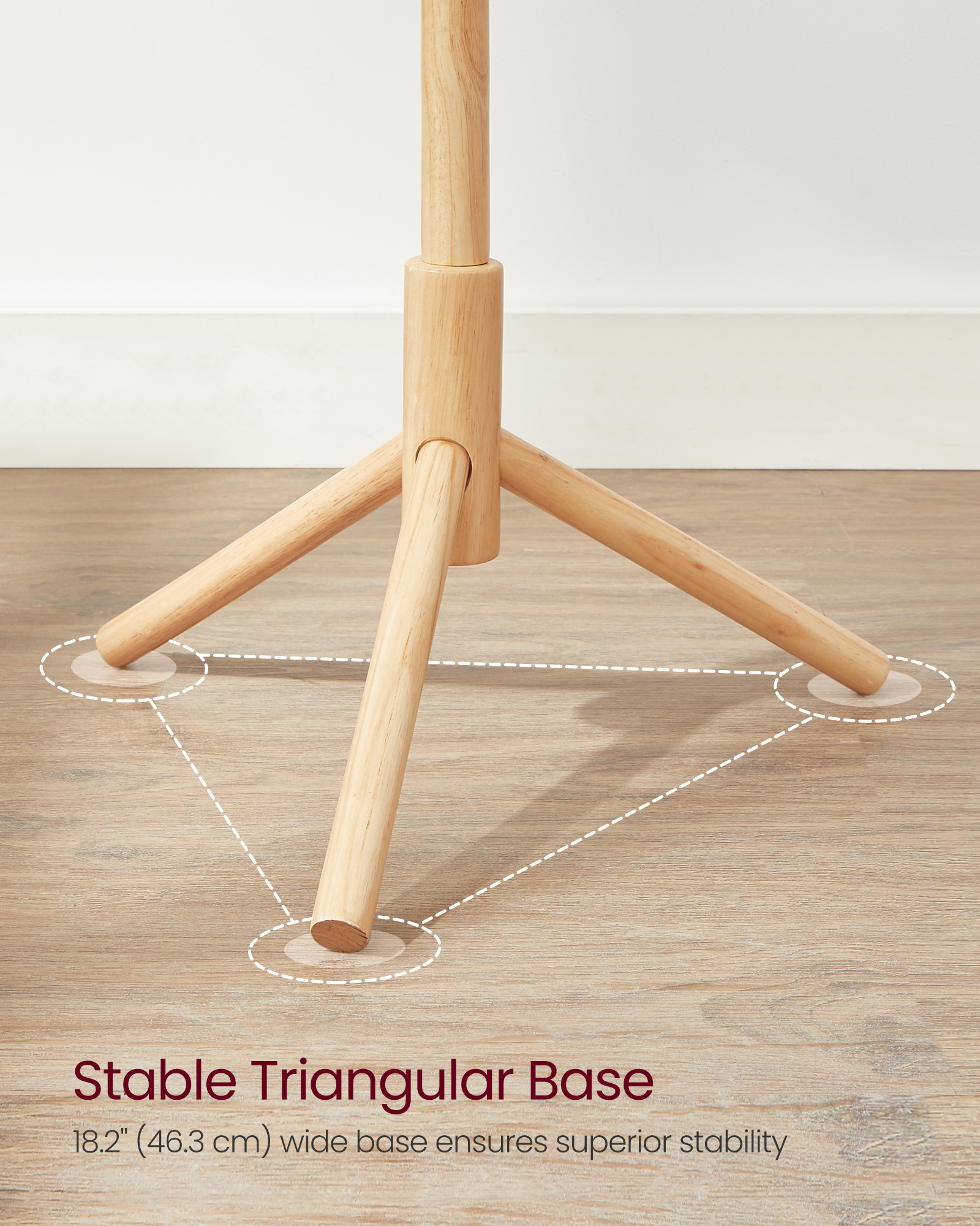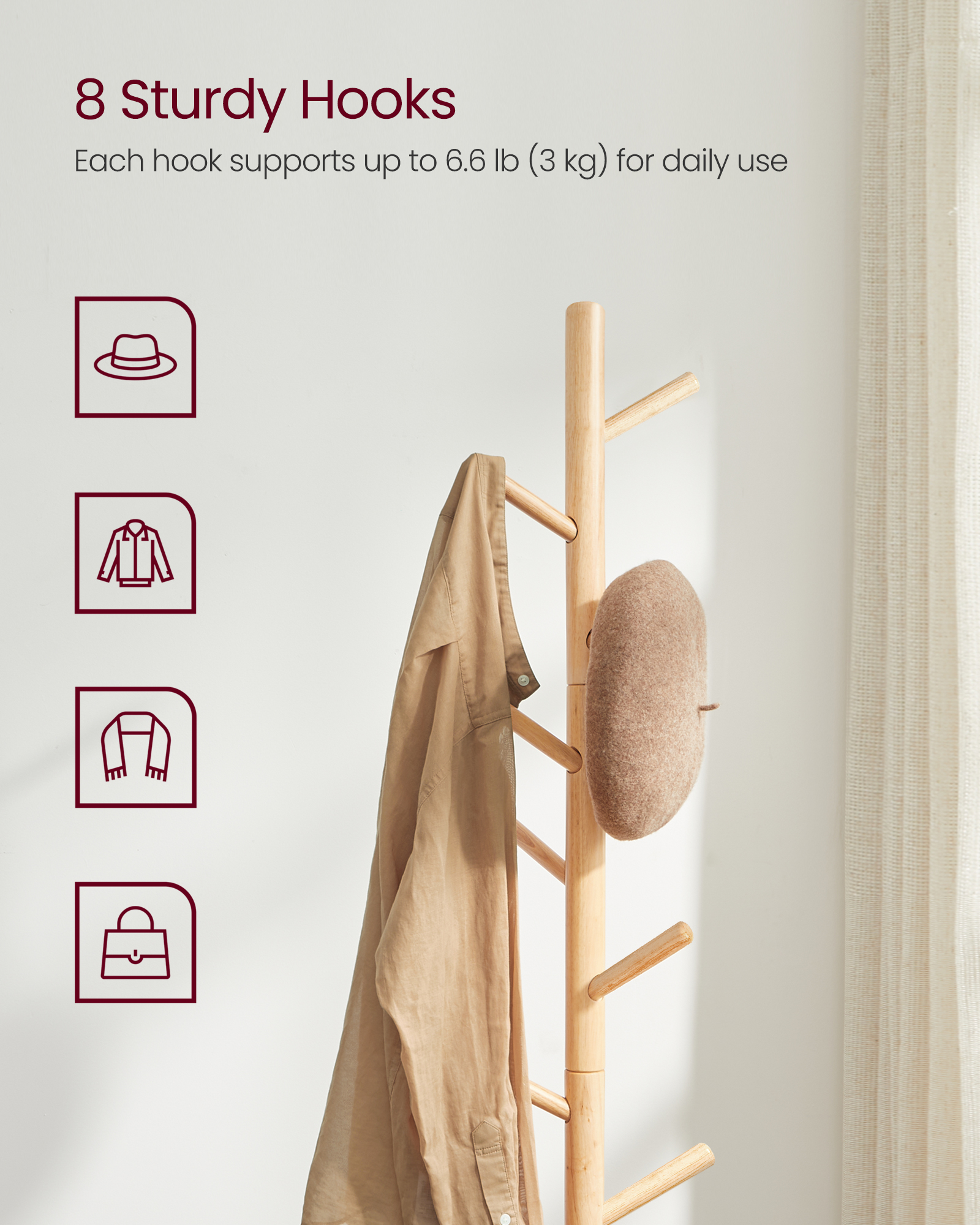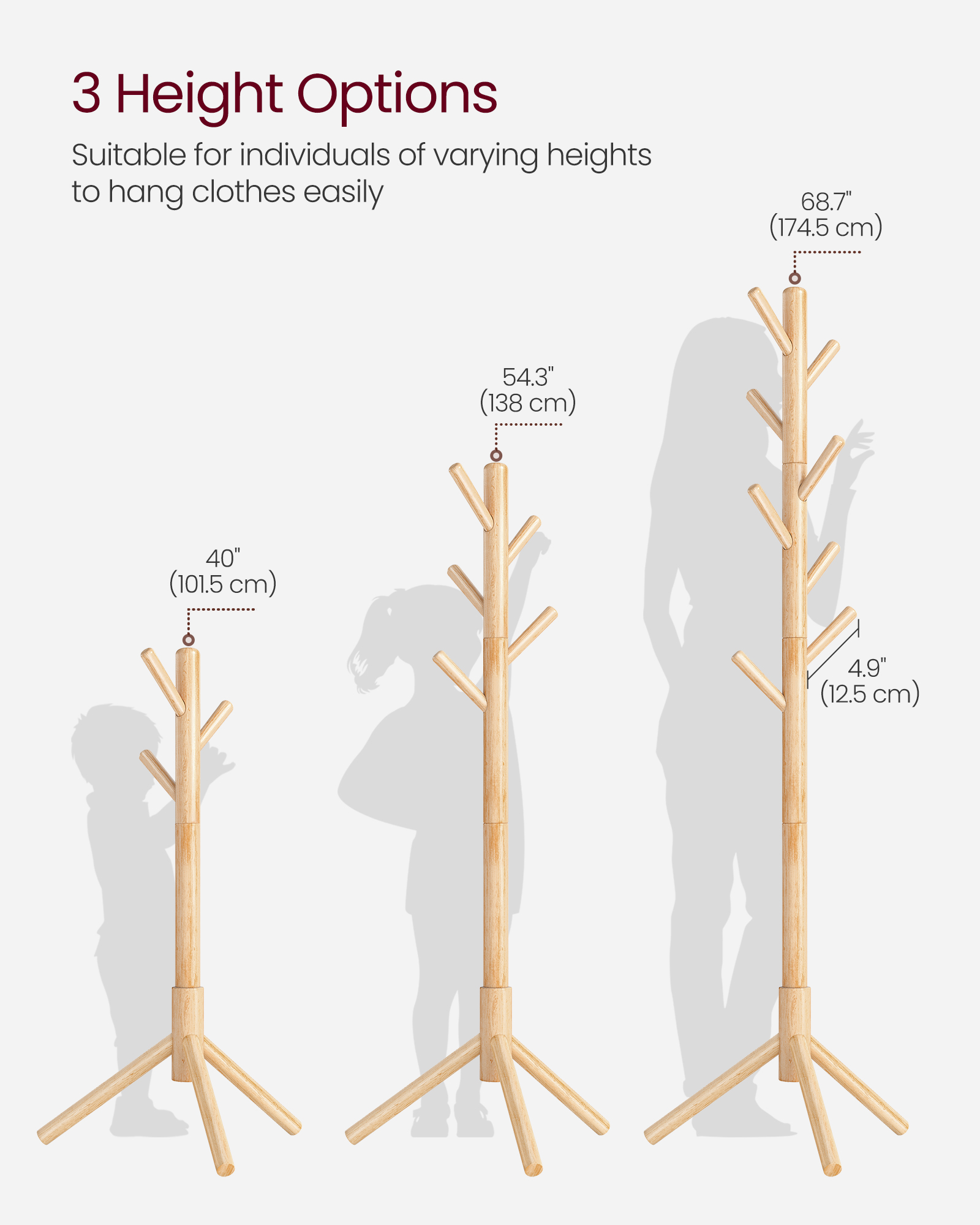 Toote andmed: – Värvus: Naturaalne – Materjal: Kautšukipuu – Suurus: 47 x 47 x 175 cm (P x L x K) – Pikkus konksu kohta: 12,3 cm – Kaal: 2,2 kg – Maksimaalne staatiline koormus konksu kohta: 5 kg – Maksimaalne staatiline kogukoormus: 15 kg Tarnekomplekt: – 1 x riidepuu – 1 x juhend (DE, EN, FR, ES, IT)