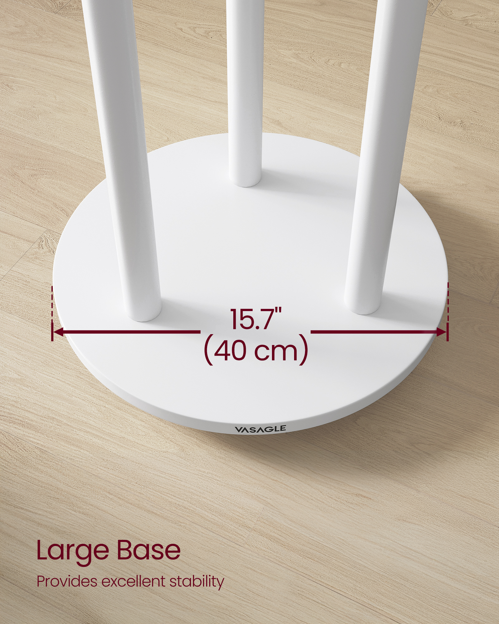 Spetsifikatsioonid: Värv: Valge Materjal: Kummipuu, MDF (keskmise tihedusega puitkiudplaat), teras, plastik Toote mõõdud: 40 x 175 cm (15,7 tolli läbimõõt x 68,9 tolli kõrge) Toote kaal: 5,8 kg (12,8 naela) Maksimaalne staatiline kandevõime konksu kohta: 3 kg (6,6 naela) Maksimaalne staatiline kandevõime riiuli kohta: 5 kg (11 naela) Pakisisu: 1 x riidenagi 1 x tarvikute komplekt 1 x juhend
