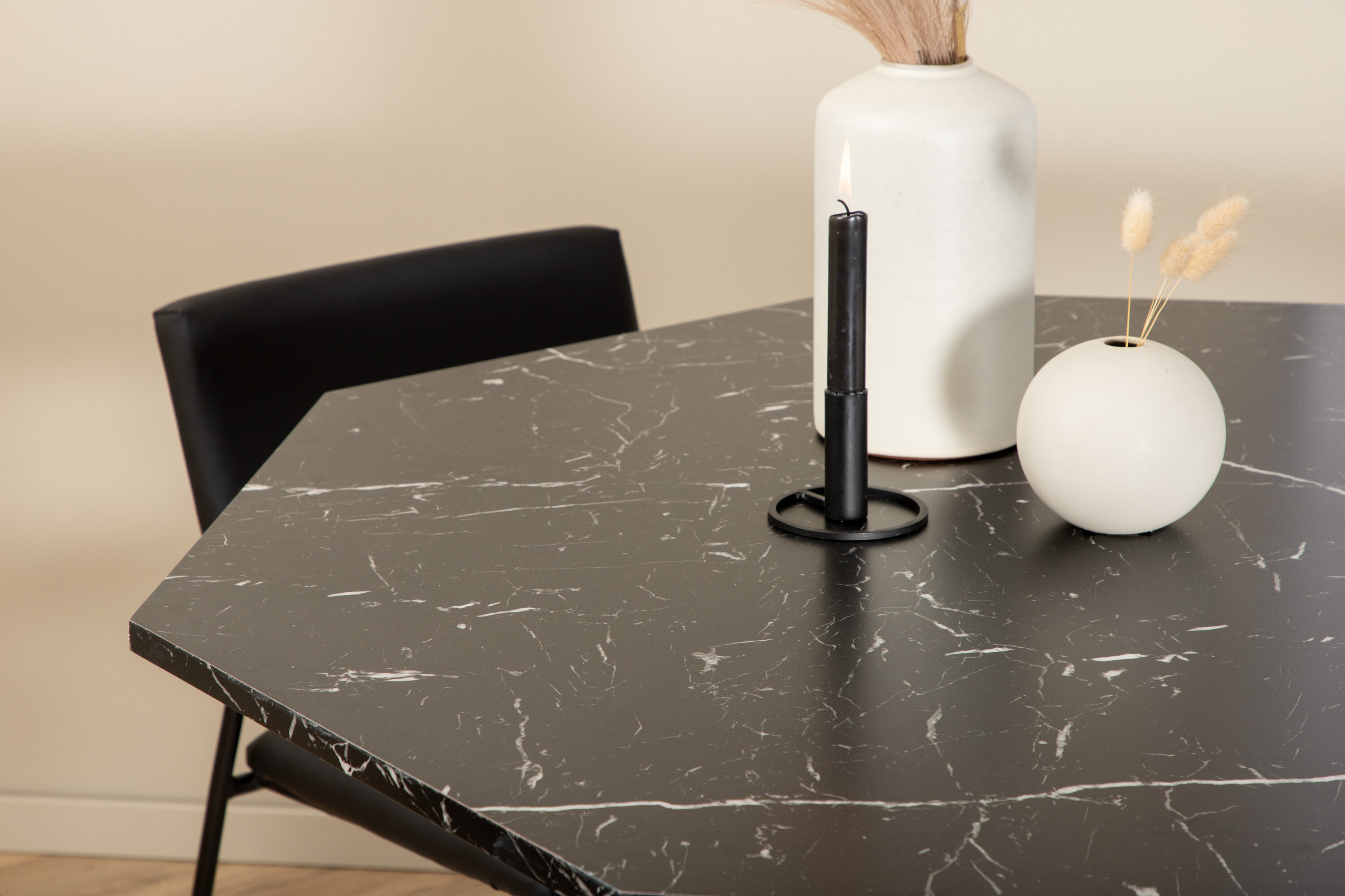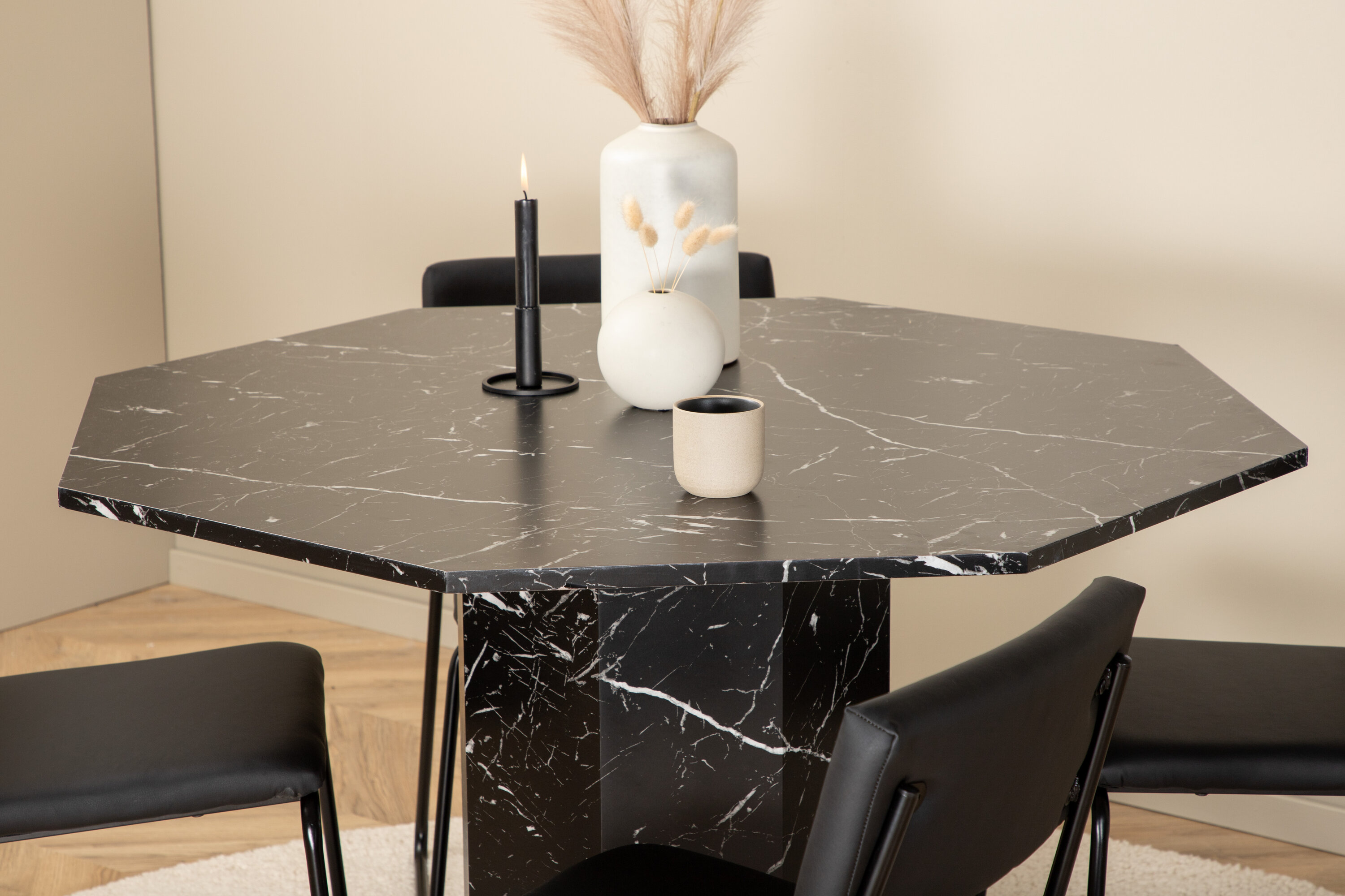 Kutsuv ja stiilne – Söögilaud Marbs loob teie kodus moeteadliku mulje! Laud on kaheksakandikujuline ja täielikult riietatud, mustast marmorklaasist pealisplaat täpilise valge mustriga ning lauajalg MDF-st ja marmorpaberist. Laua läbimõõt: läbimõõt: 110 cm, kõrgus: 75 cm. Siin sobib kokku 4 musta värvi Kenth söögitooli, millel on rauast toolijalad ja istmed on kunstnahast. Tooli mõõdud: kõrgus: 76 cm, istme kõrgus: 48,5 cm, laius: 40 cm, sügavus: 52 cm. Kaunistagu see pilkupüüdev toidugrupp kodu südant!
