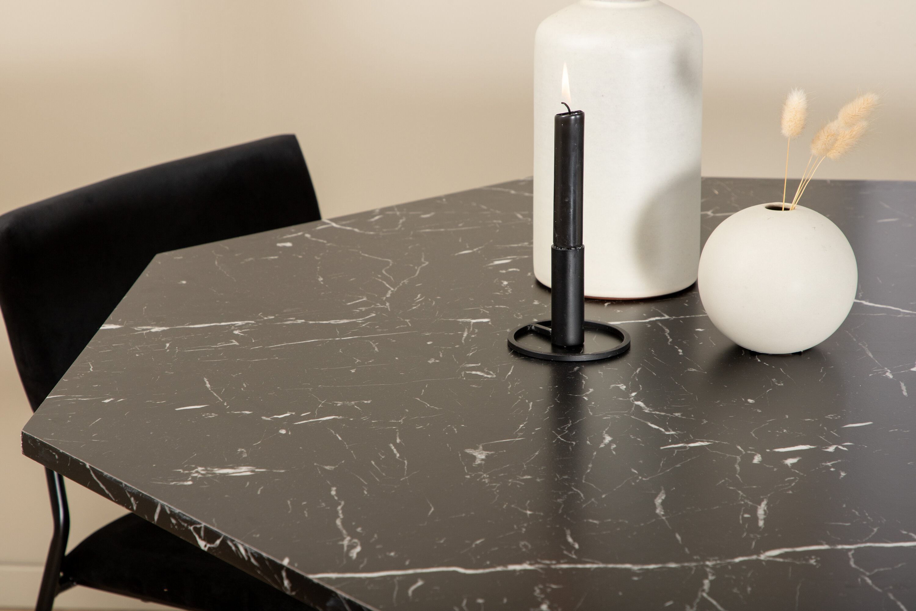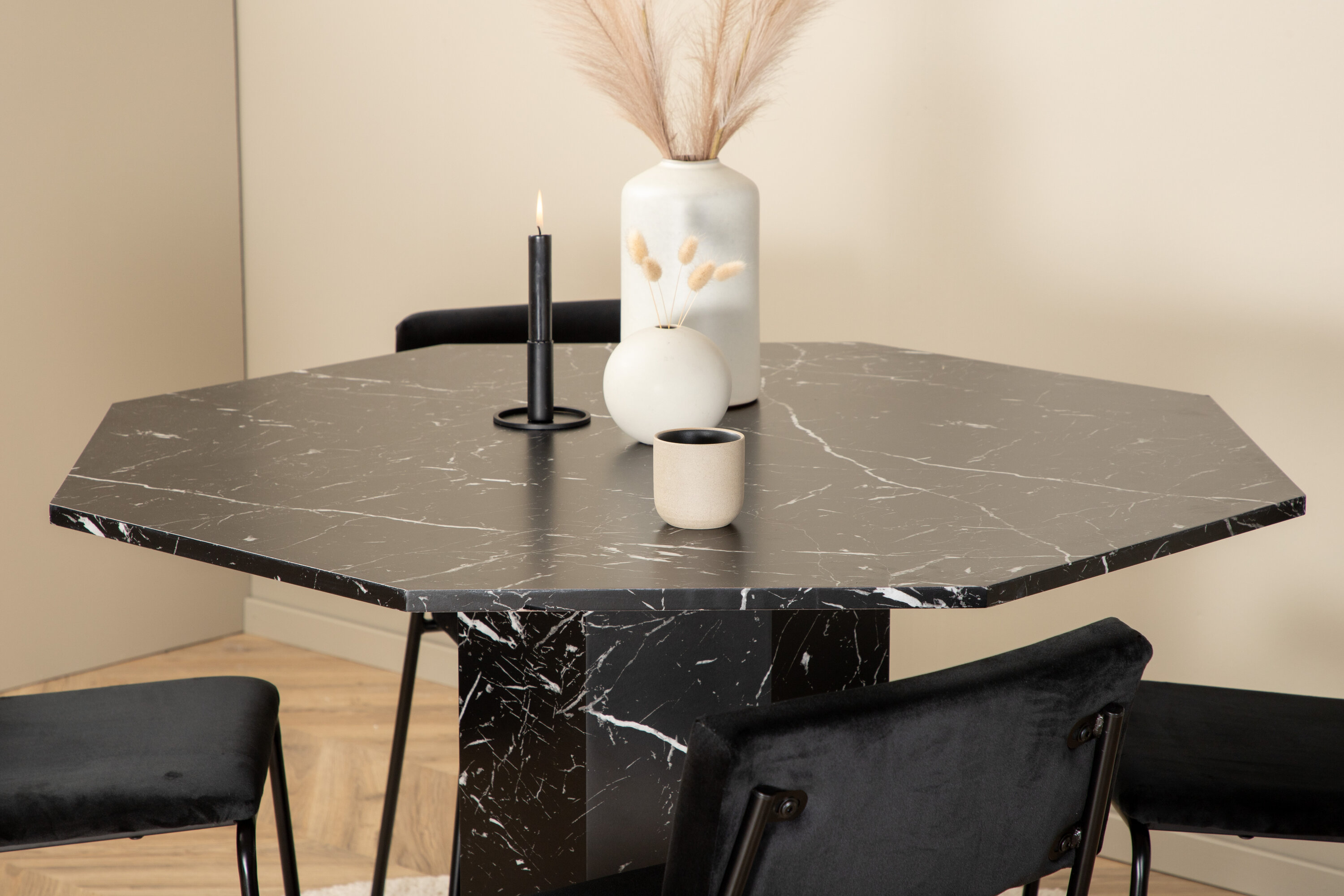 Kutsuv ja stiilne – Söögilaud Marbs loob teie kodus moeteadliku mulje! Laud on kaheksakandikujuline ja täielikult riietatud, mustast marmorklaasist pealisplaat täpilise valge mustriga ning lauajalg MDF-st ja marmorpaberist. Laua läbimõõt: läbimõõt: 110 cm, kõrgus: 75 cm. Siin sobib kokku 4 musta värvi Kenth söögitooli rauaga ja pehmest sametkangast istmed. Tooli mõõdud: kõrgus: 76 cm, istme kõrgus: 48,5 cm, laius: 40 cm, sügavus: 52 cm. Kaunistagu see pilkupüüdev toidugrupp kodu südant!