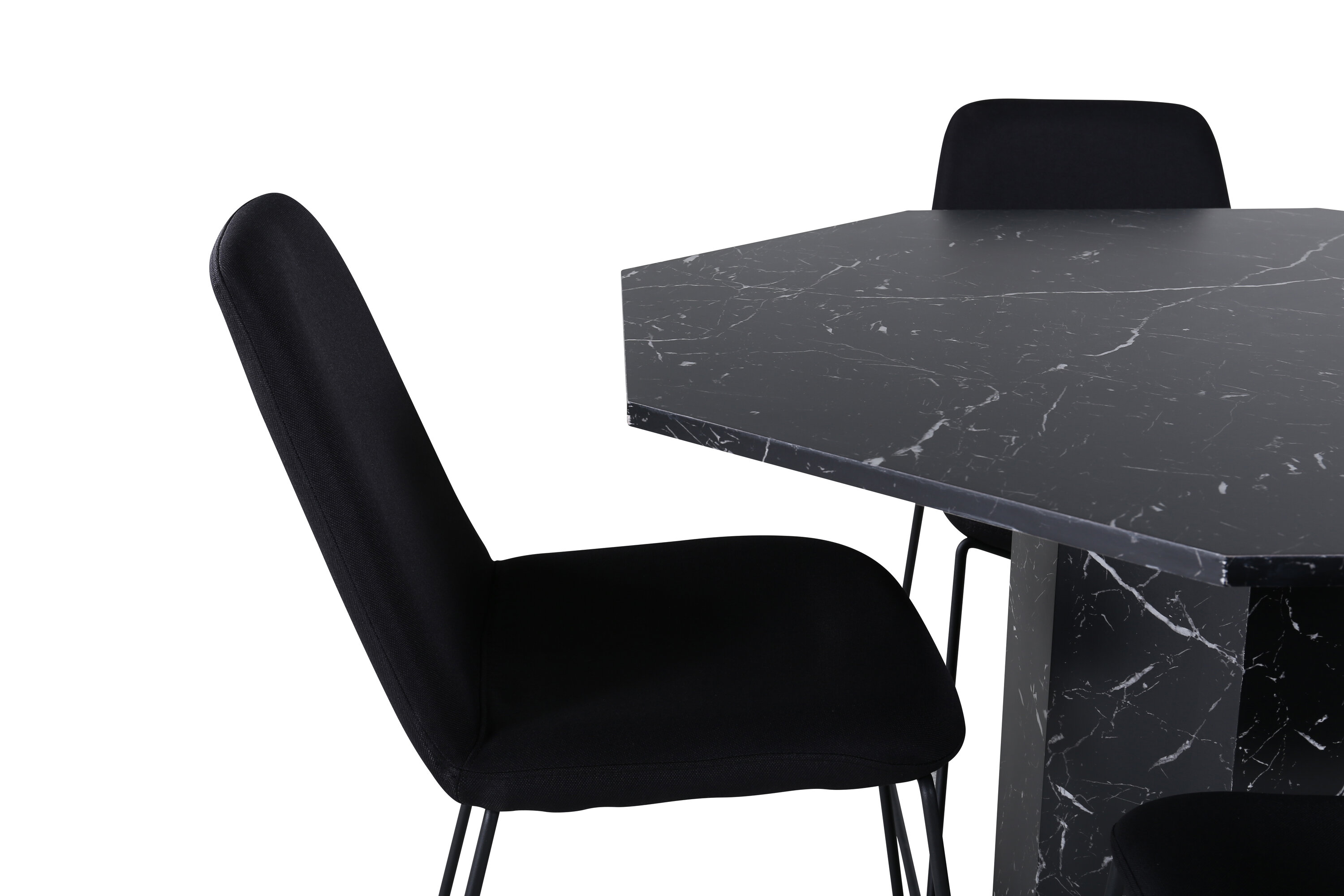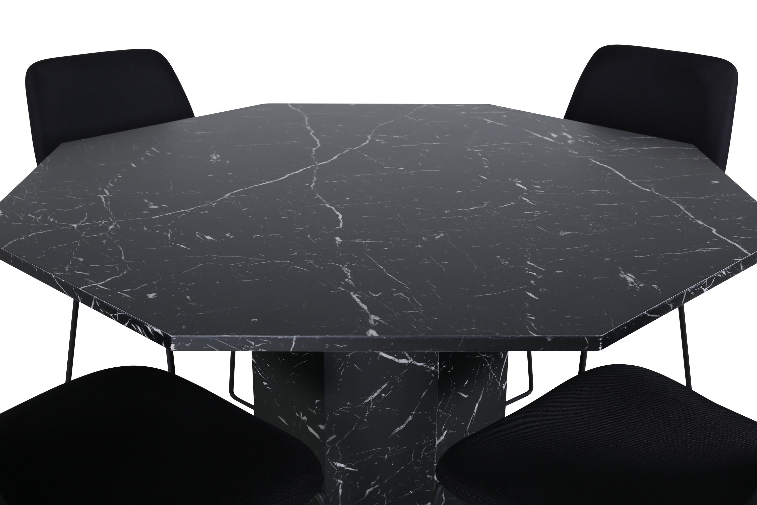 Tõstke sisekujunduse taset moodsa maitseka disainiga toidugrupiga! Söögilaud Marbs on kaheksakandikujuline ja täielikult riietatud disainiga, mille pealisplaat on mustast marmorklaasist täpilise valge mustriga ning lauajalg MDF-ist ja marmorpaberist. Laua läbimõõt: läbimõõt: 110 cm, kõrgus: 75 cm. Sobib 4 stiilse disainiga söögitooliga Muce. Toolijalad on kitsad metallist ja istmed mustast polüesterkangast. Tooli mõõdud: kõrgus: 84 cm, istme kõrgus: 47 cm, laius: 43 cm, sügavus: 63 cm. Sisusta elutuba pere toidugrupiga kaasaegse tunnetusega!