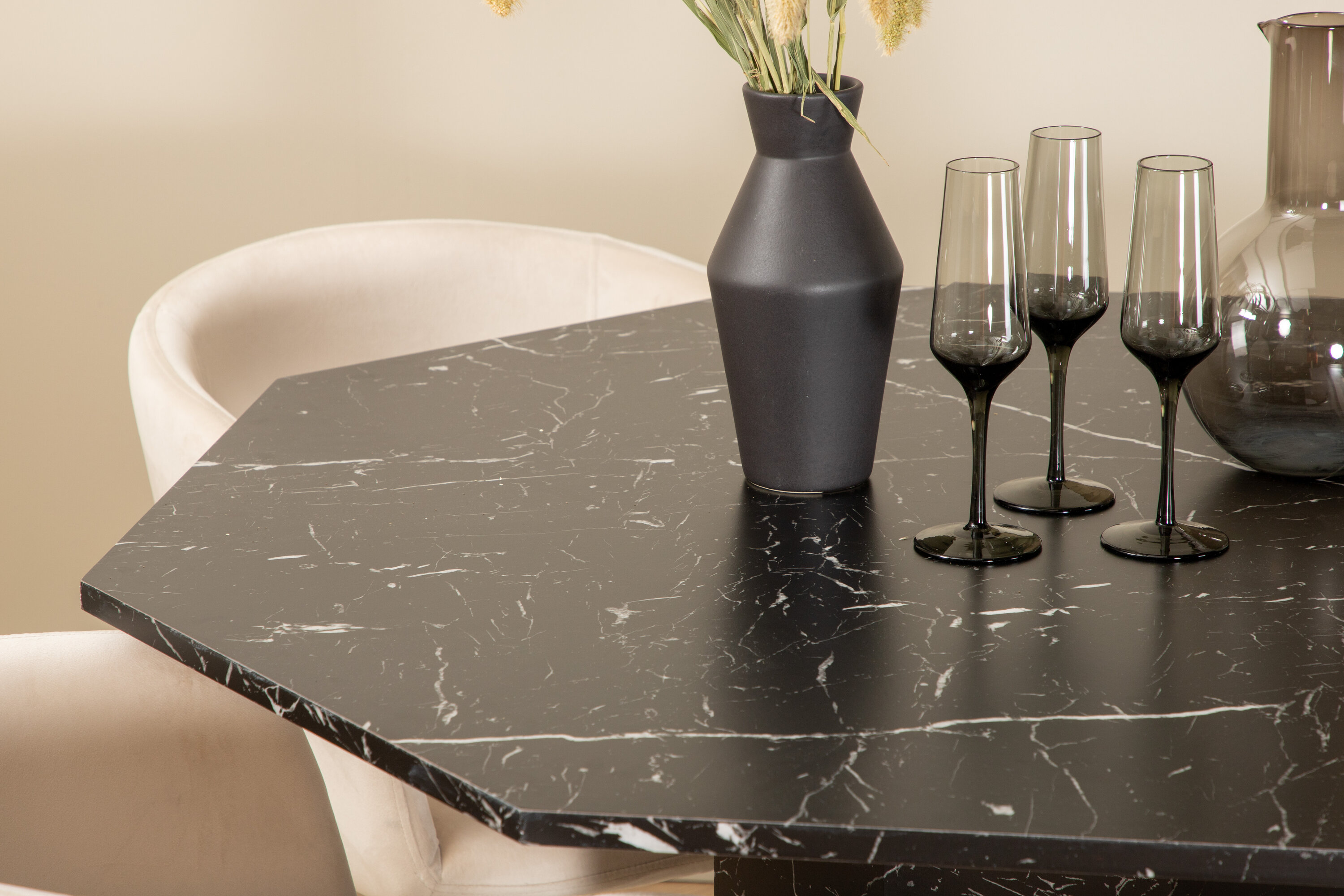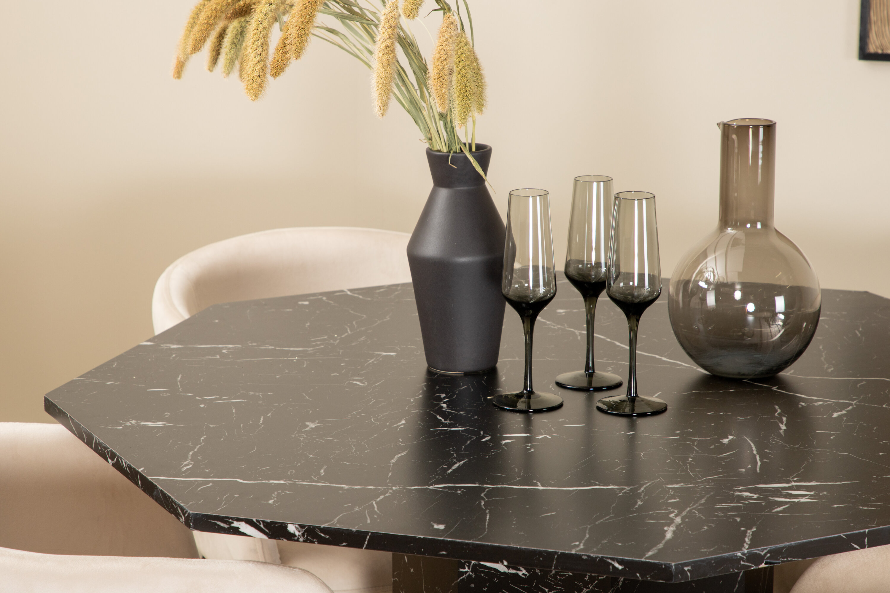 Istuge mugavalt meie Beriti sarja maitsvates söögitoolides ja nautige koos pikki eineid! Toolidel on sihvakas disain, kus on kutsuv beežist sametist iste ja mustast rauast toolijalad. Tooli mõõdud: kõrgus: 78 cm, istme kõrgus: 49 cm, laius: 55 cm, sügavus: 55 cm. 4 tooli sobivad siin meie populaarse söögilauaga Marbs. Laud on kaheksakandikujuline ja täielikult riietatud, mustast marmorklaasist pealisplaat täpilise valge mustriga ning lauajalg MDF-st ja marmorpaberist. Laua läbimõõt: läbimõõt: 110 cm, kõrgus: 75 cm.