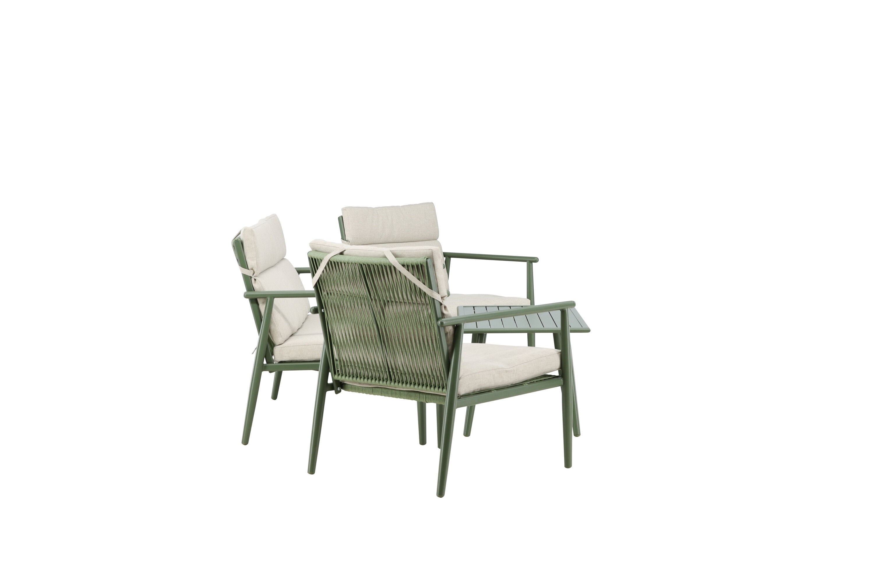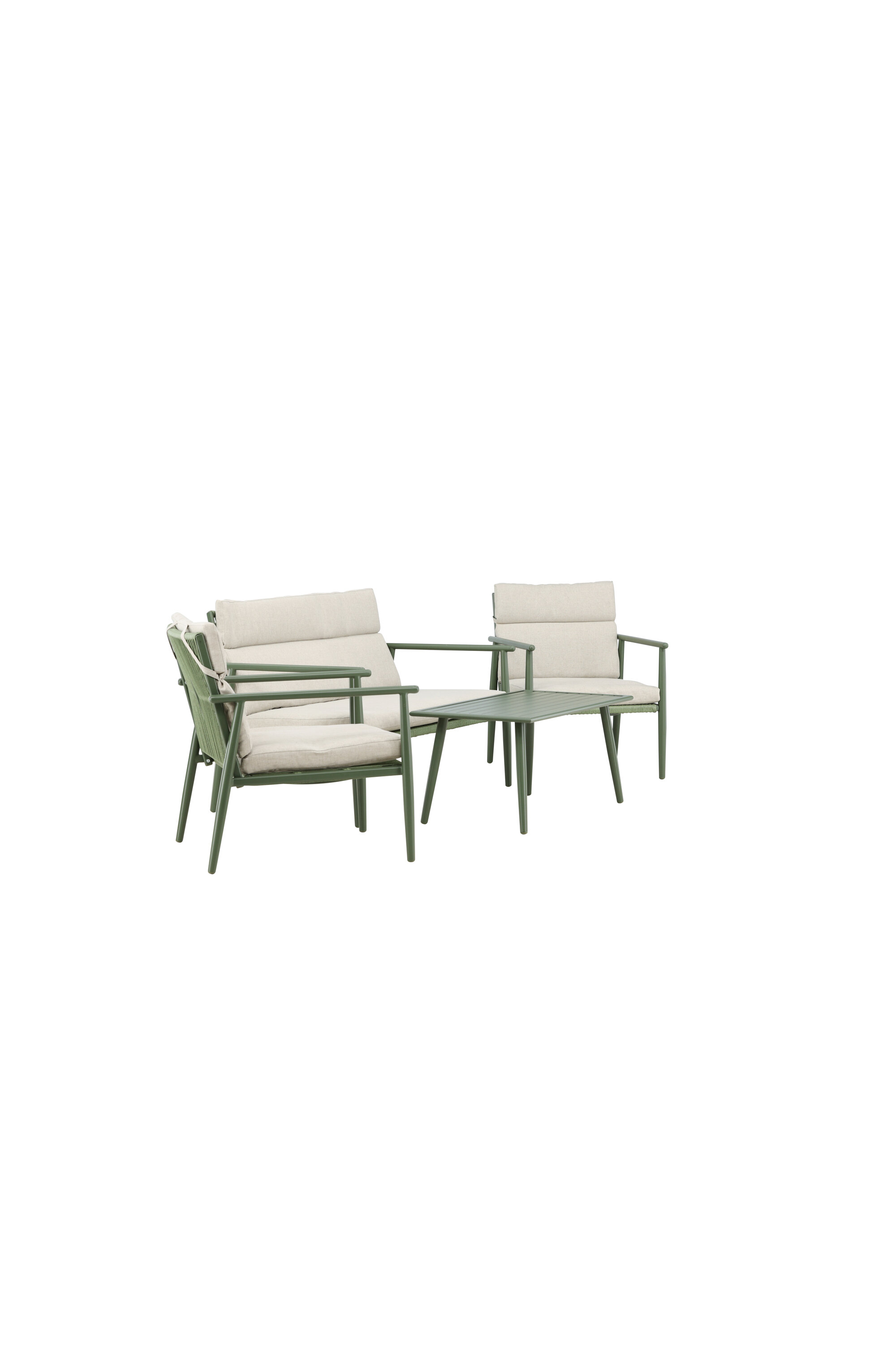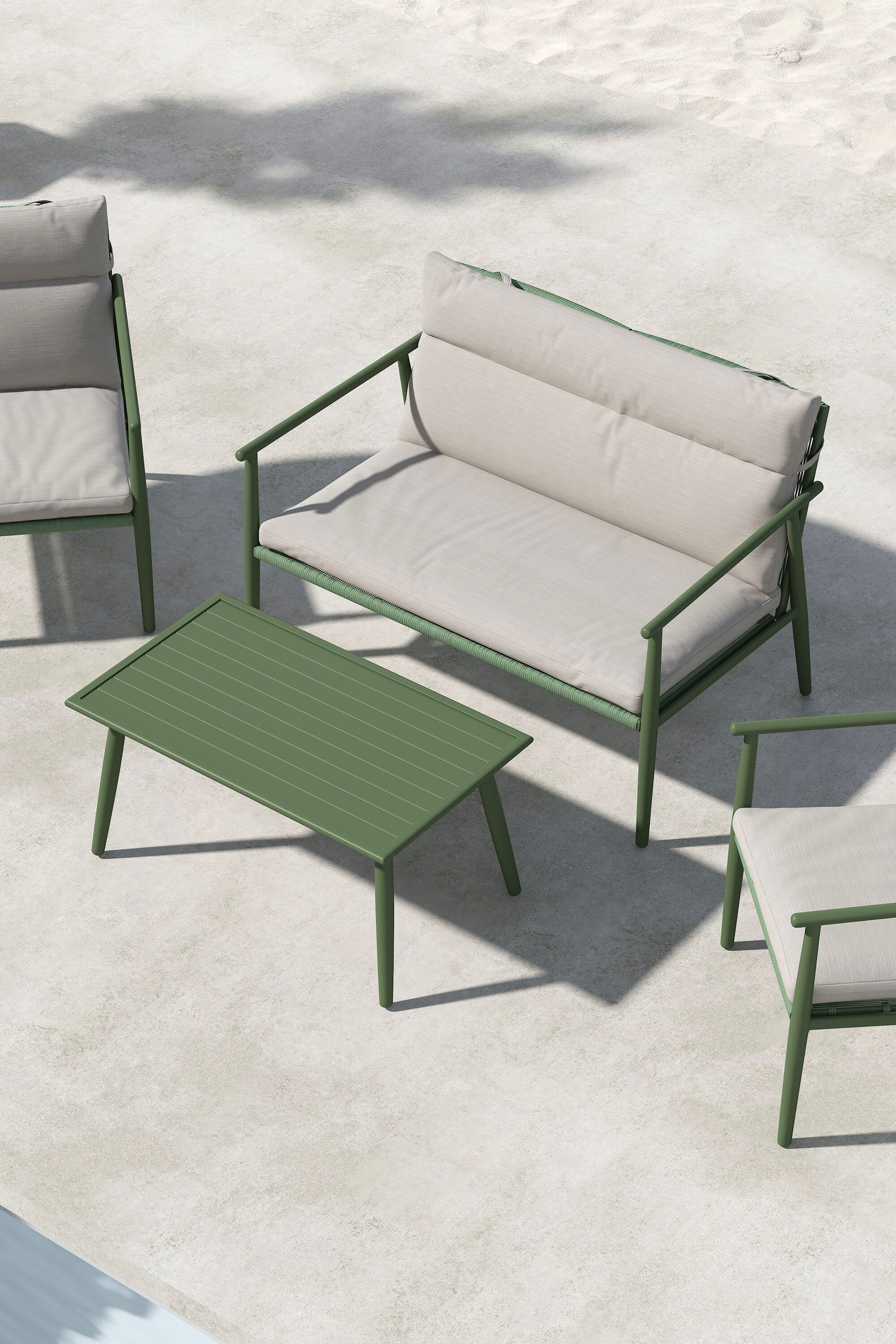 Polüesterkangast beežid padjad annavad rohelisele raamile pehme kontrasti ja täiustavad elegantset muljet. Mazzaro sobib ühtviisi hästi nii lõõgastavaks kohvipausiks kui ka pidulikeks sündmusteks suveõhtutel. See kompaktne komplekt sulandub hõlpsalt teie väliskeskkonda ja ühendab disaini funktsionaalsusega. Looge Mazzaro diivanikomplektiga kutsuv atmosfäär – kus elegants ja mugavus kohtuvad täiuslikus tasakaalus.