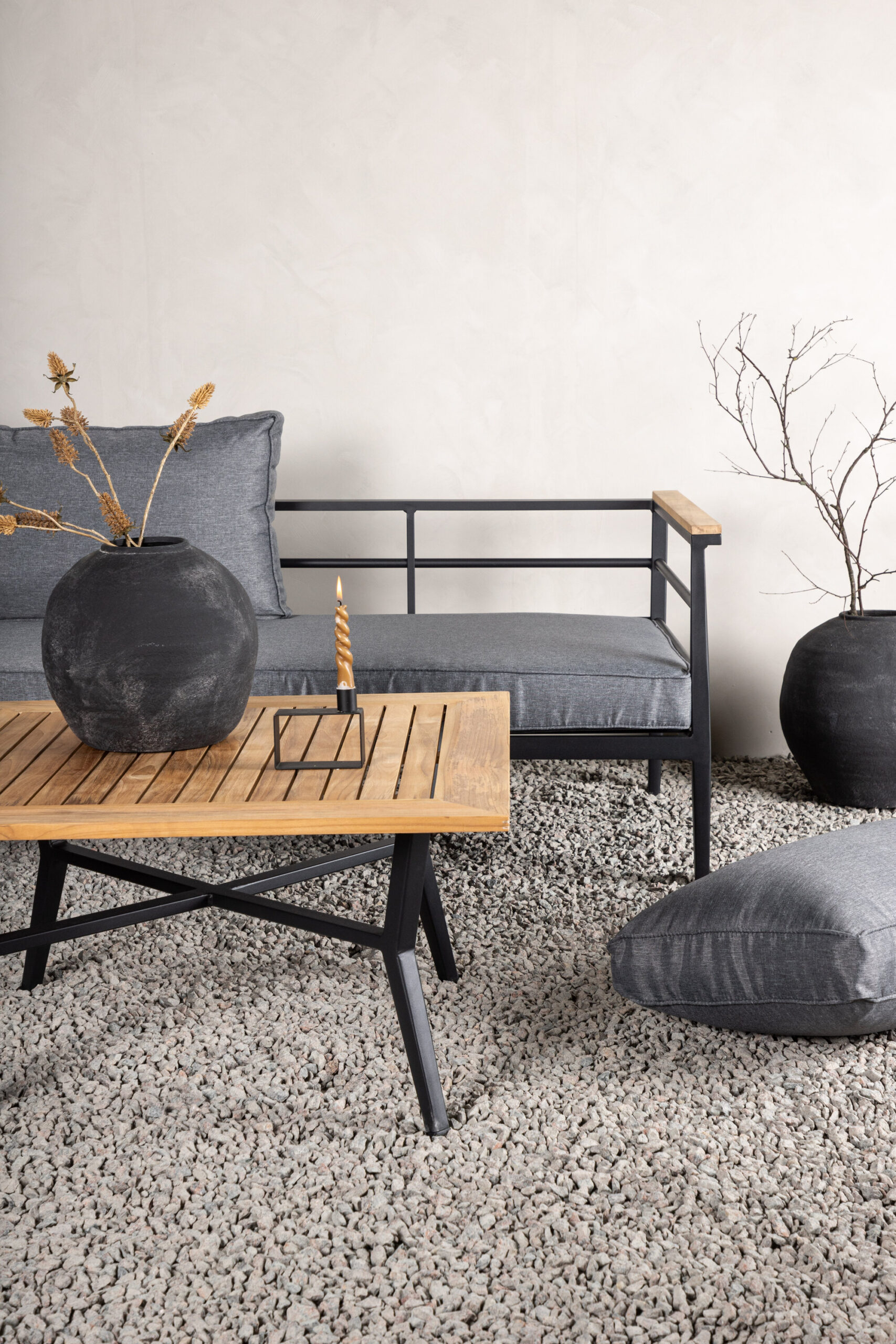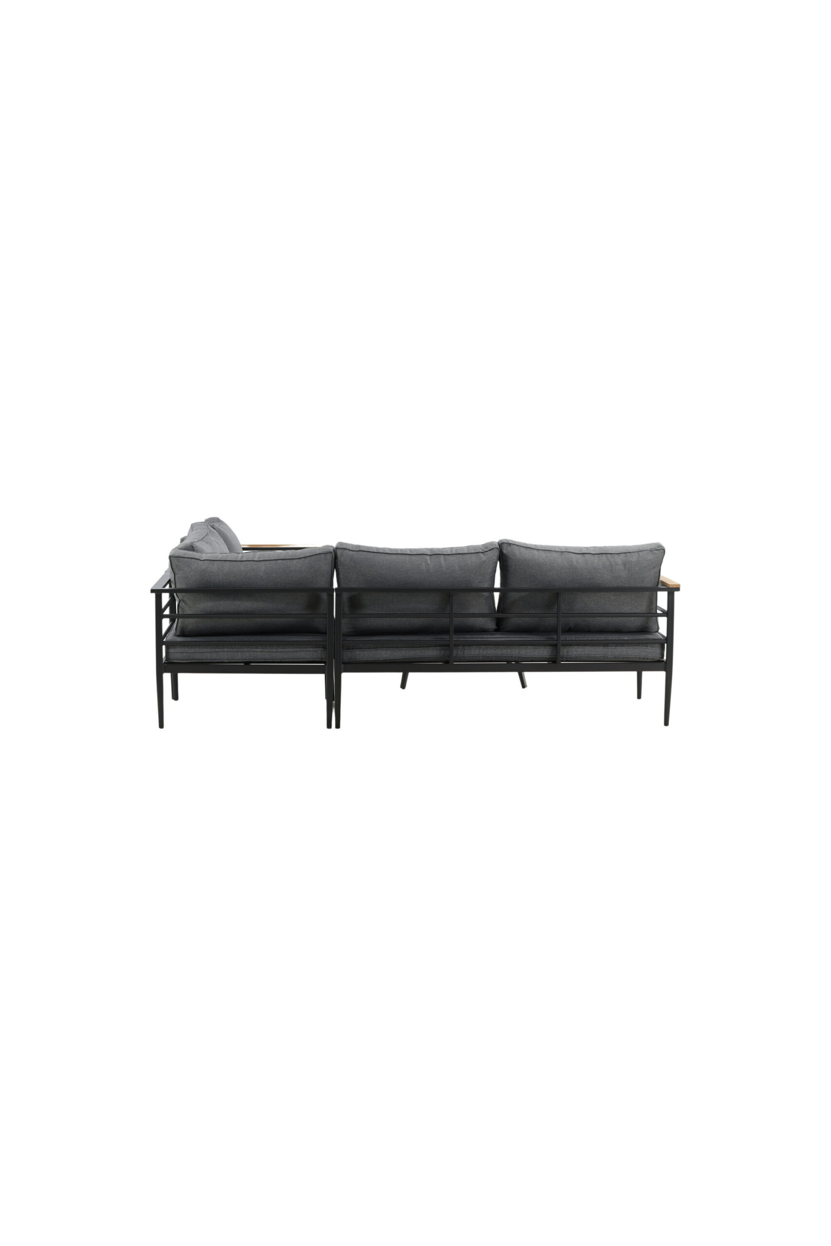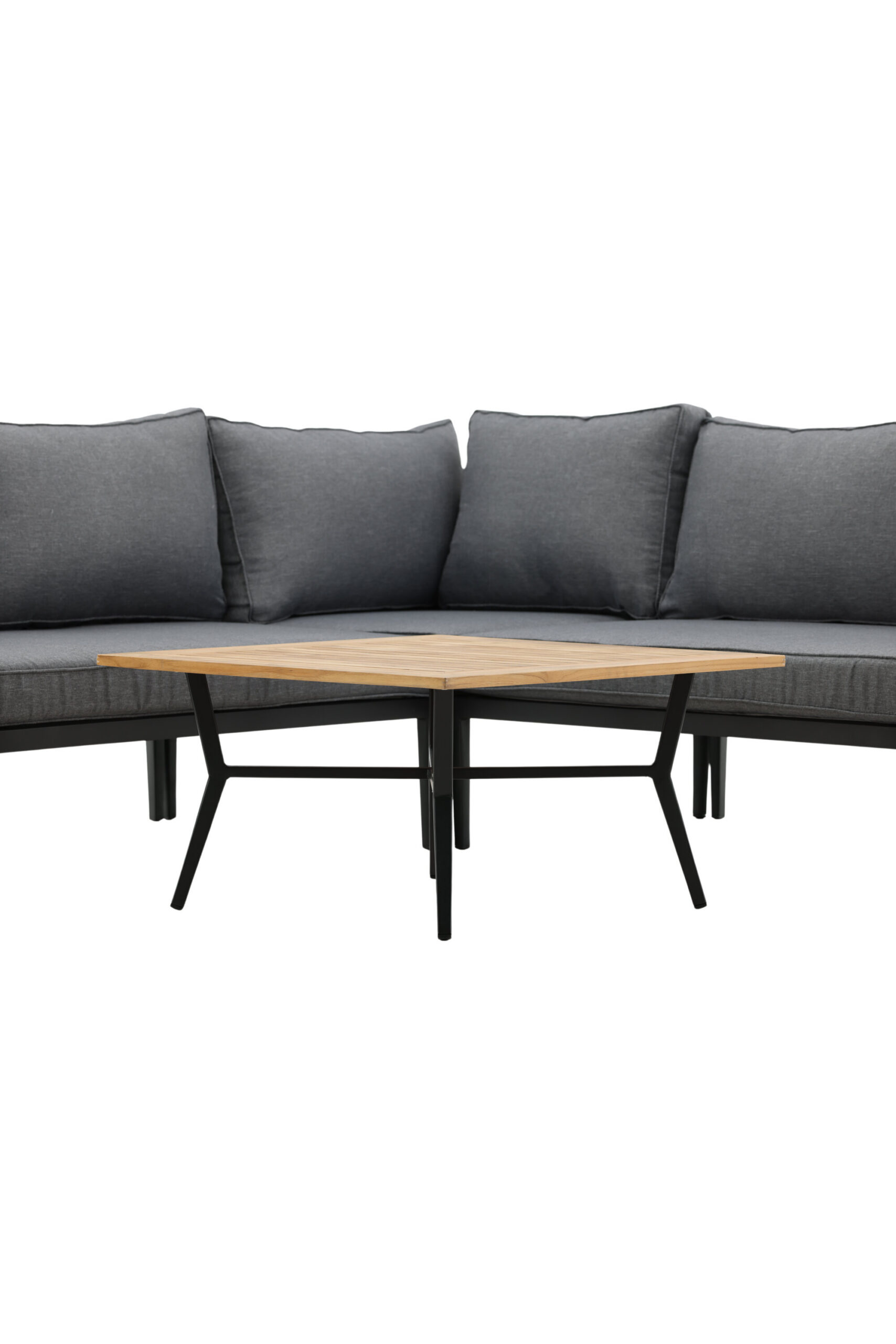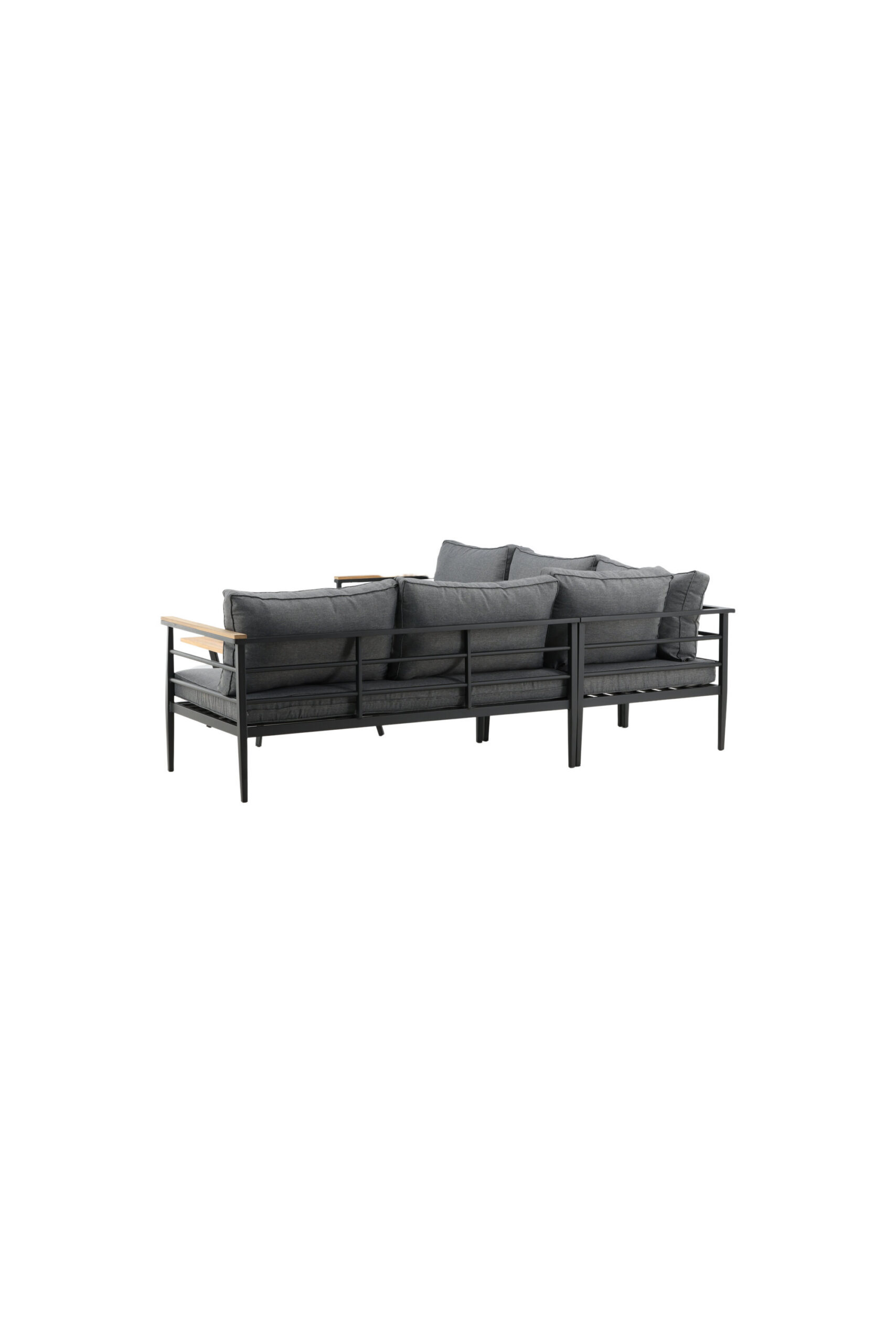 Moodne stiilne diivanirühm terrassile või rõdule. Musta pulbervärvitud metallraamiga nurgadiivaniga integreeritud tiikpuudetailidega käetugedega. Kaasa arvatud pehmed hallid padjad, madal kohvilaud musta pulbervärvitud metallist alusvankriga ja tiikpuust lauaplaat.