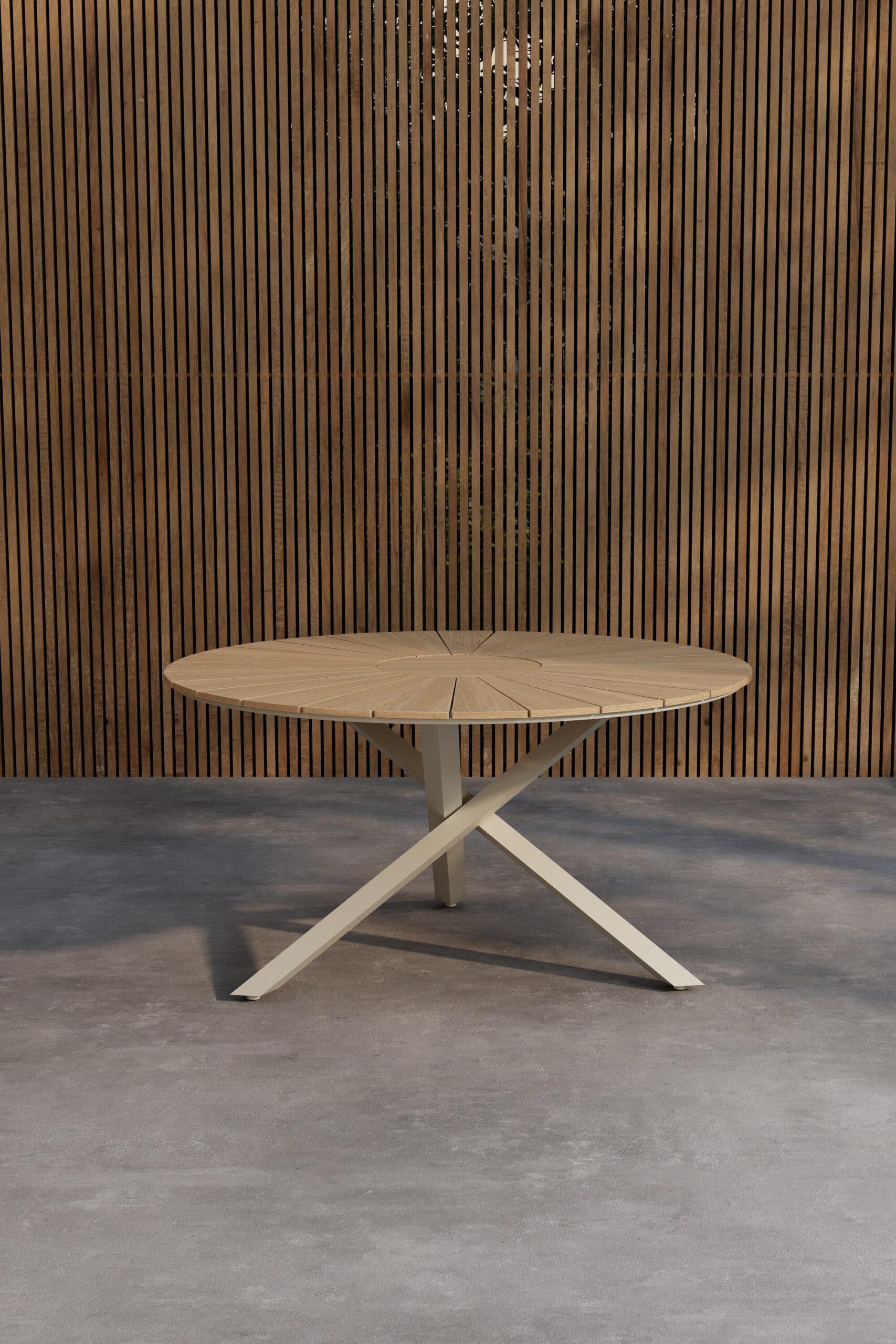 Söögilaud Mexico on elegantne ümarlaud, mis ühendab kaasaegse disaini looduslike materjalidega. Laual on beež alumiiniumraam ja kaunis tiikpuust lauaplaat, mille ventilaatorist inspireeritud muster lisab eksklusiivset hõngu. Tänu ümarale kujule muutub laud loomulikuks söögi- ja suhtlemiskohaks, tiikpuust pind aga toob soojust ja iseloomu. Mexico söögilaud on ideaalne valik neile, kes soovivad stiilset ja ajatut välisöögiruumi.