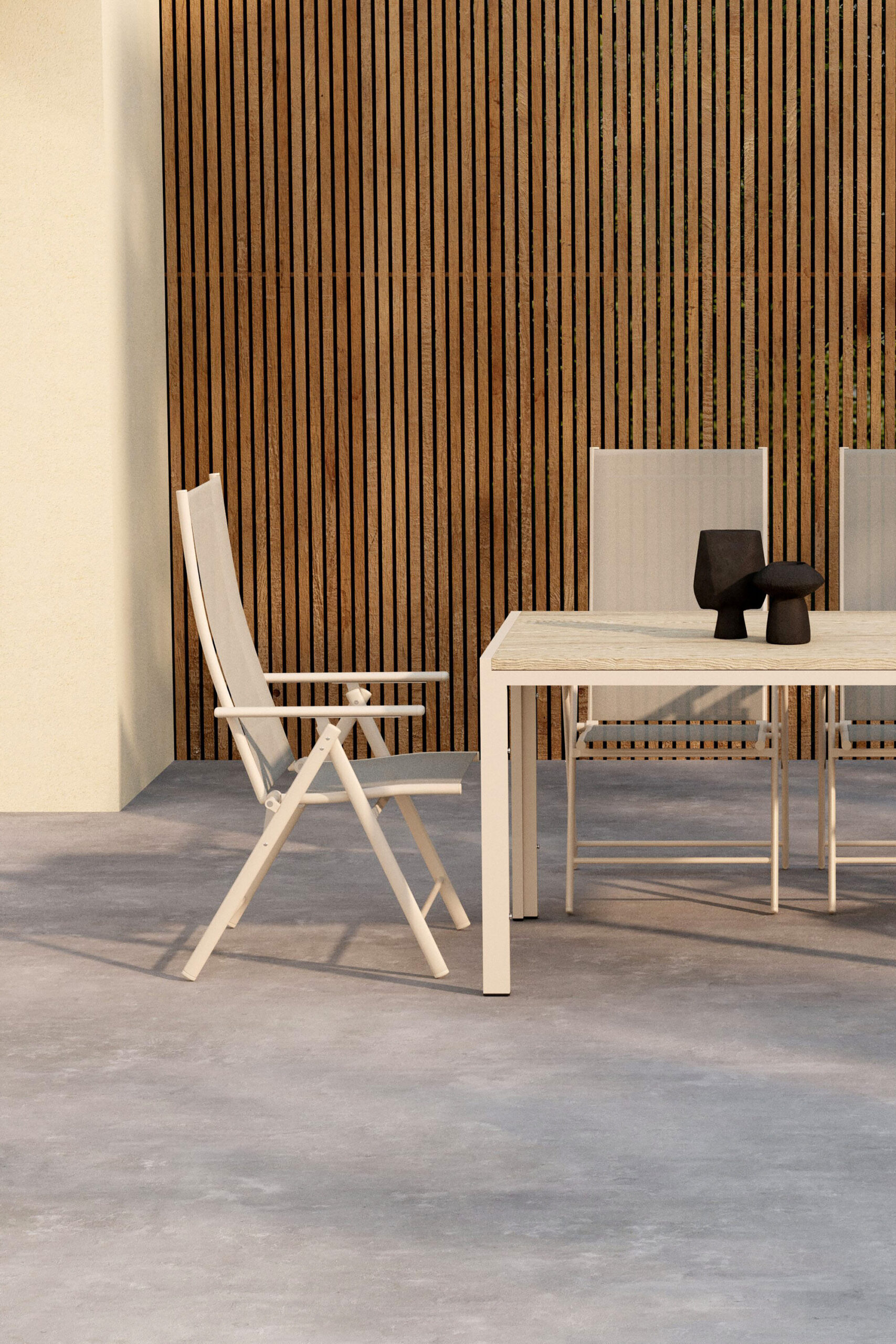 Levanzo söögitool on elegantne ja praktiline beežist terasest tool, mis pakub kaasaegset ja vastupidavat tunnet. Iste on kaetud vastupidava tekstiileeniga, mugava ja ilmastikukindla materjaliga, mida on lihtne hooldada. Lisaks on tool kokkupandav, mistõttu on seda lihtne hoida ja vajadusel välja tuua. Reguleeritav seljatugi pakub täiendavat paindlikkust ja mugavust, mis sobib suurepäraselt nii pikkadeks õhtusöökideks kui ka lõõgastavateks hetkedeks õues.