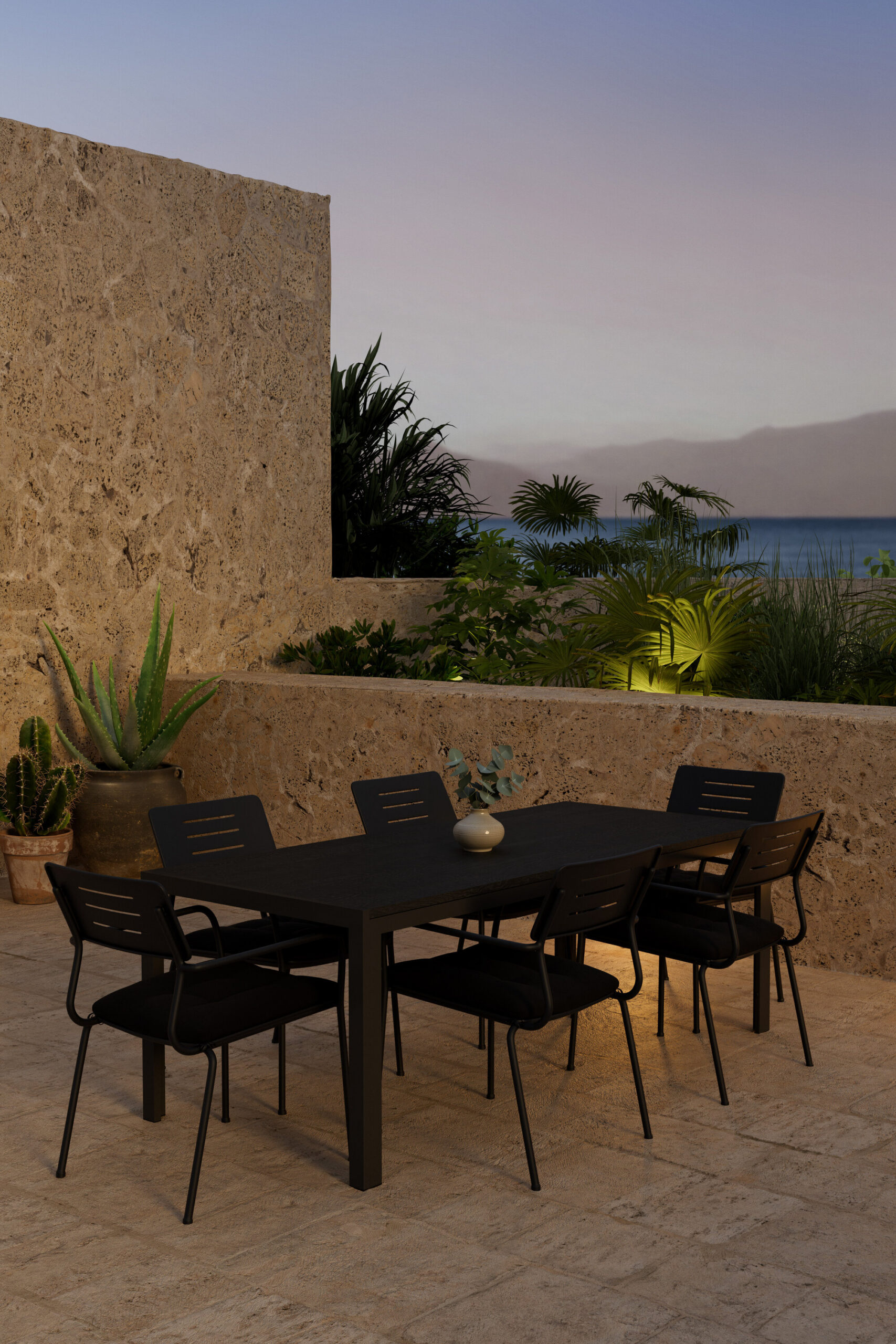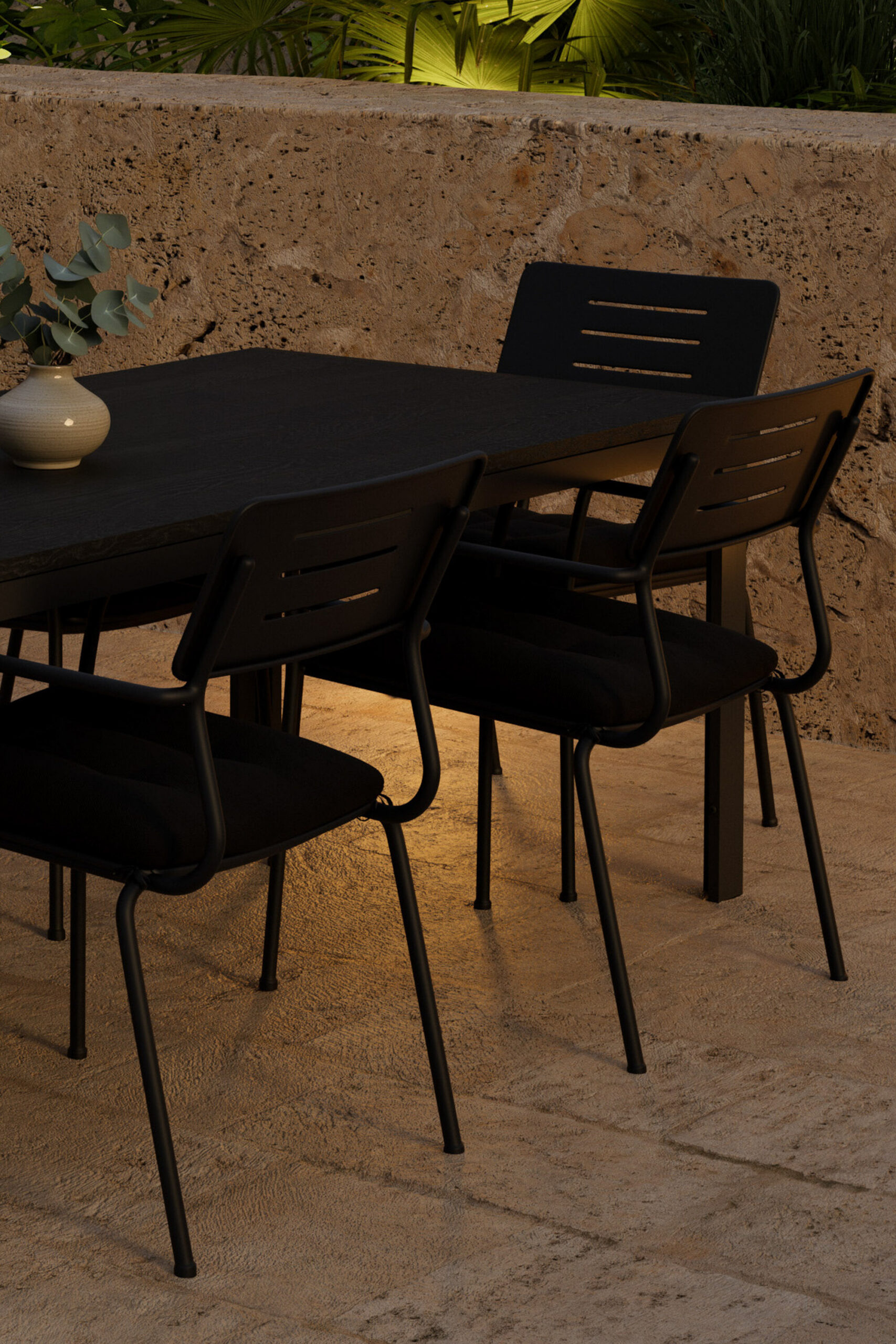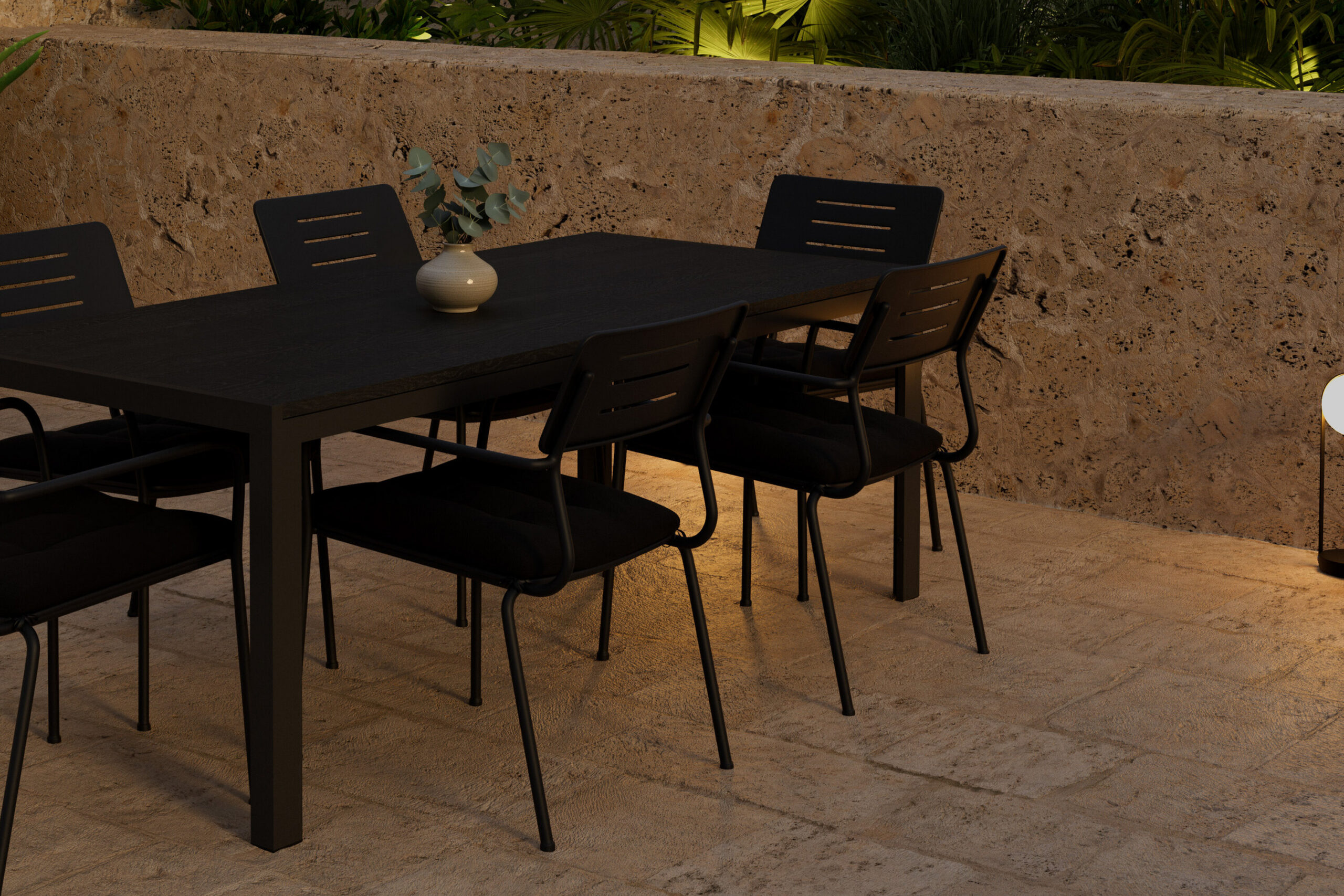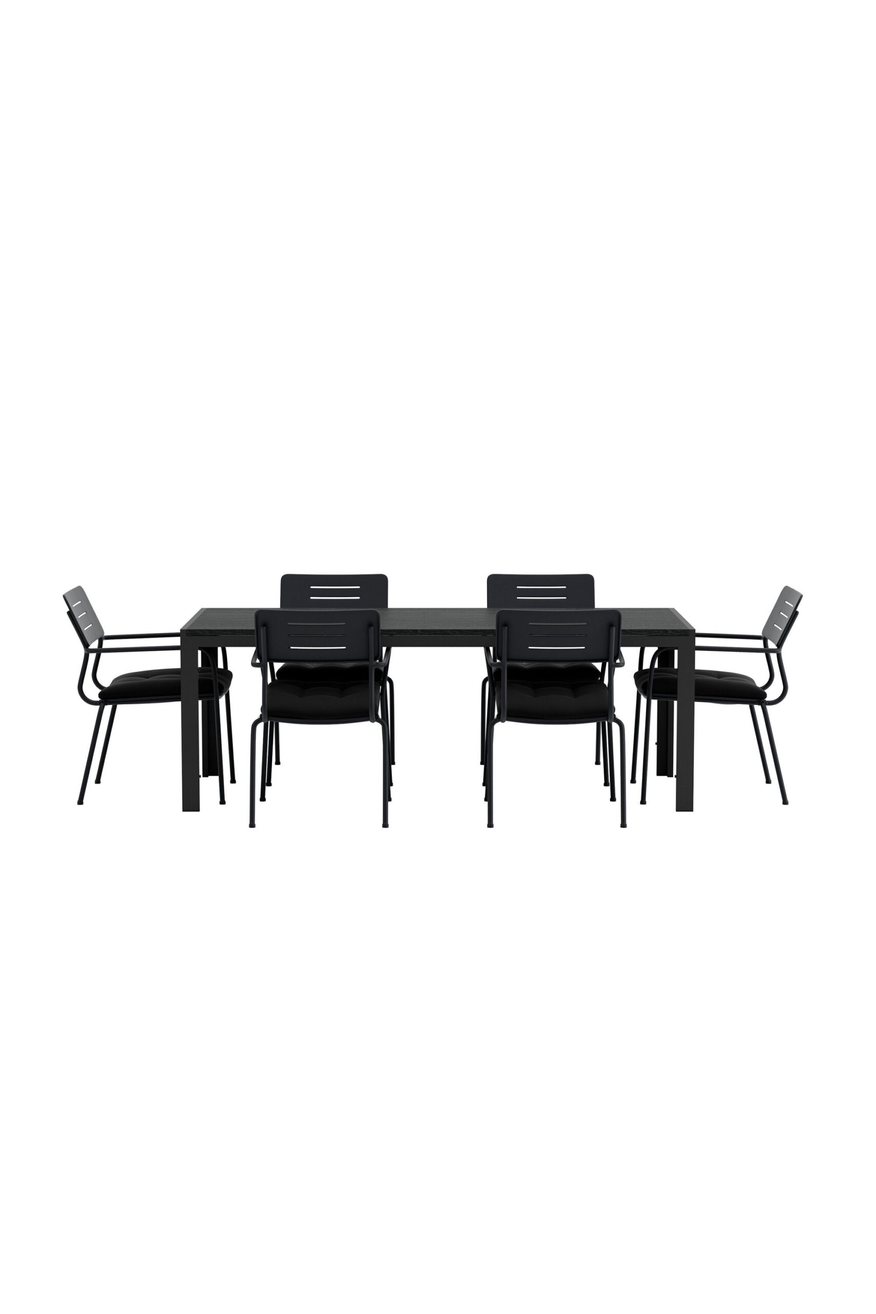 Looge stiilne ja kutsuv õueala selle elegantse söögikomplektiga, mis ühendab endas moodsa Mirko laua kuue virnastatava Nicke tooliga – see sobib suurepäraselt suvisteks einestamisteks ja seltskondlikeks hetkedeks õues. Nicke tool on klanitud ja lihtne mustast terasest tool, mis töötab nii terrassil kui ka päikesetoas. Selle õhuke ja hõlpsasti paigutatav disain muudab toolide paigutamise lihtsaks ja neid saab mugavalt virna panna, kui neid ei kasutata. Ideaalne siduda moodsa söögilauaga harmoonilise ja funktsionaalse välikeskkonna loomiseks. Mirko laud on ideaalne valik igasse väliruumi. Elegantse musta värvi ja ristkülikukujulise kujuga laud loob teie terrassile kaasaegse ja värske tunde. Roostekindel alumiiniumraam muudab selle nii stabiilseks kui ka kergeks, samas kui polüpuidust lauaplaat lisab loomulikku ja sooja iseloomu. Avar suurus annab piisavalt ruumi kogu seltskonnale – ideaalne nii einetamiseks kui ka mõnusaks koosviibimiseks.